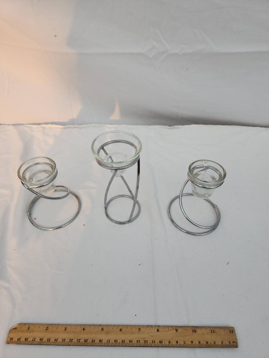 Three modern candle holders with a chrome-like metal spiral design. Each features a removable clear glass insert to accommodate candles. The sizes vary, creating a tiered presentation. Suitable for different candle sizes. The largest holder has a height of approximately 8 inches. Functional condition appears intact with minimal signs of wear.