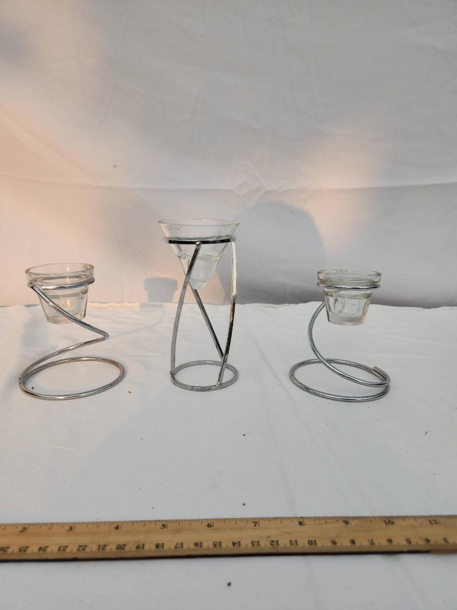 Three Modern Metal Spiral Candle Holders With Glass Inserts