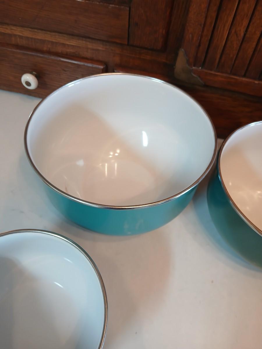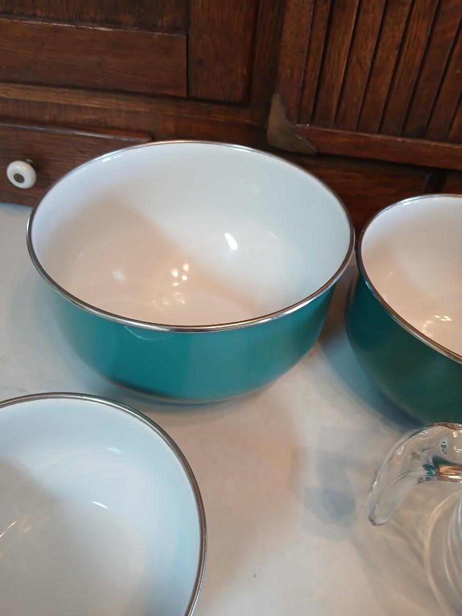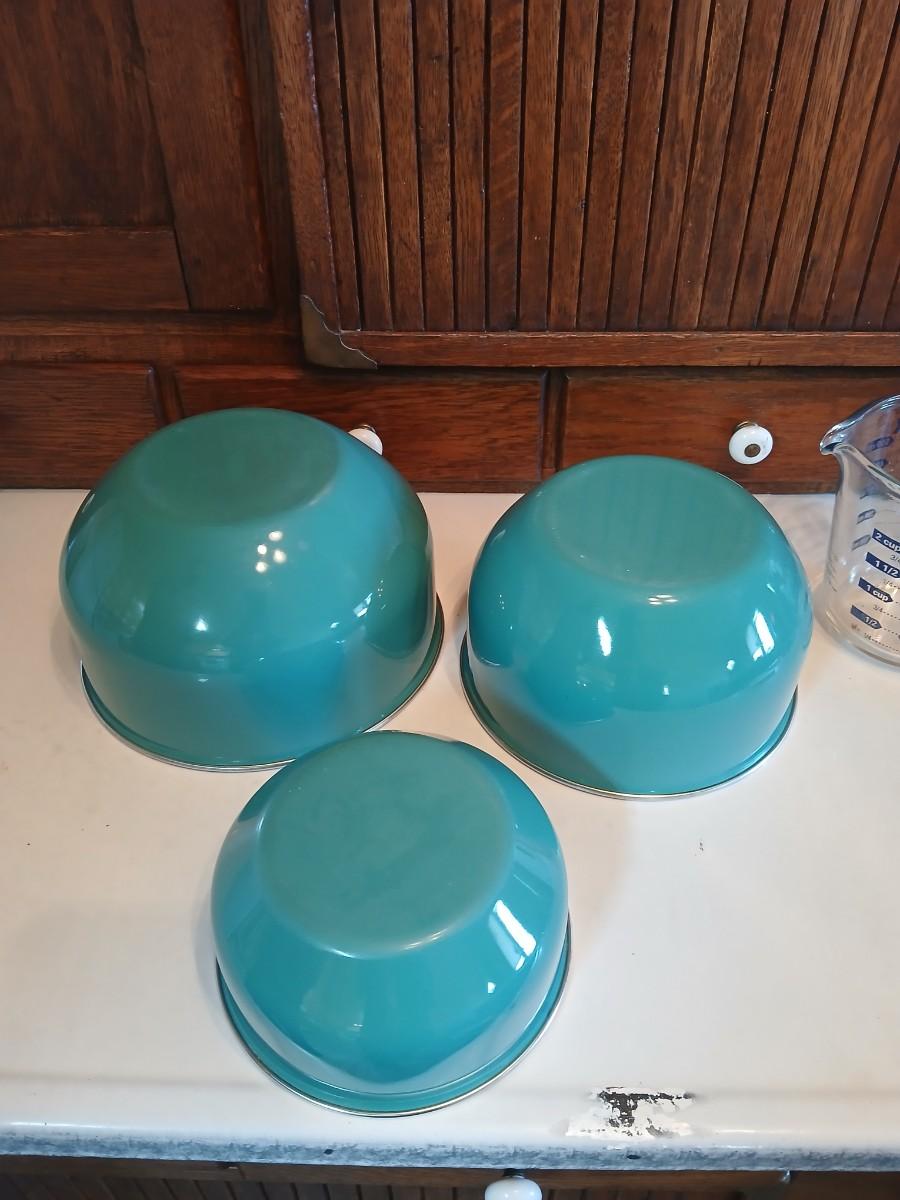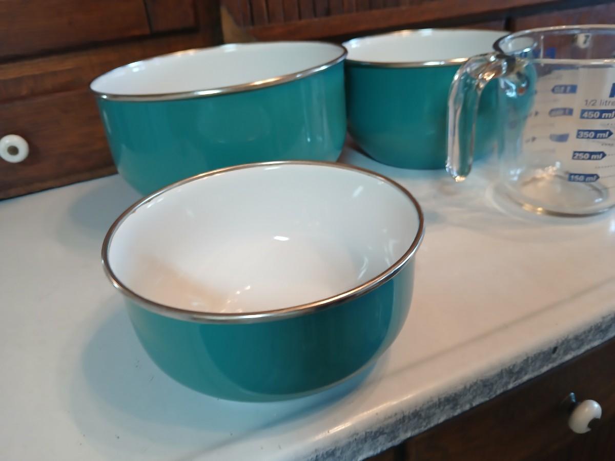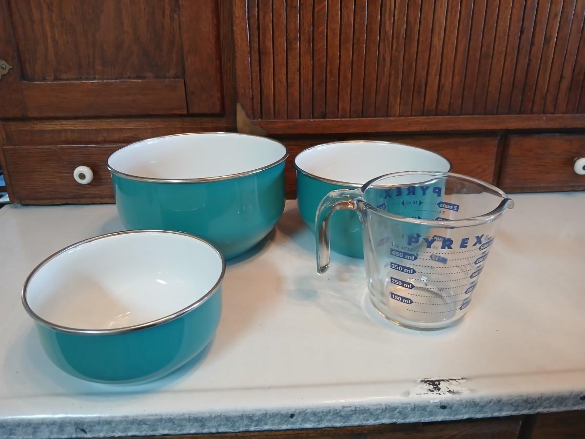 Three nesting enamel mixing bowls and a glass Pyrex measuring cup