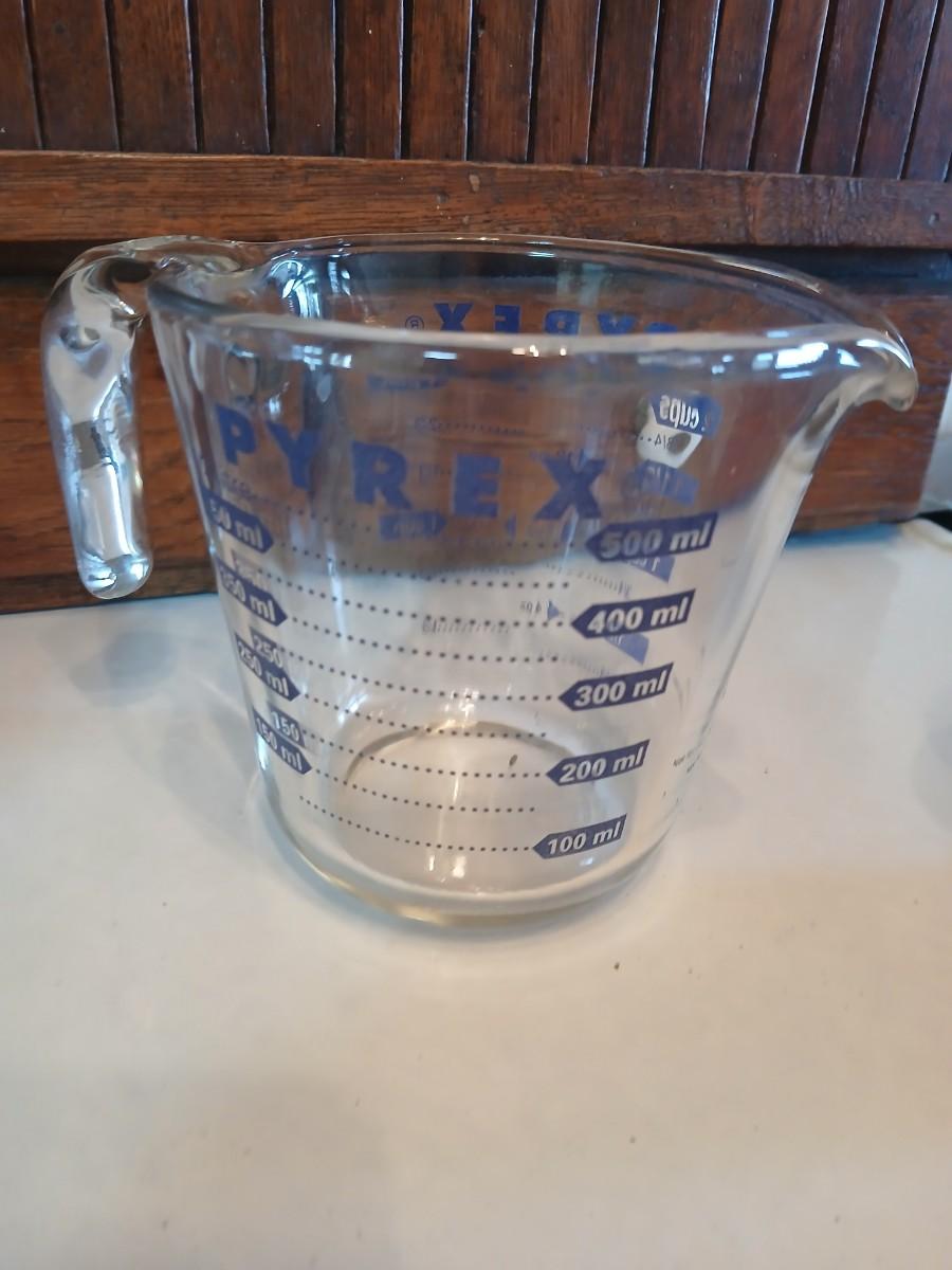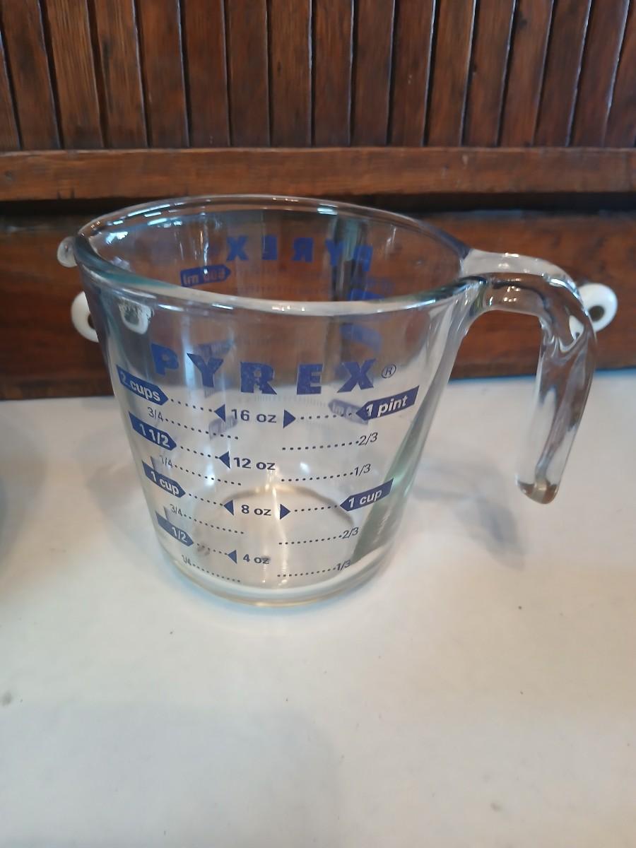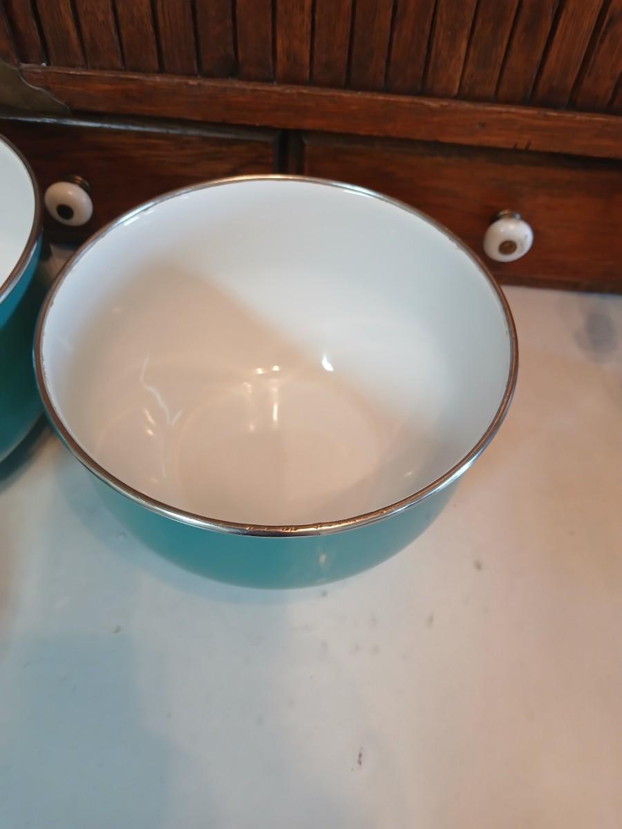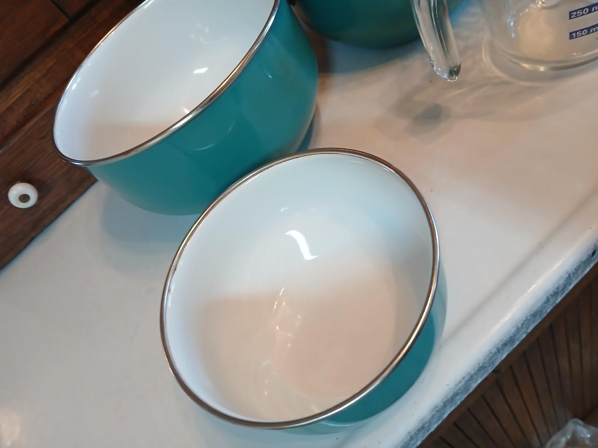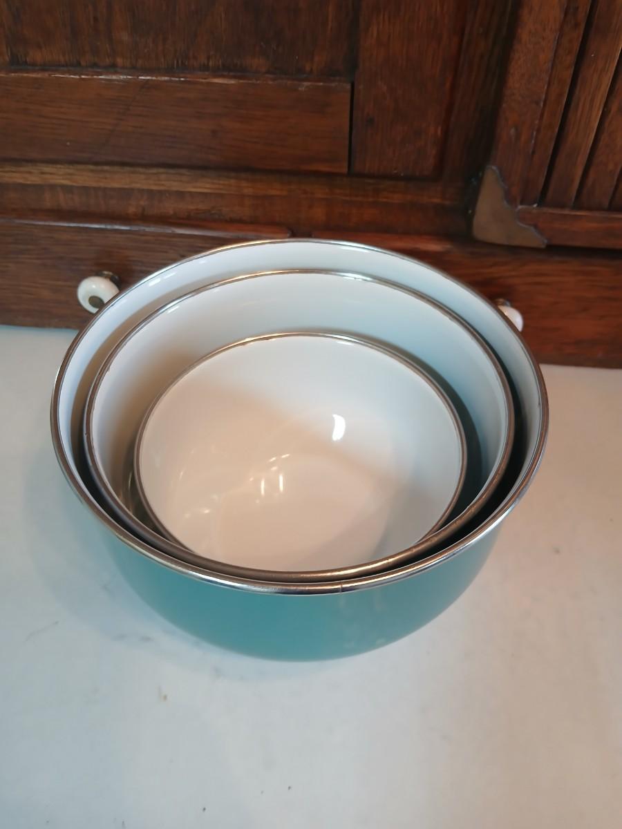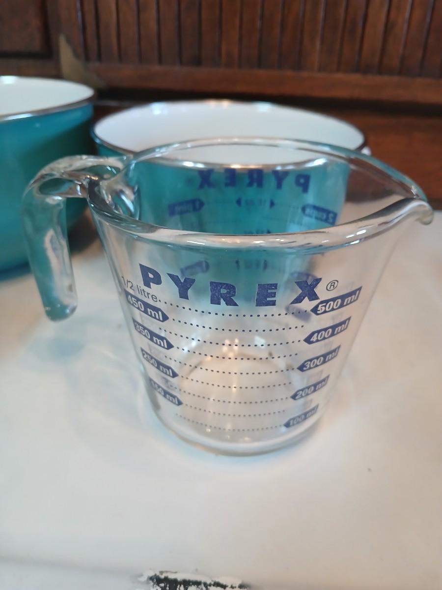 Three nesting enamel mixing bowls and a glass Pyrex measuring cup