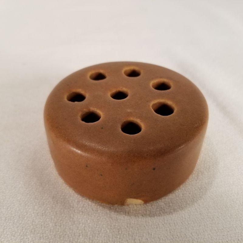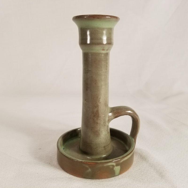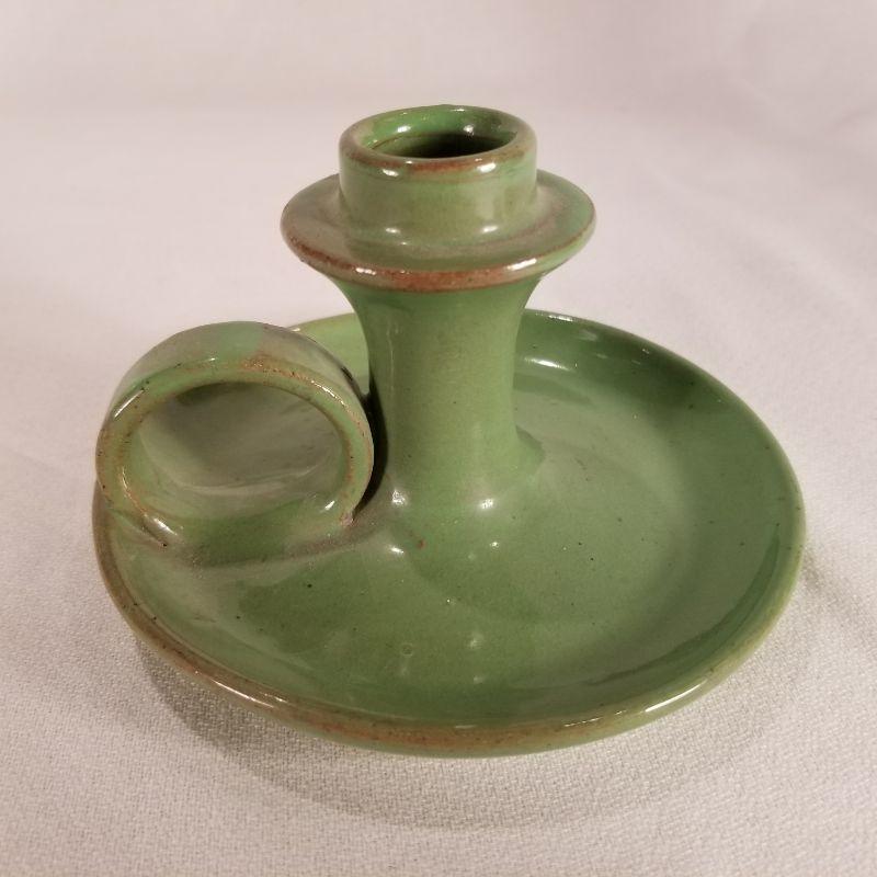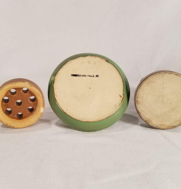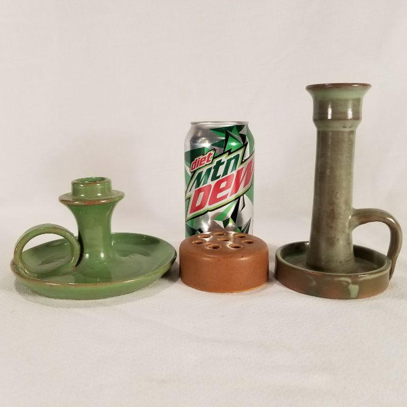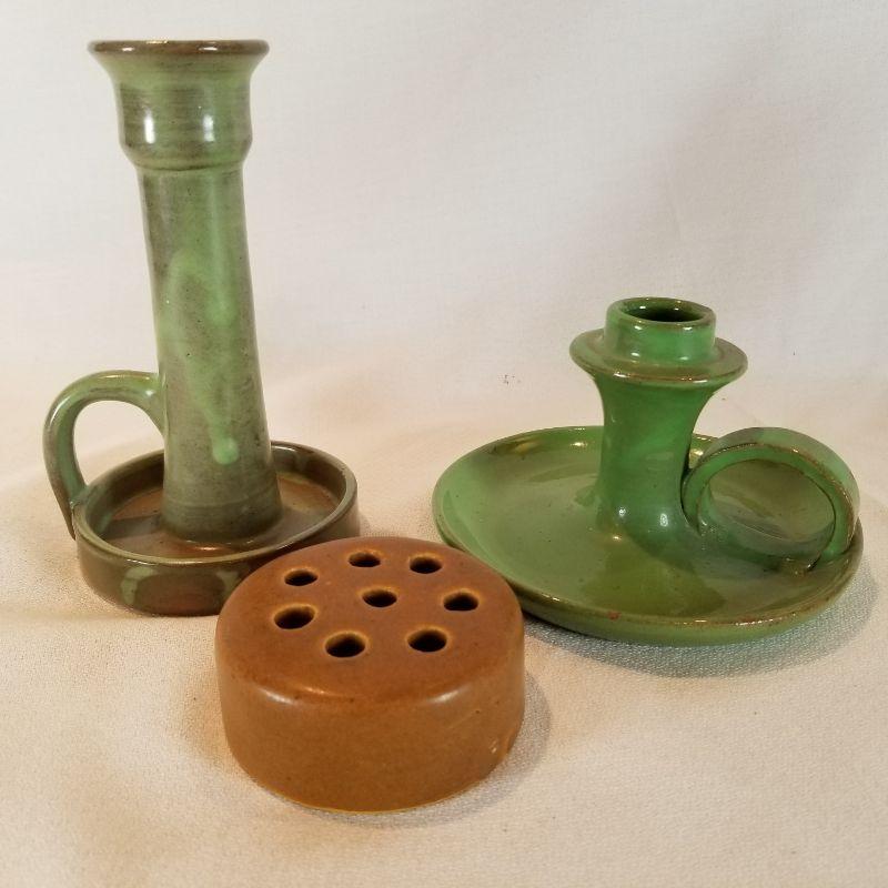 Two are handled candle stick holders the other is a flower frog which has a chip at the bottom. The candle stick holders are in perfect condition. One is marked Cumberland Falls, KY. but was most likely made in Louisville for the tourist trade by the Cherokee Pottery Company.