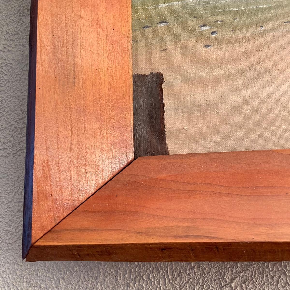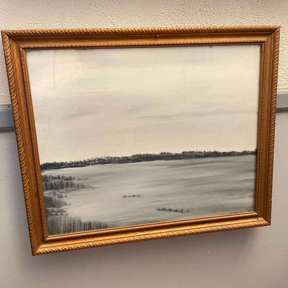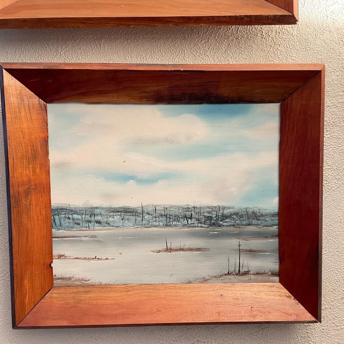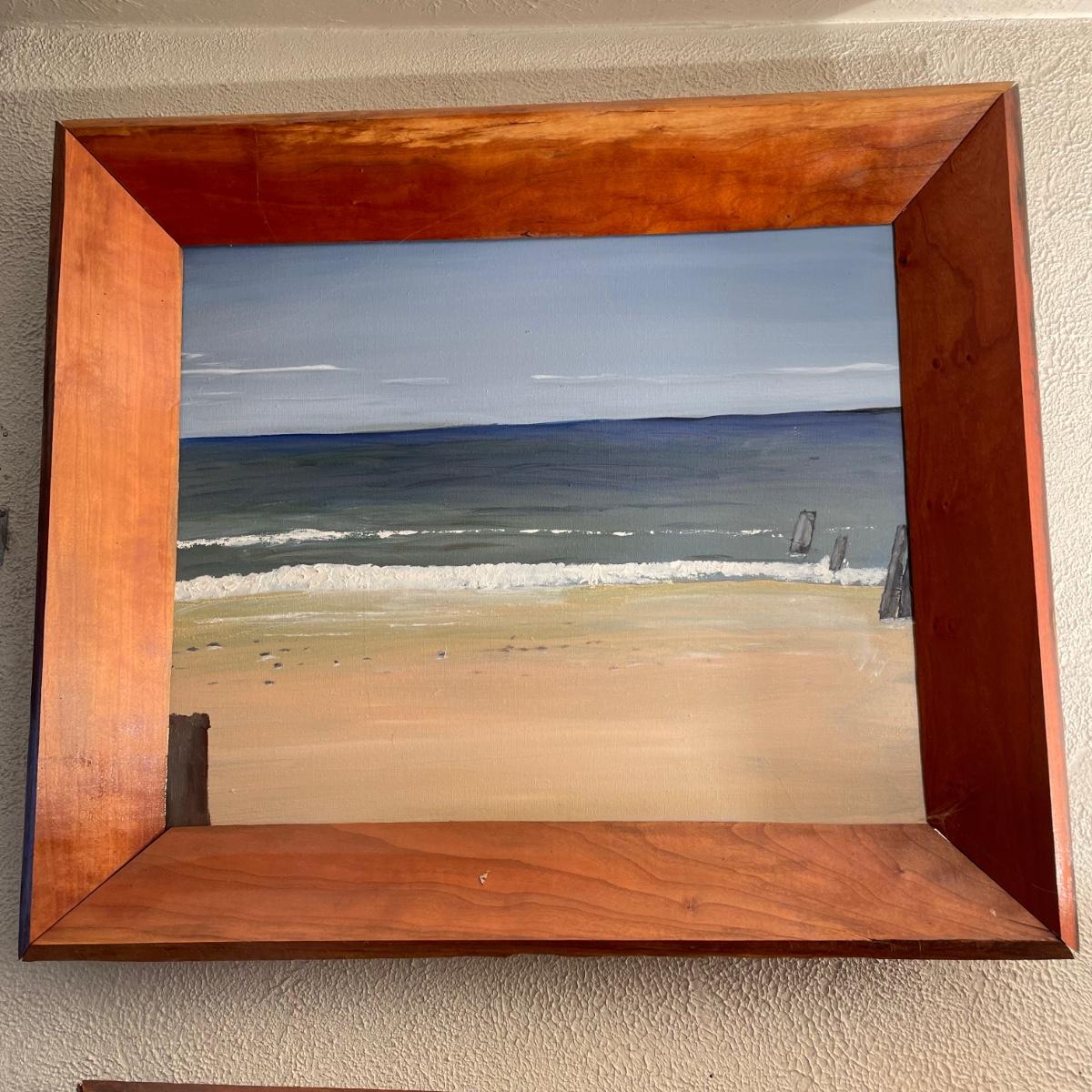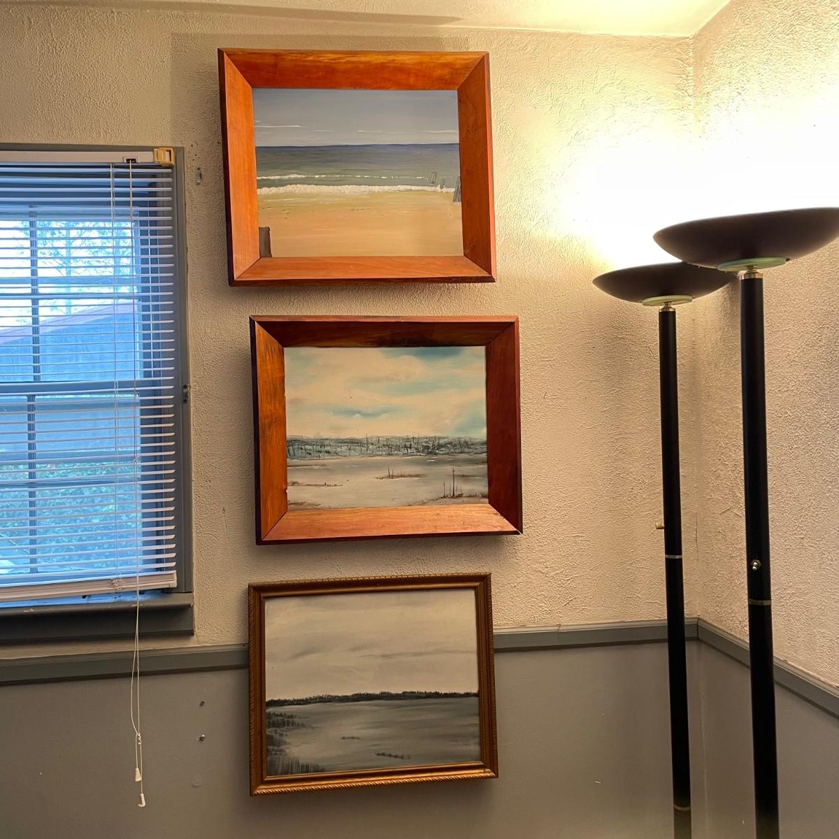 Two original oil paintings in handmade frames with ocean scenes. These rustic frames measure 21” x 4” x 24”. One frame is complete with hanging wire. The final waterscape has tones of grayish blues and sits behind glass and is either acrylic or oil painting. This frame has been hung with a nail in the top portion of the frame, the wooden frame measures about 18.5” x 22.5”. All pieces need a quick dusting and polishing. Local pick up only.