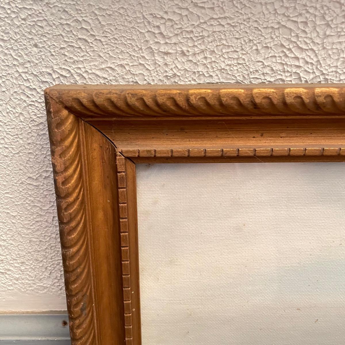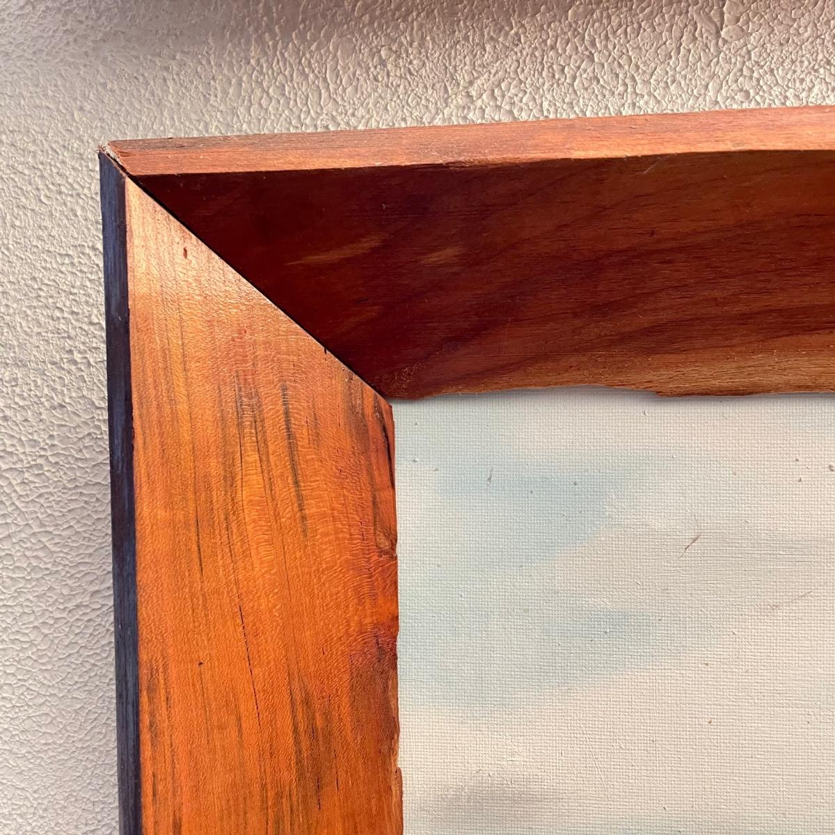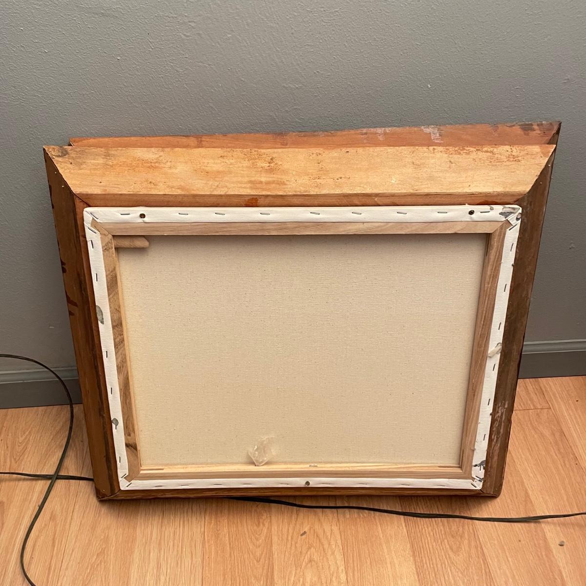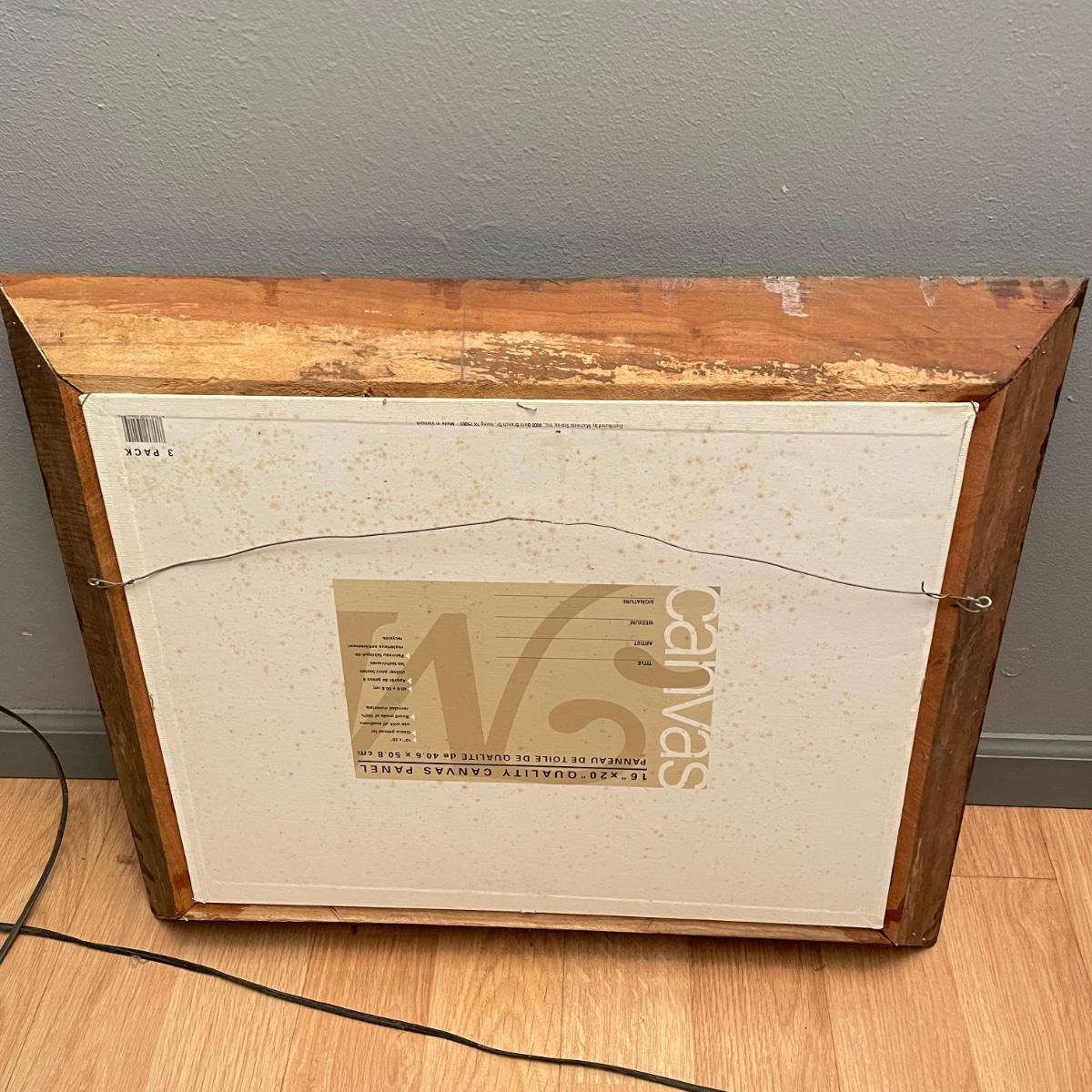 Two original oil paintings in handmade frames with ocean scenes. These rustic frames measure 21” x 4” x 24”. One frame is complete with hanging wire. The final waterscape has tones of grayish blues and sits behind glass and is either acrylic or oil painting. This frame has been hung with a nail in the top portion of the frame, the wooden frame measures about 18.5” x 22.5”. All pieces need a quick dusting and polishing. Local pick up only.