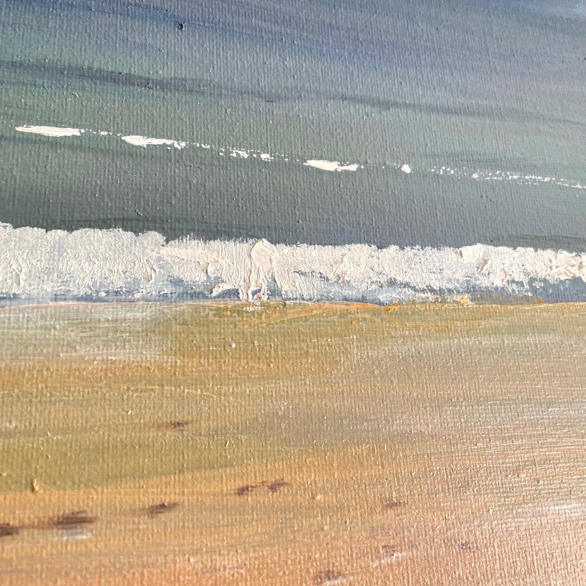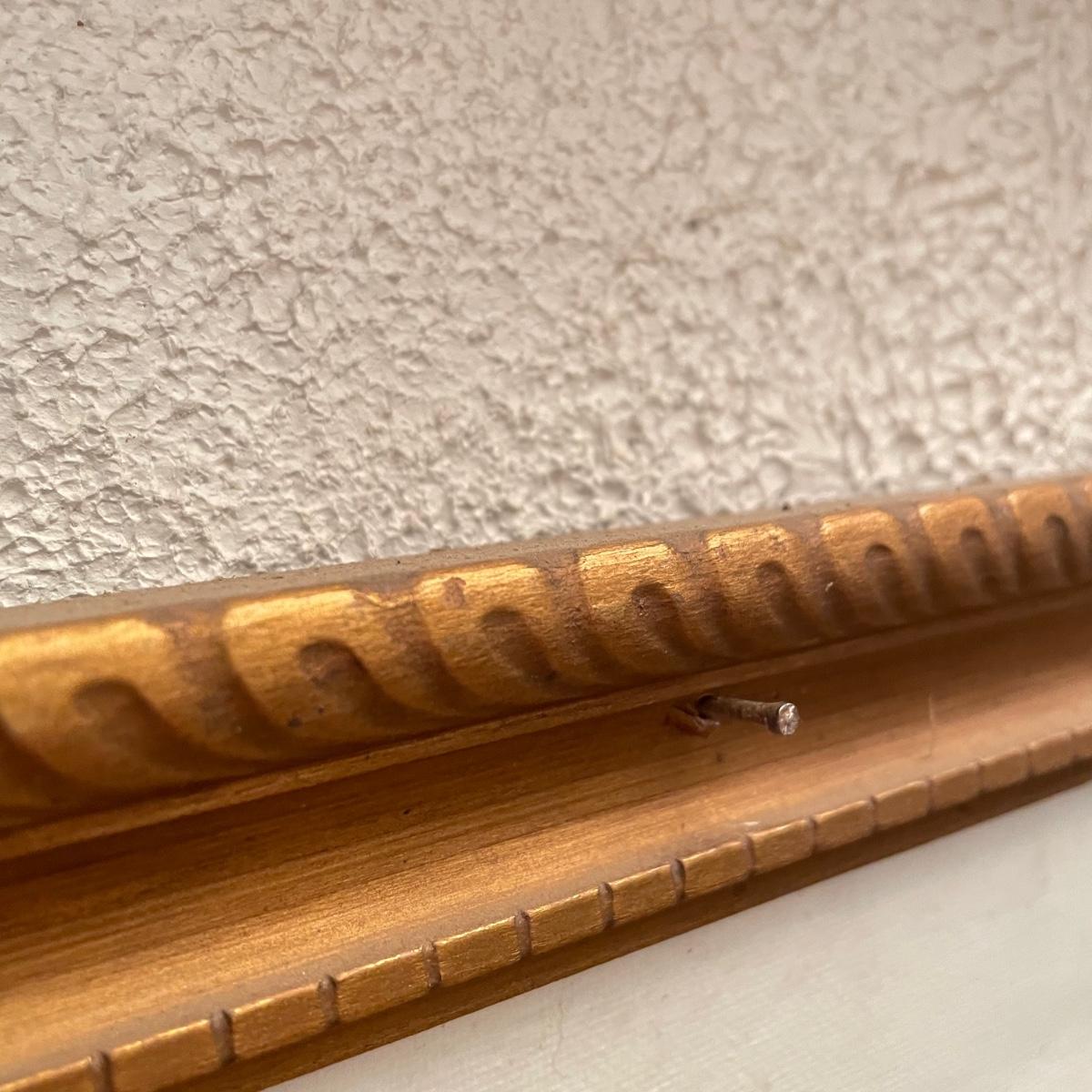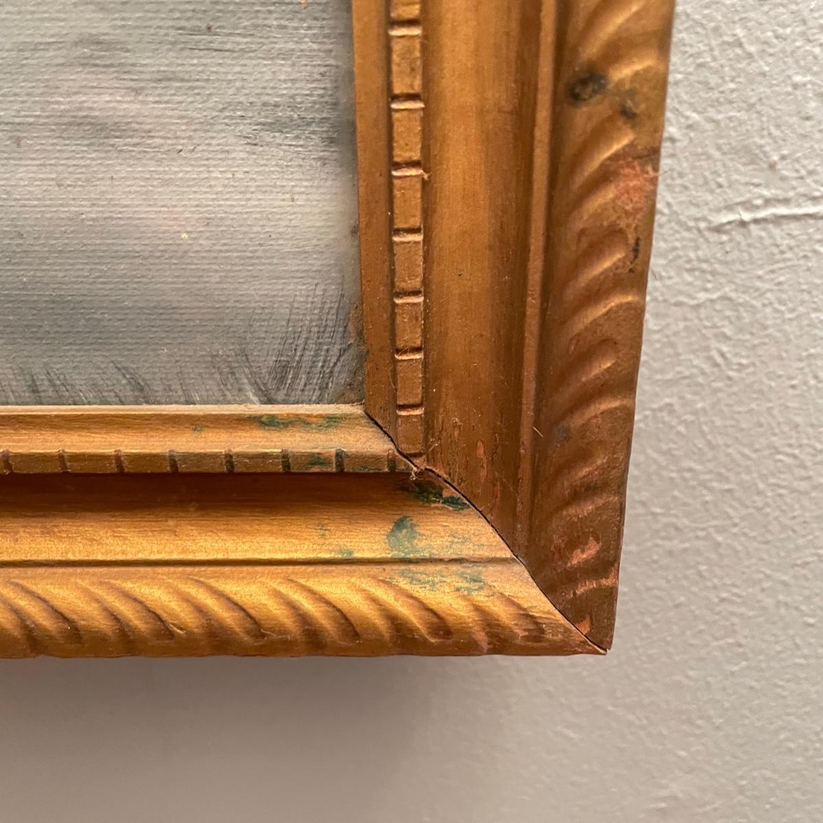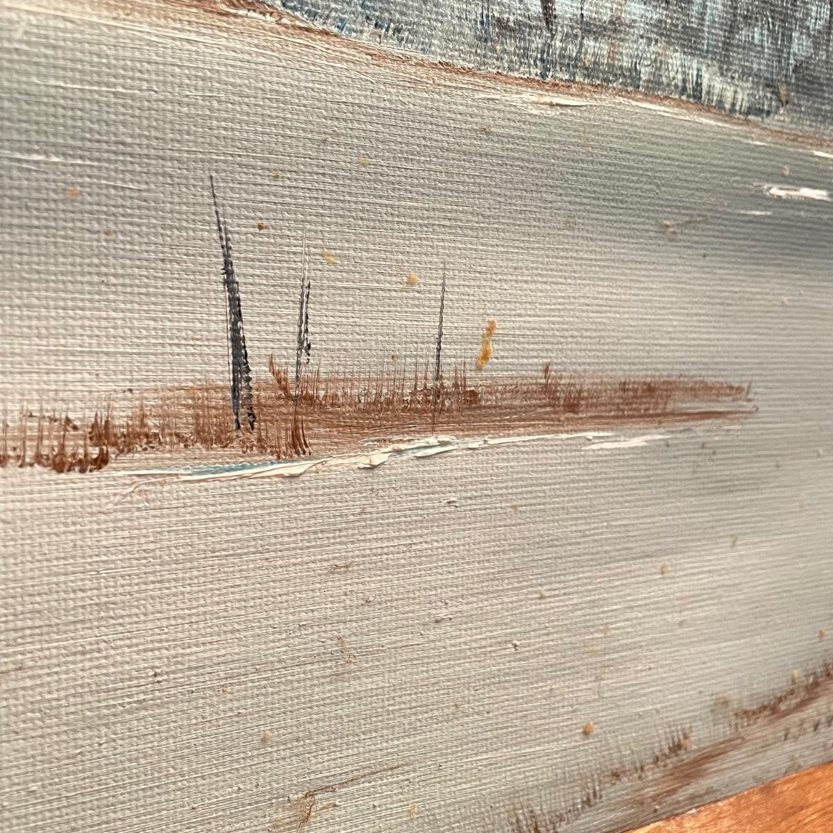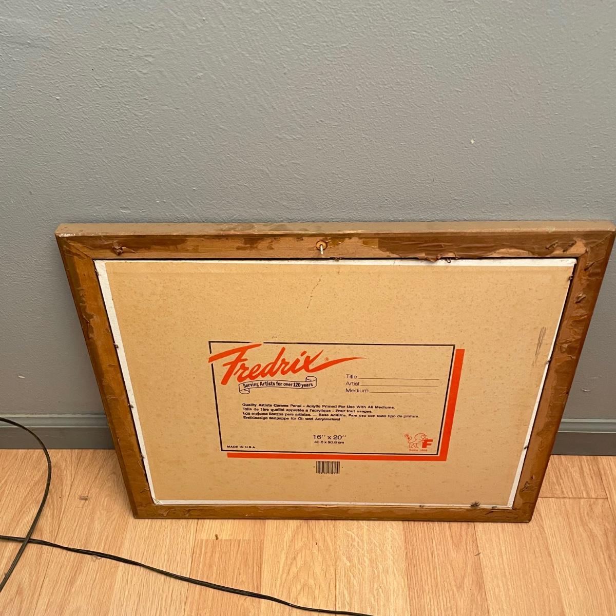 Two original oil paintings in handmade frames with ocean scenes. These rustic frames measure 21” x 4” x 24”. One frame is complete with hanging wire. The final waterscape has tones of grayish blues and sits behind glass and is either acrylic or oil painting. This frame has been hung with a nail in the top portion of the frame, the wooden frame measures about 18.5” x 22.5”. All pieces need a quick dusting and polishing. Local pick up only.