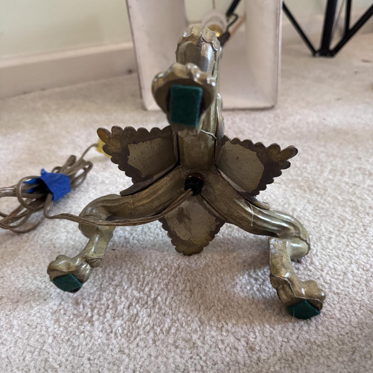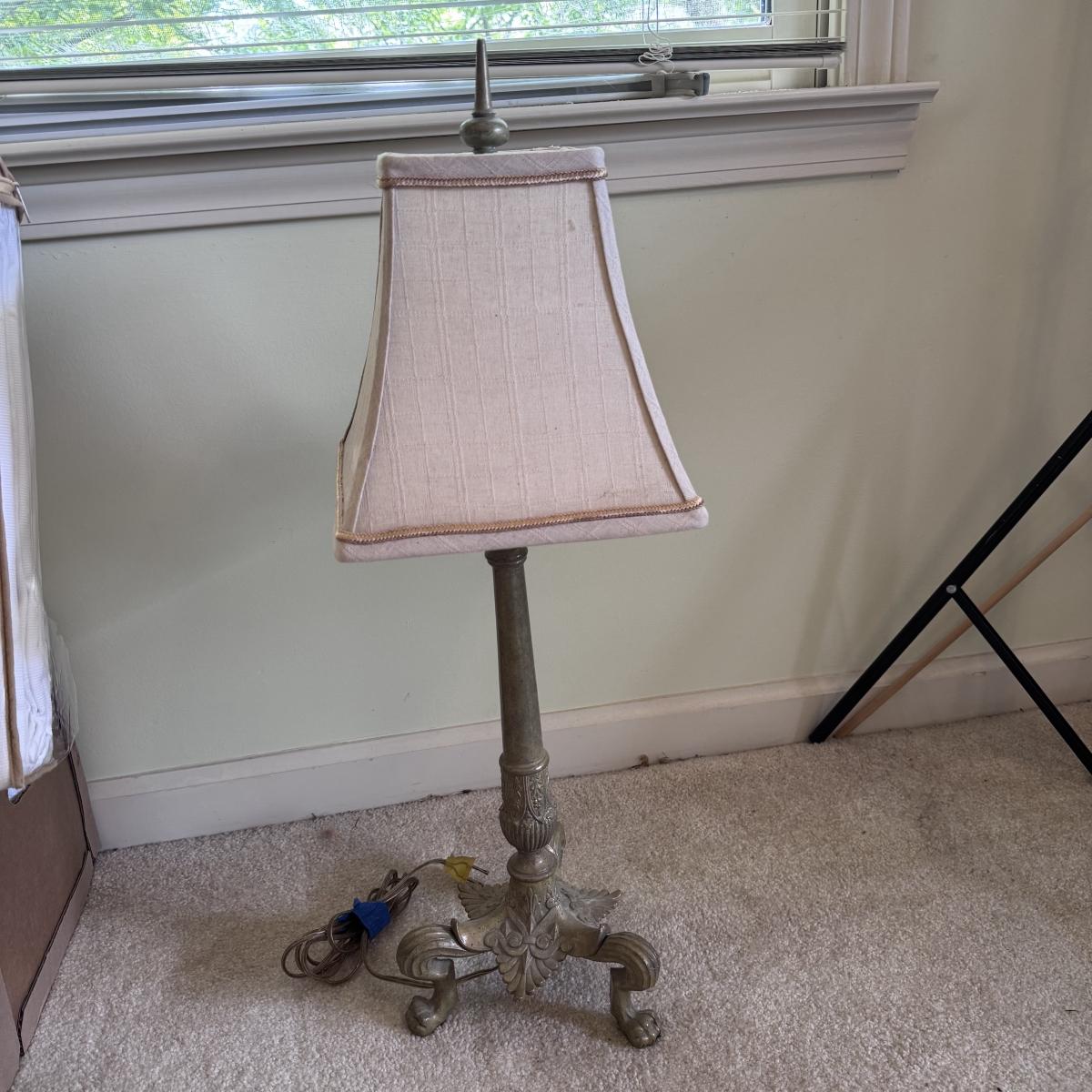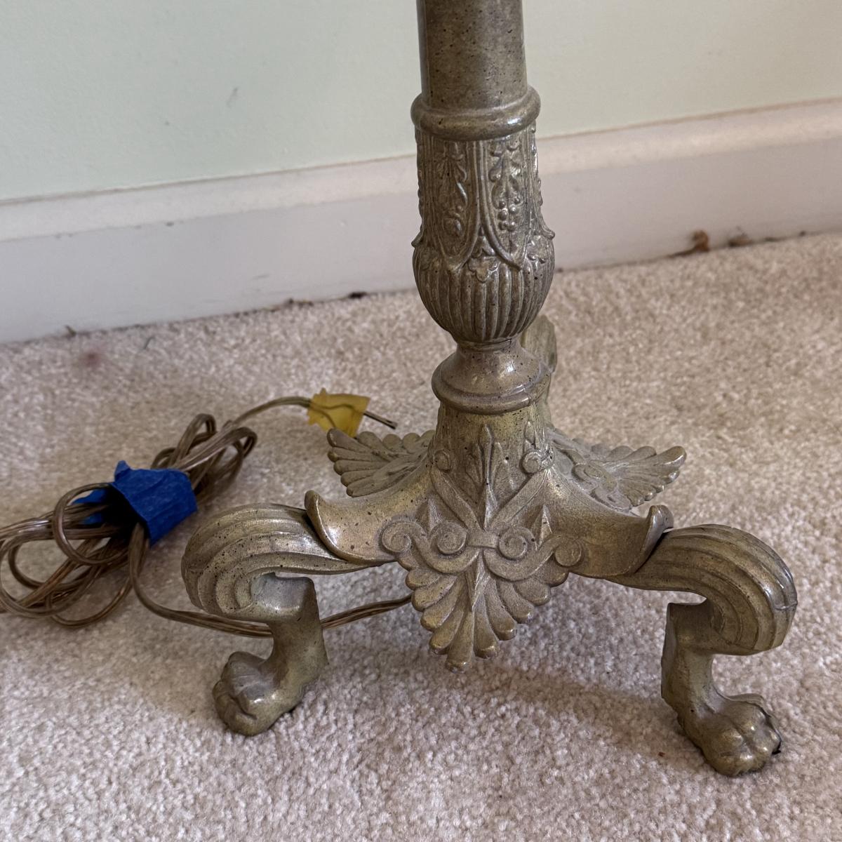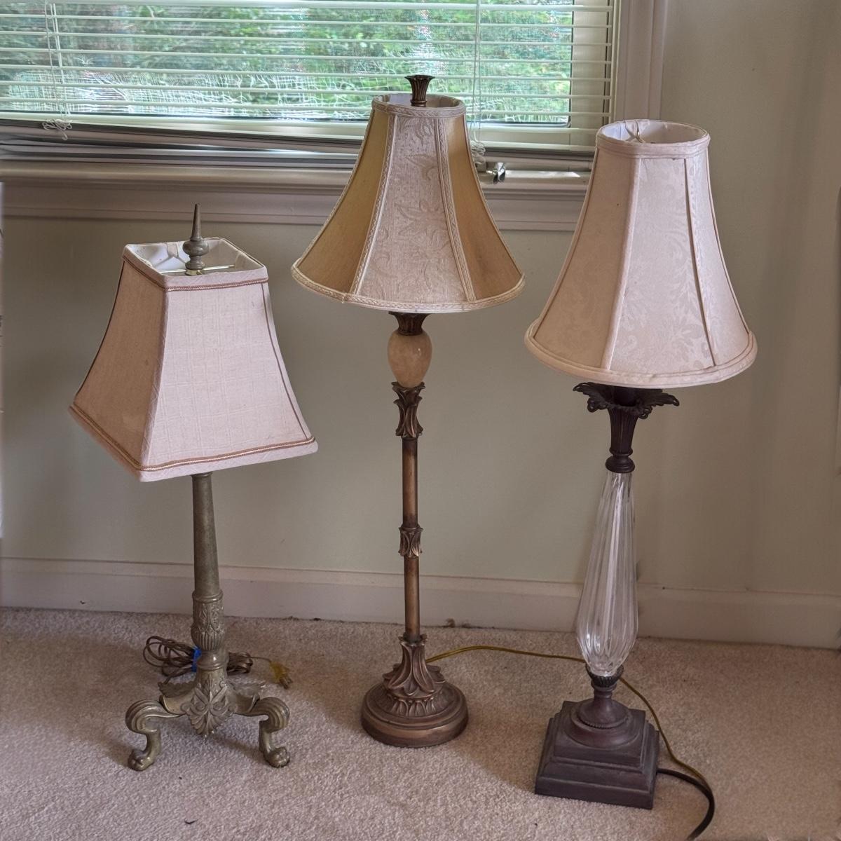 This lot includes three ornate table lamps, all made with a metal base. One of the lamps is missing its finial. All three powered on when plugged in. The tallest lamp measures 10”D x 32”H. Shipping available.
