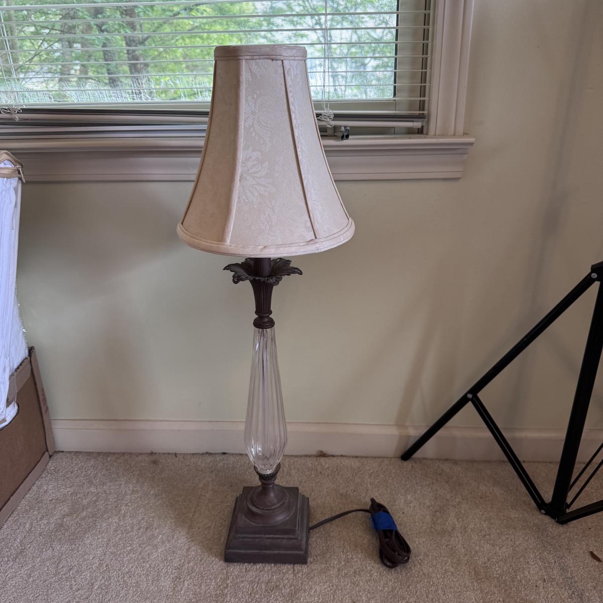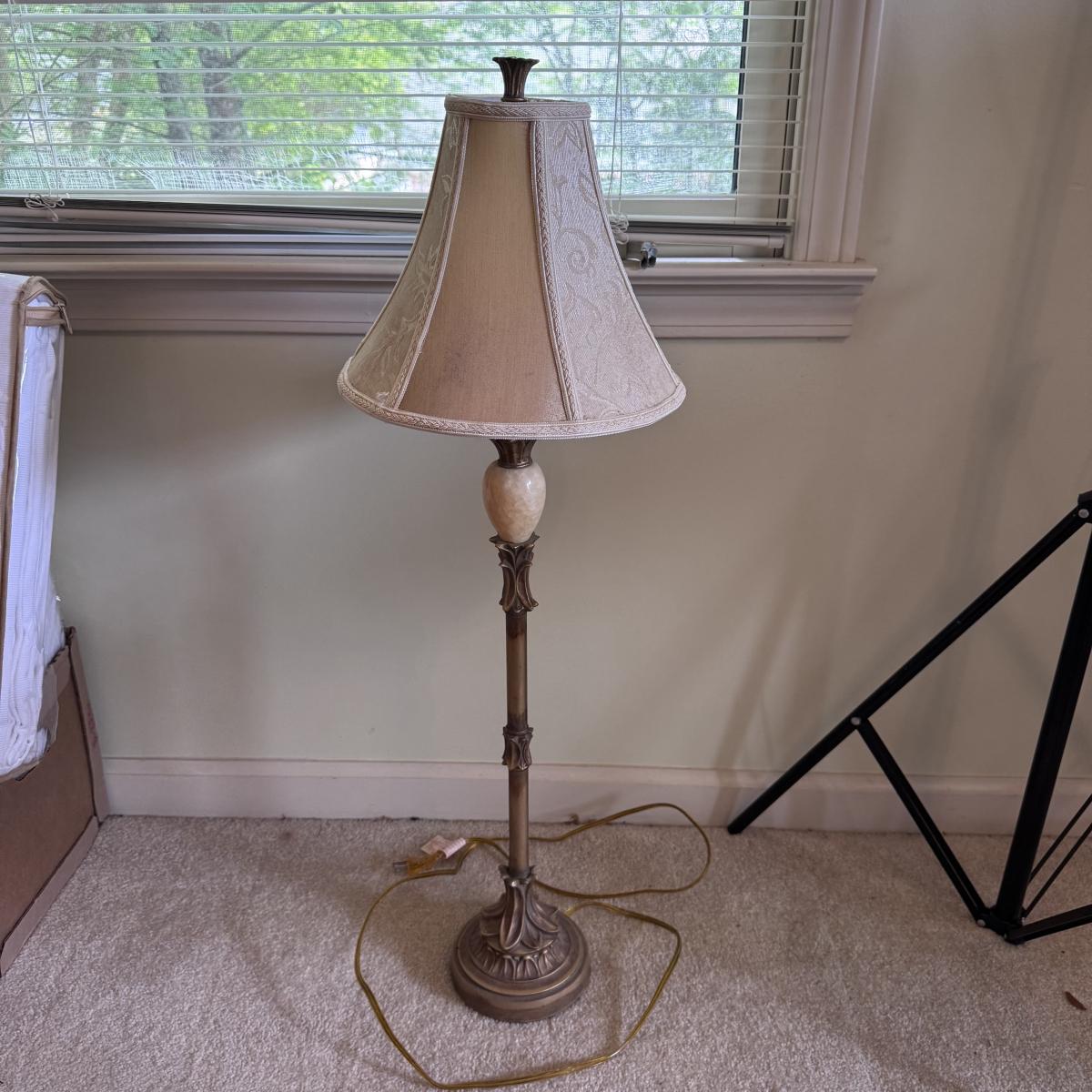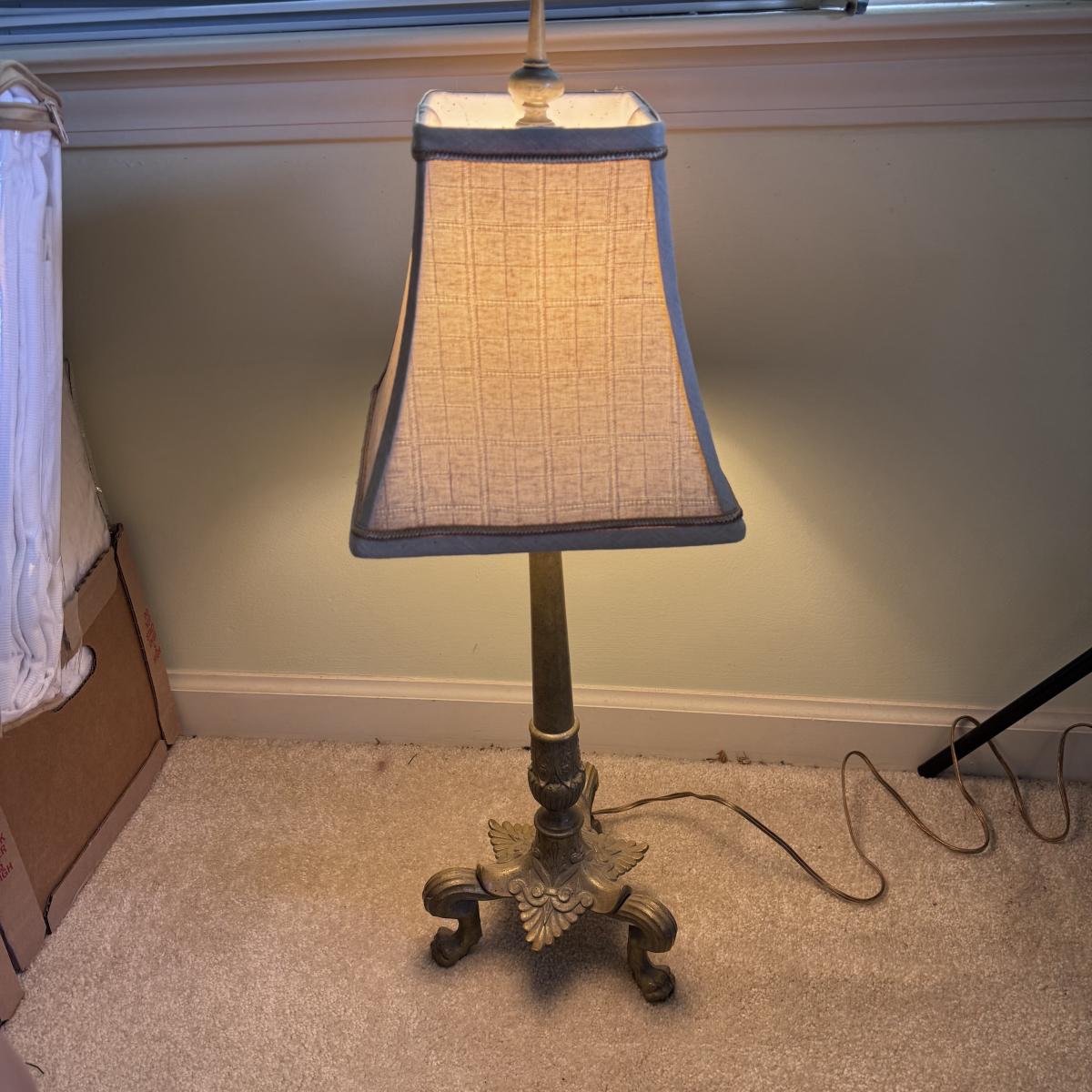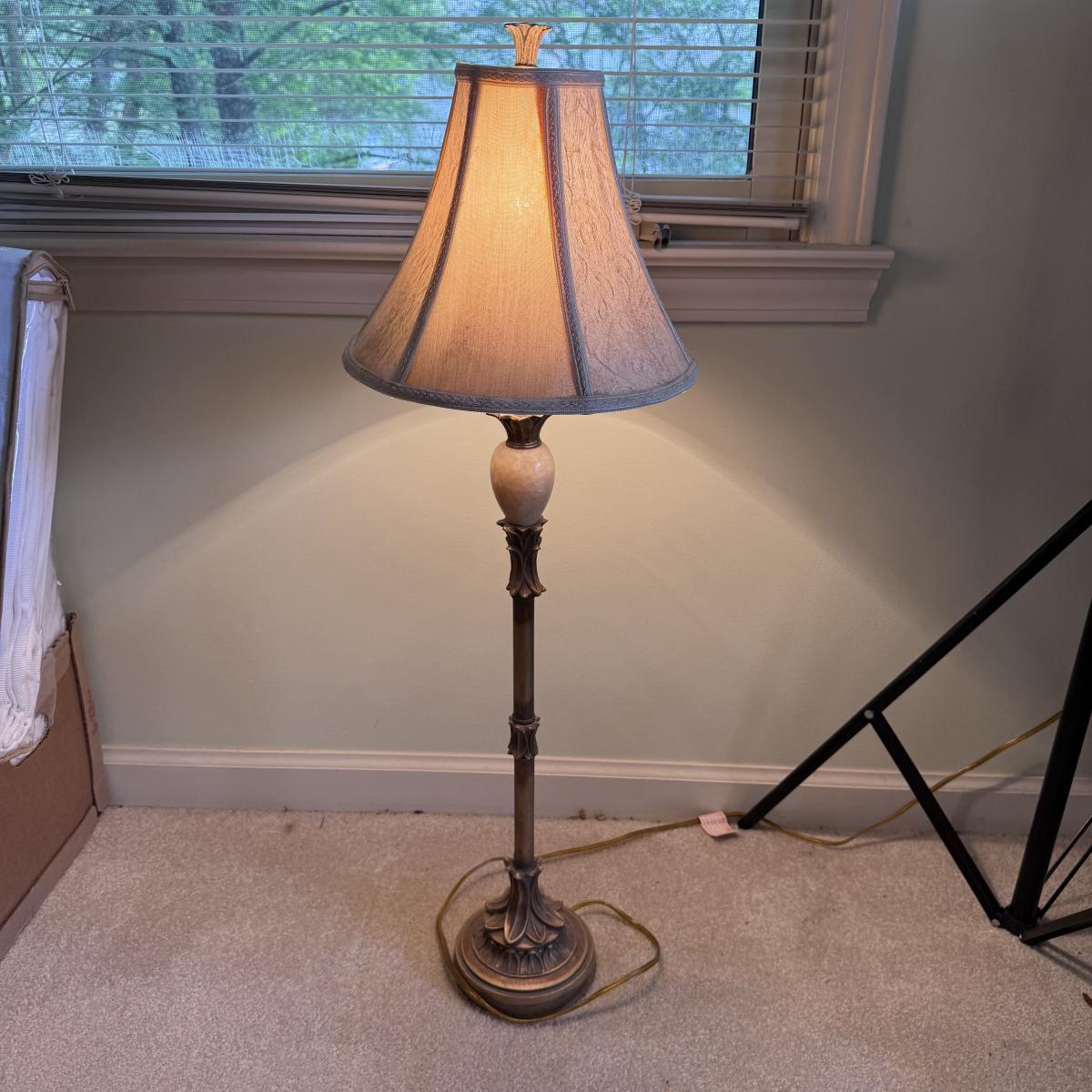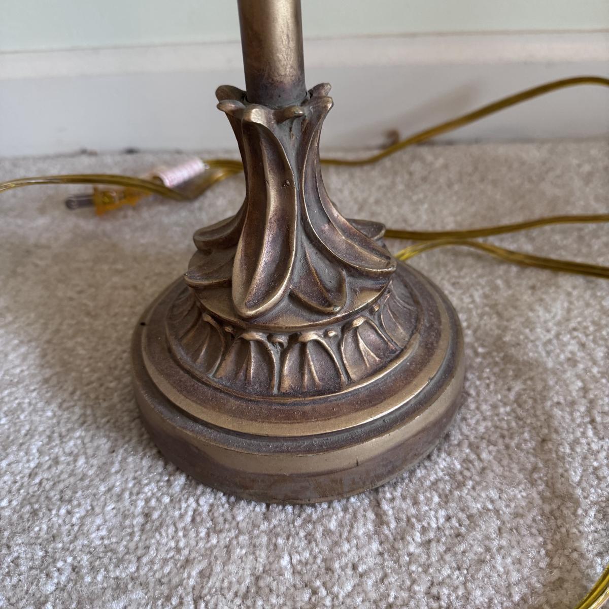 This lot includes three ornate table lamps, all made with a metal base. One of the lamps is missing its finial. All three powered on when plugged in. The tallest lamp measures 10”D x 32”H. Shipping available.