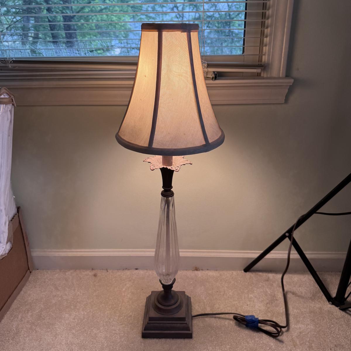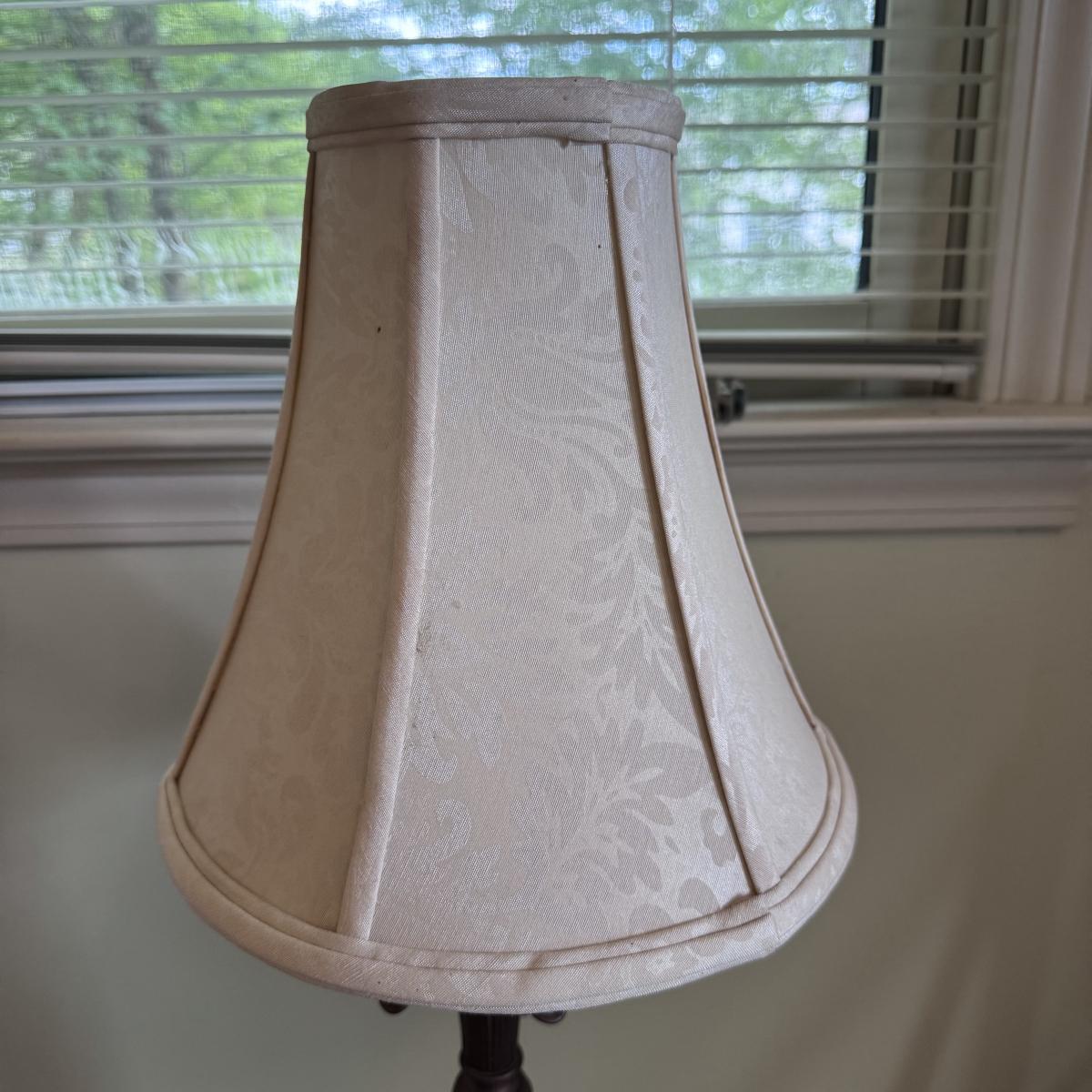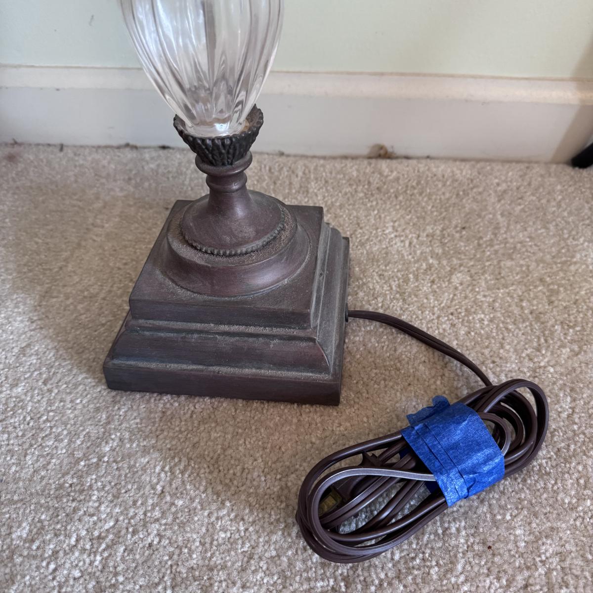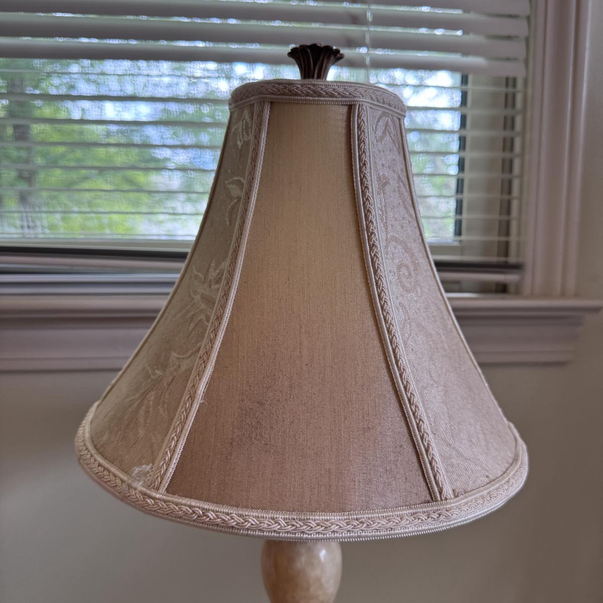 This lot includes three ornate table lamps, all made with a metal base. One of the lamps is missing its finial. All three powered on when plugged in. The tallest lamp measures 10”D x 32”H. Shipping available.