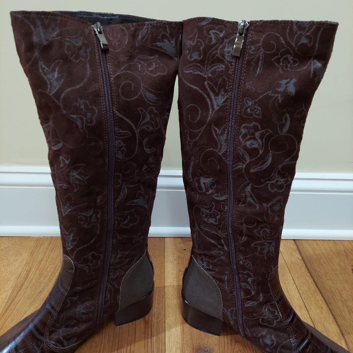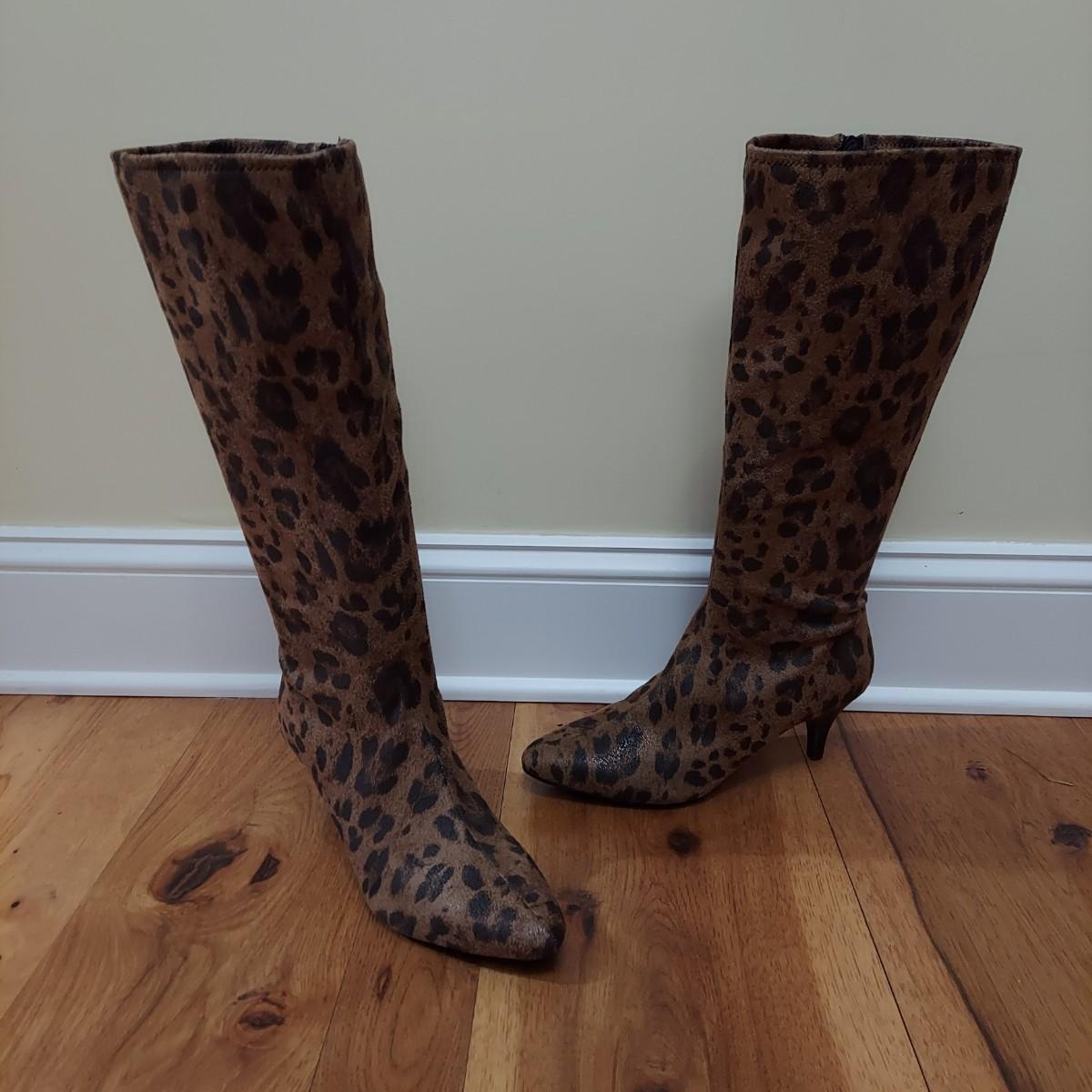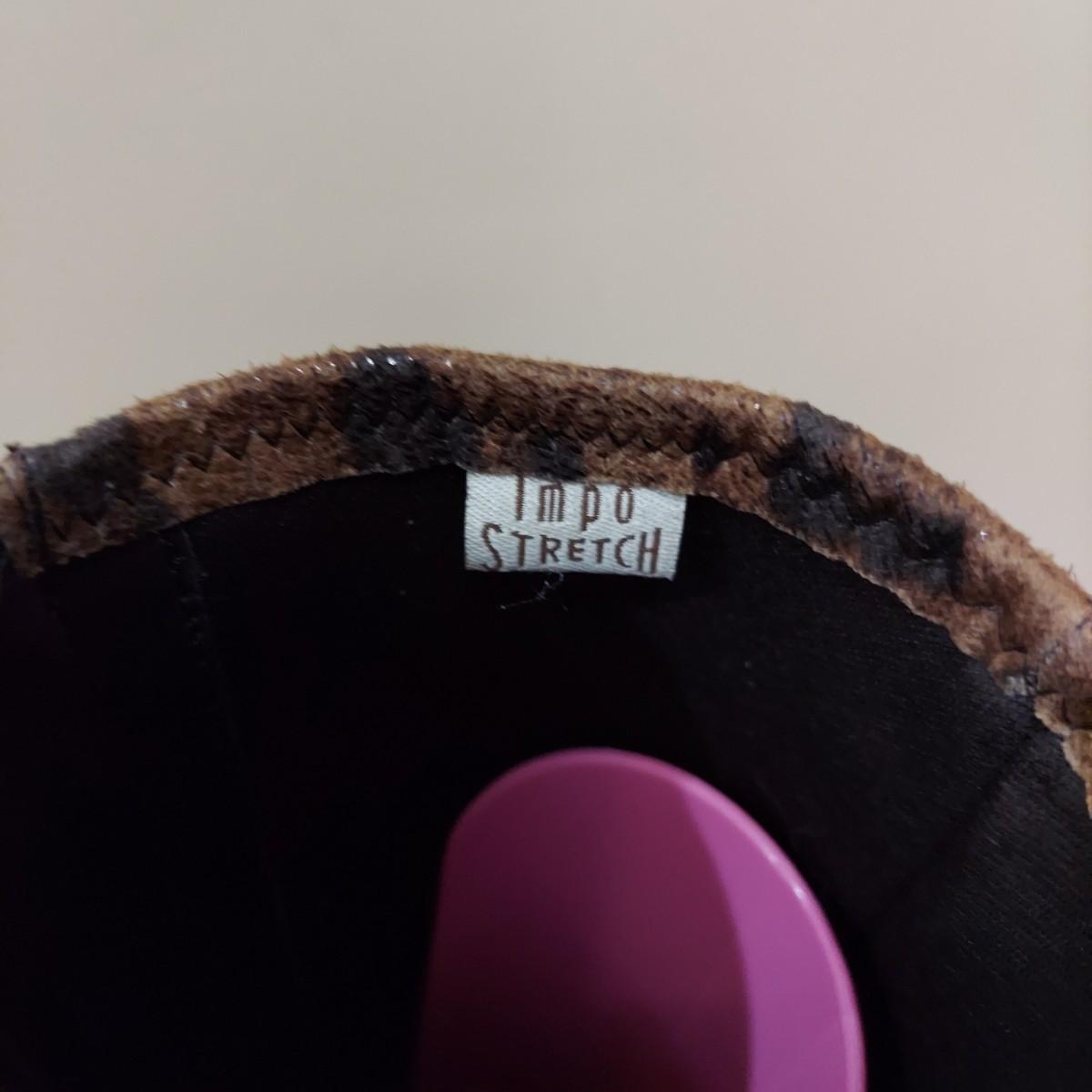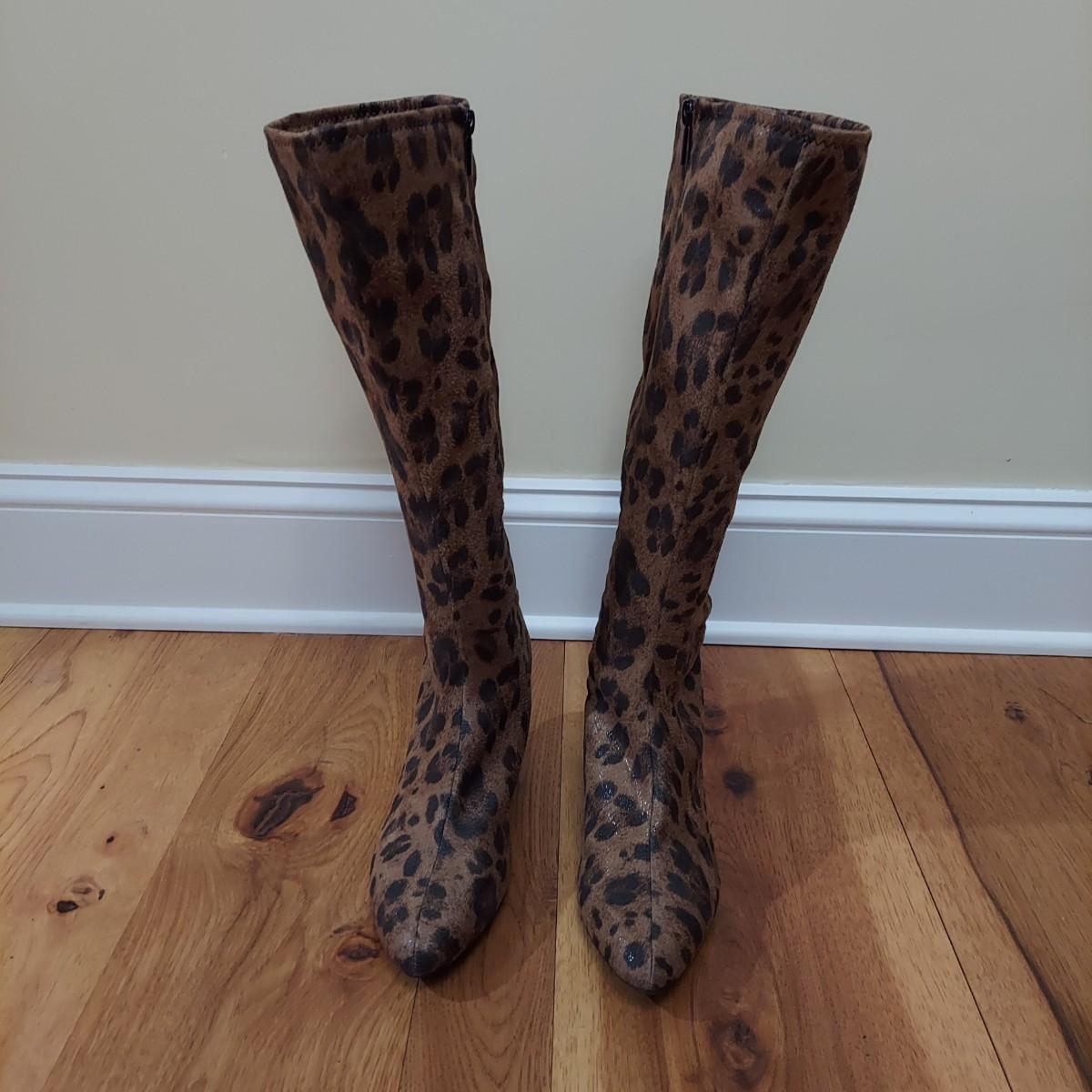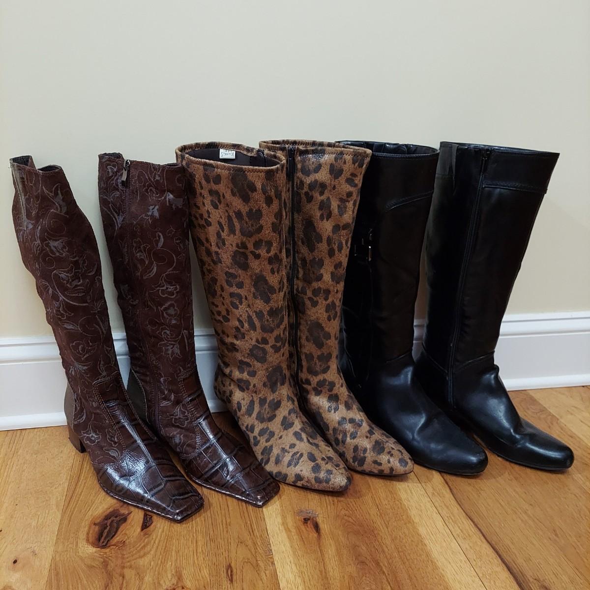 This lots includes three pair of tall boots. Brown Tracy Porter brand boots with mixed materials have a croc embossed leather toe. There is a 2" Stacked block heel with a rubber sole. The other two pair are Impo Stretch brand. The leopard print pair has a 3" heel. The black moto style boot has a 2" wedge heel. All three pair have an inside zip and are a size 10. Shipping available.