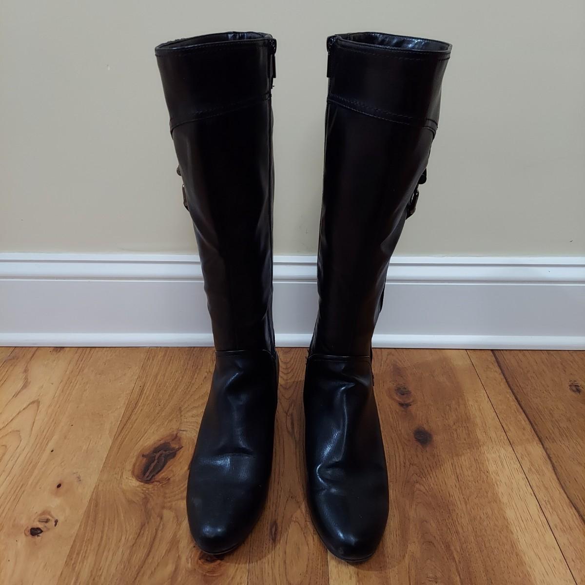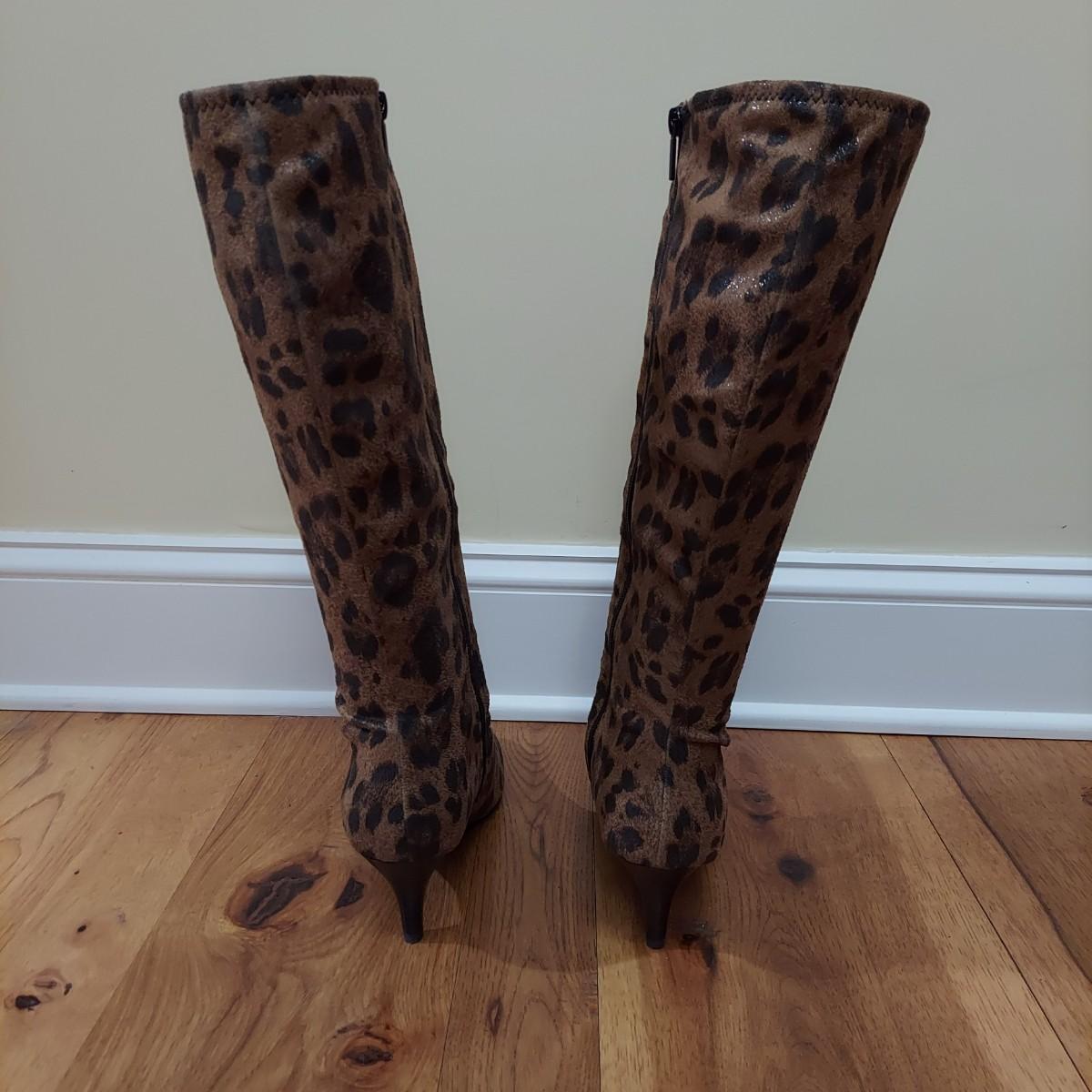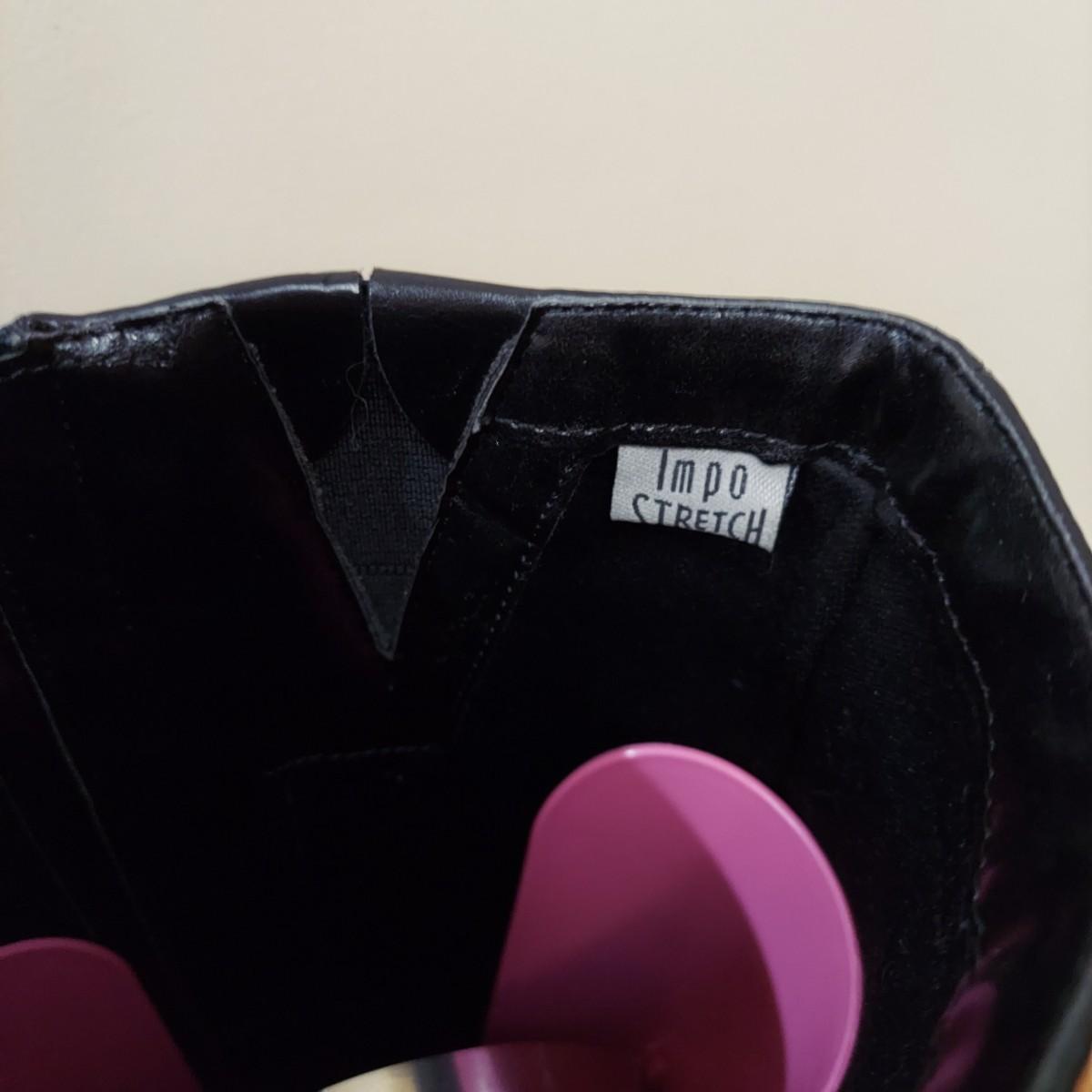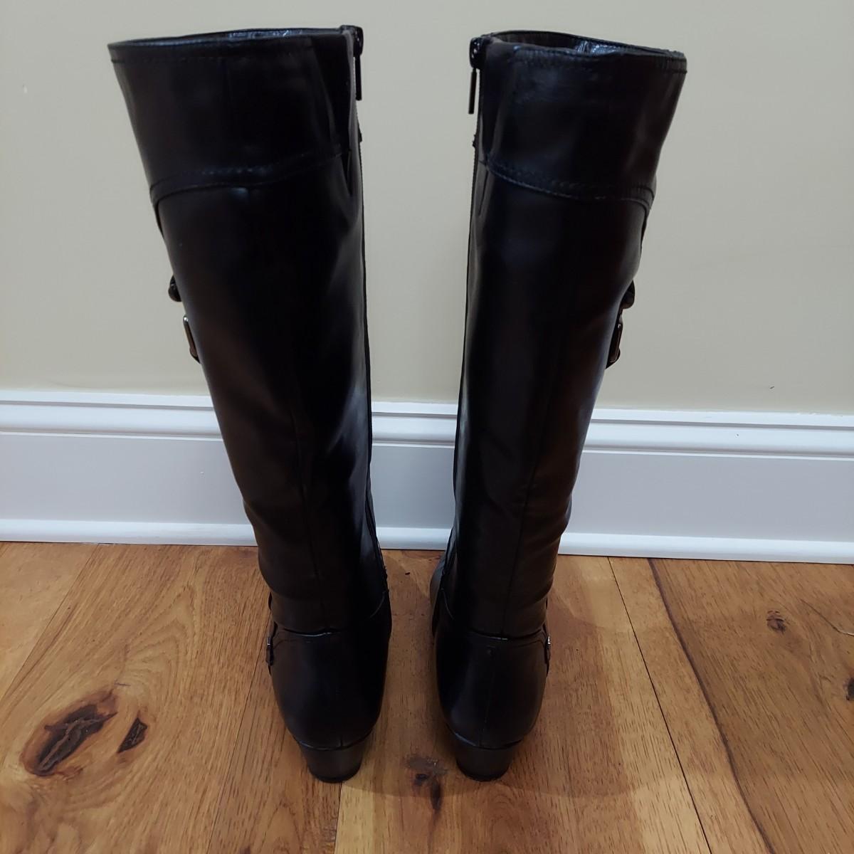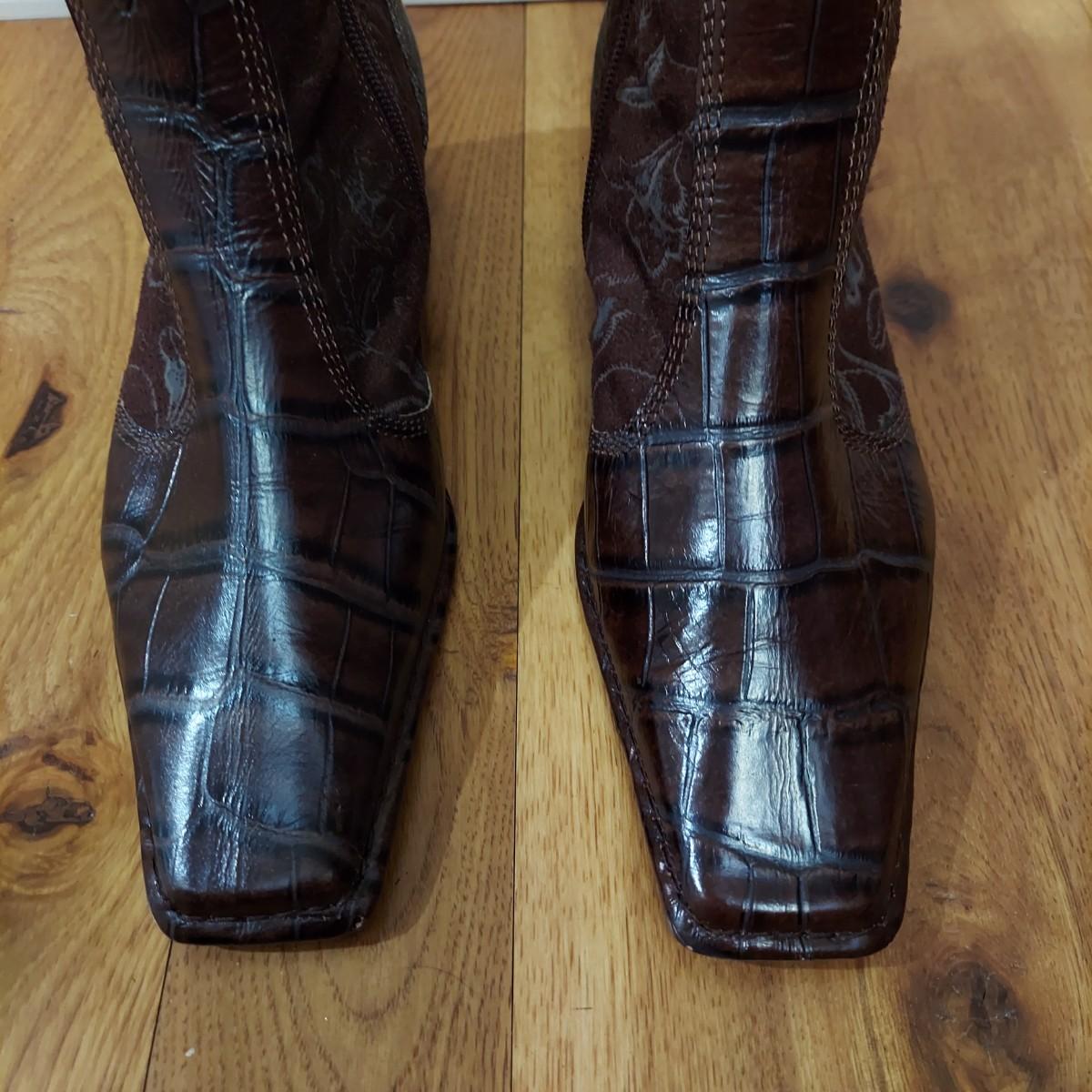 This lots includes three pair of tall boots. Brown Tracy Porter brand boots with mixed materials have a croc embossed leather toe. There is a 2" Stacked block heel with a rubber sole. The other two pair are Impo Stretch brand. The leopard print pair has a 3" heel. The black moto style boot has a 2" wedge heel. All three pair have an inside zip and are a size 10. Shipping available.