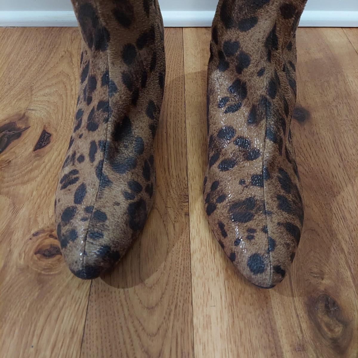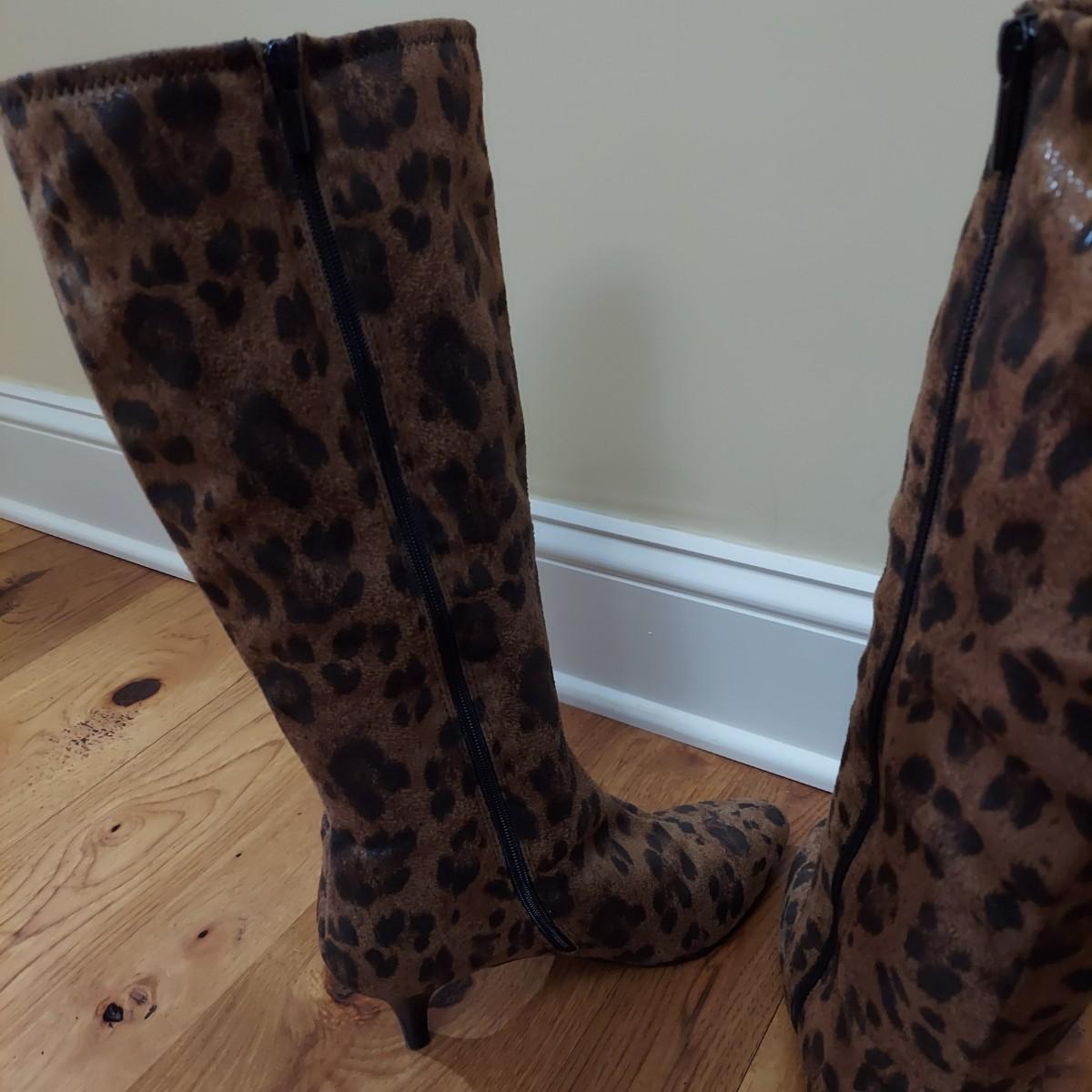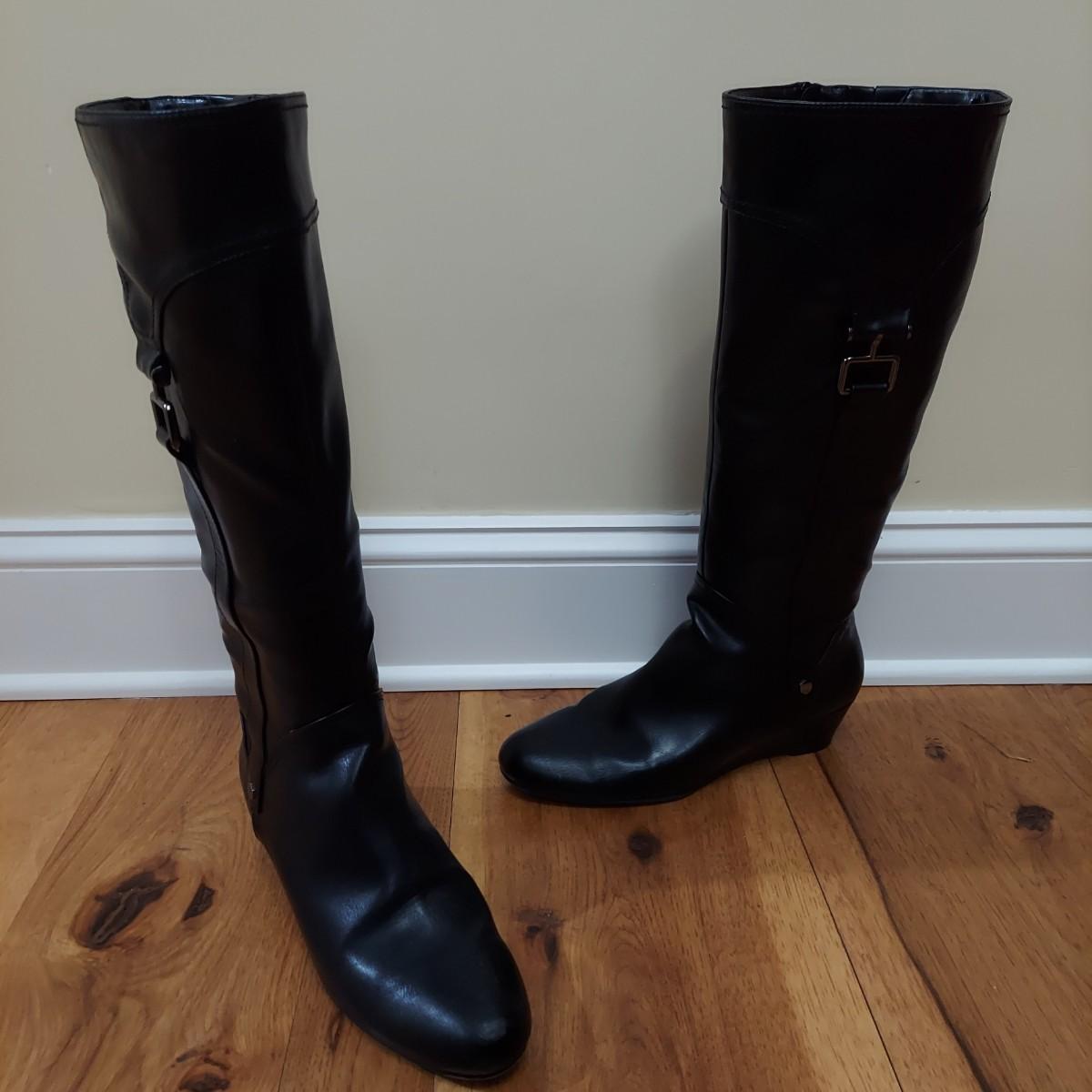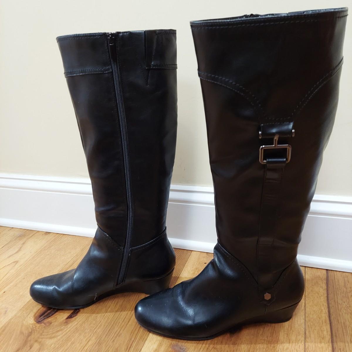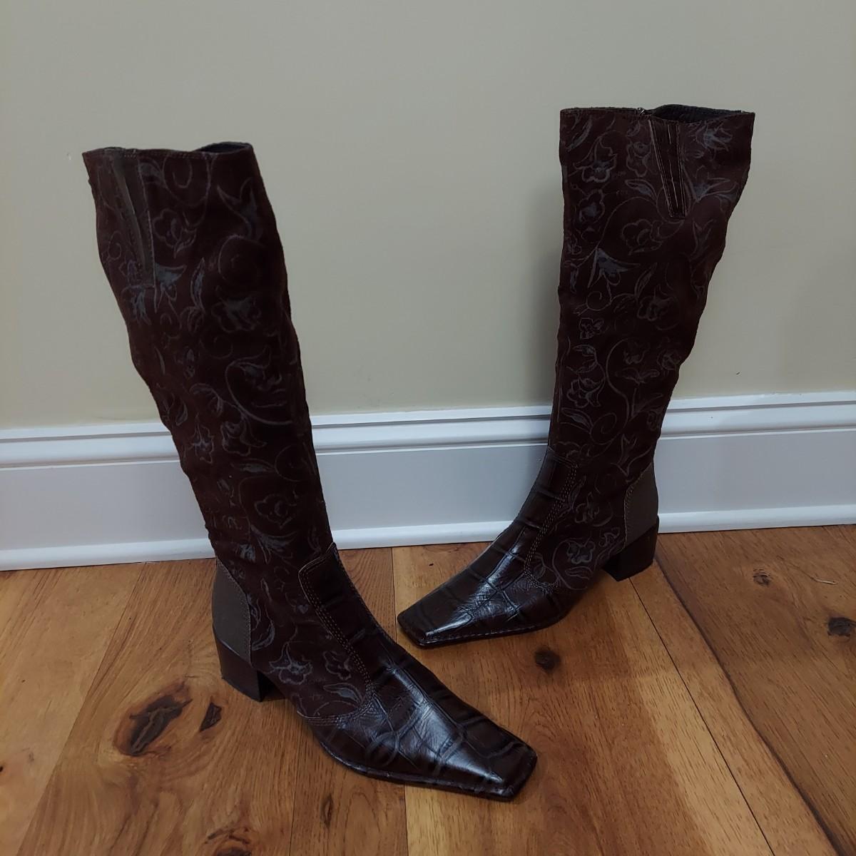 This lots includes three pair of tall boots. Brown Tracy Porter brand boots with mixed materials have a croc embossed leather toe. There is a 2" Stacked block heel with a rubber sole. The other two pair are Impo Stretch brand. The leopard print pair has a 3" heel. The black moto style boot has a 2" wedge heel. All three pair have an inside zip and are a size 10. Shipping available.