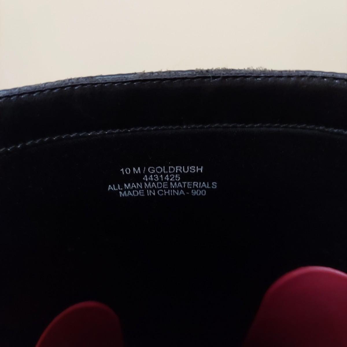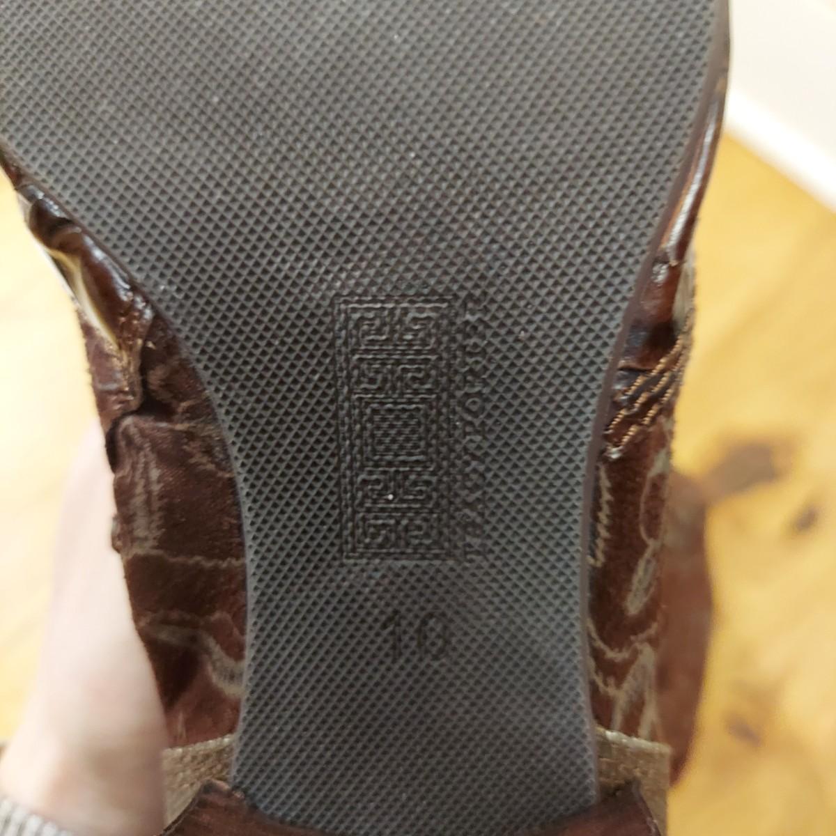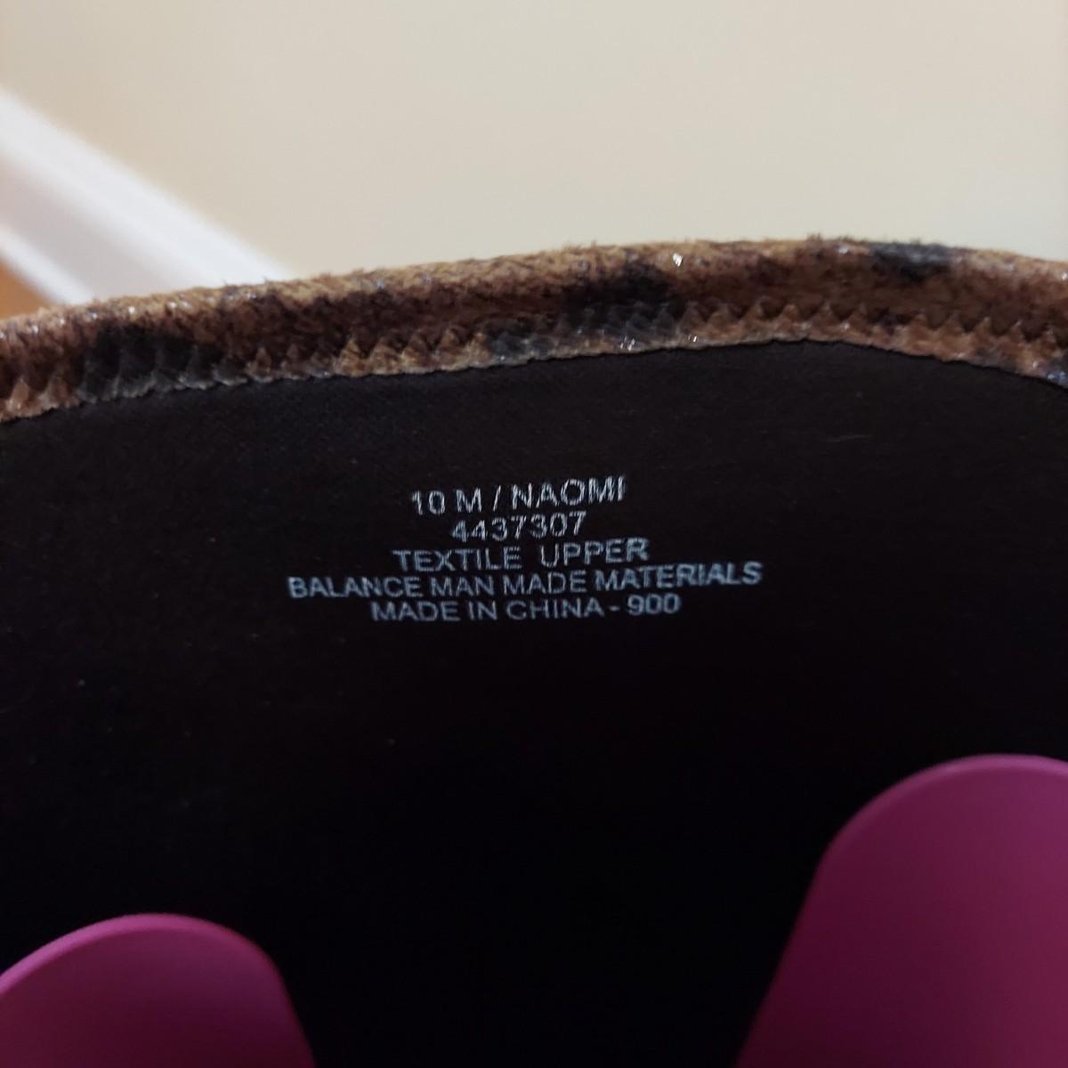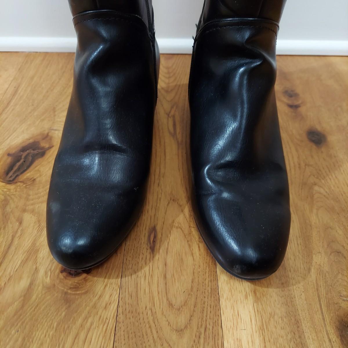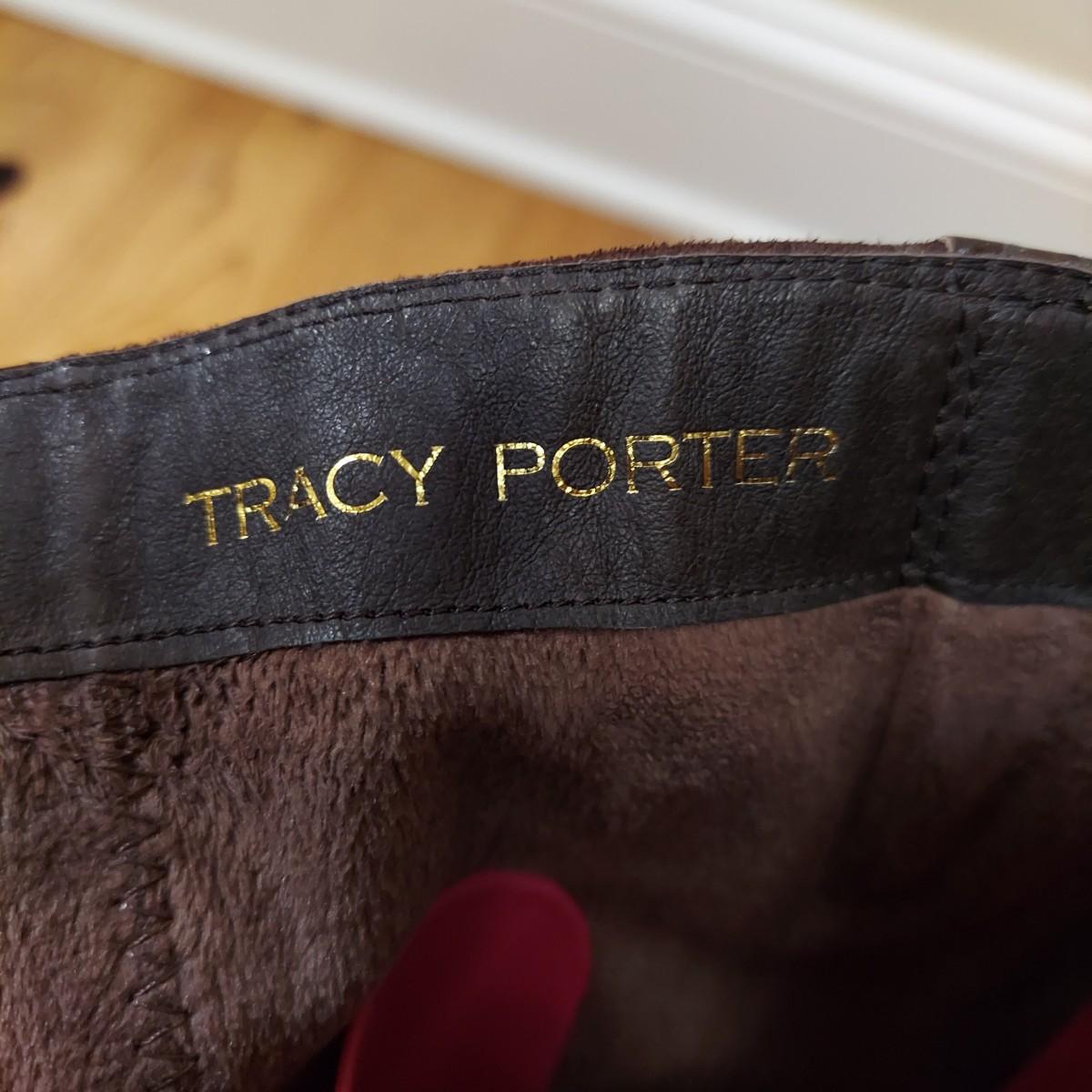 This lots includes three pair of tall boots. Brown Tracy Porter brand boots with mixed materials have a croc embossed leather toe. There is a 2" Stacked block heel with a rubber sole. The other two pair are Impo Stretch brand. The leopard print pair has a 3" heel. The black moto style boot has a 2" wedge heel. All three pair have an inside zip and are a size 10. Shipping available.