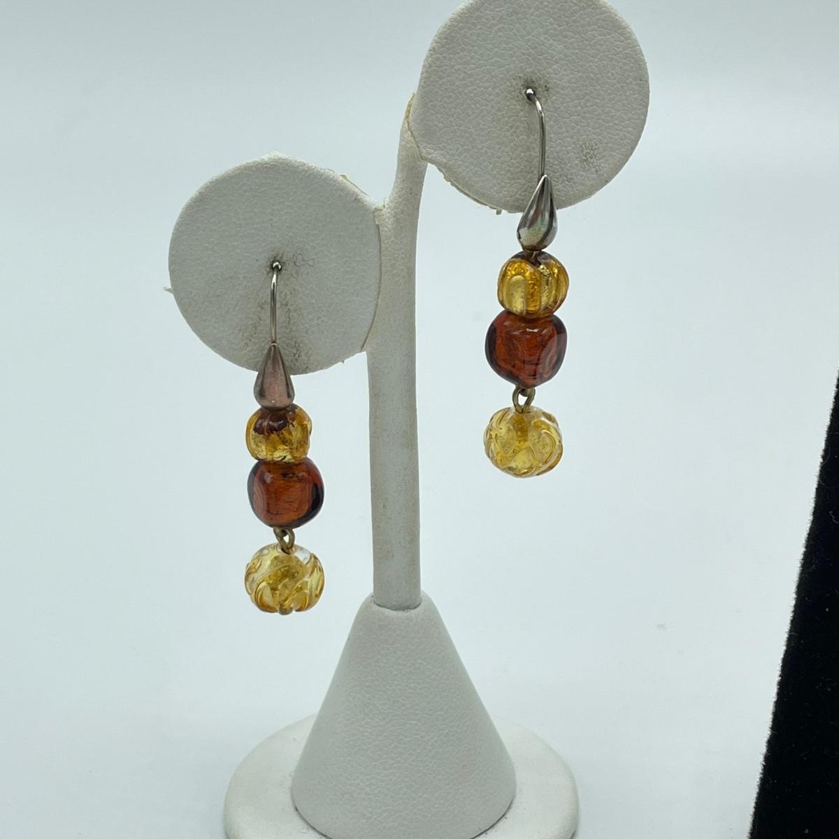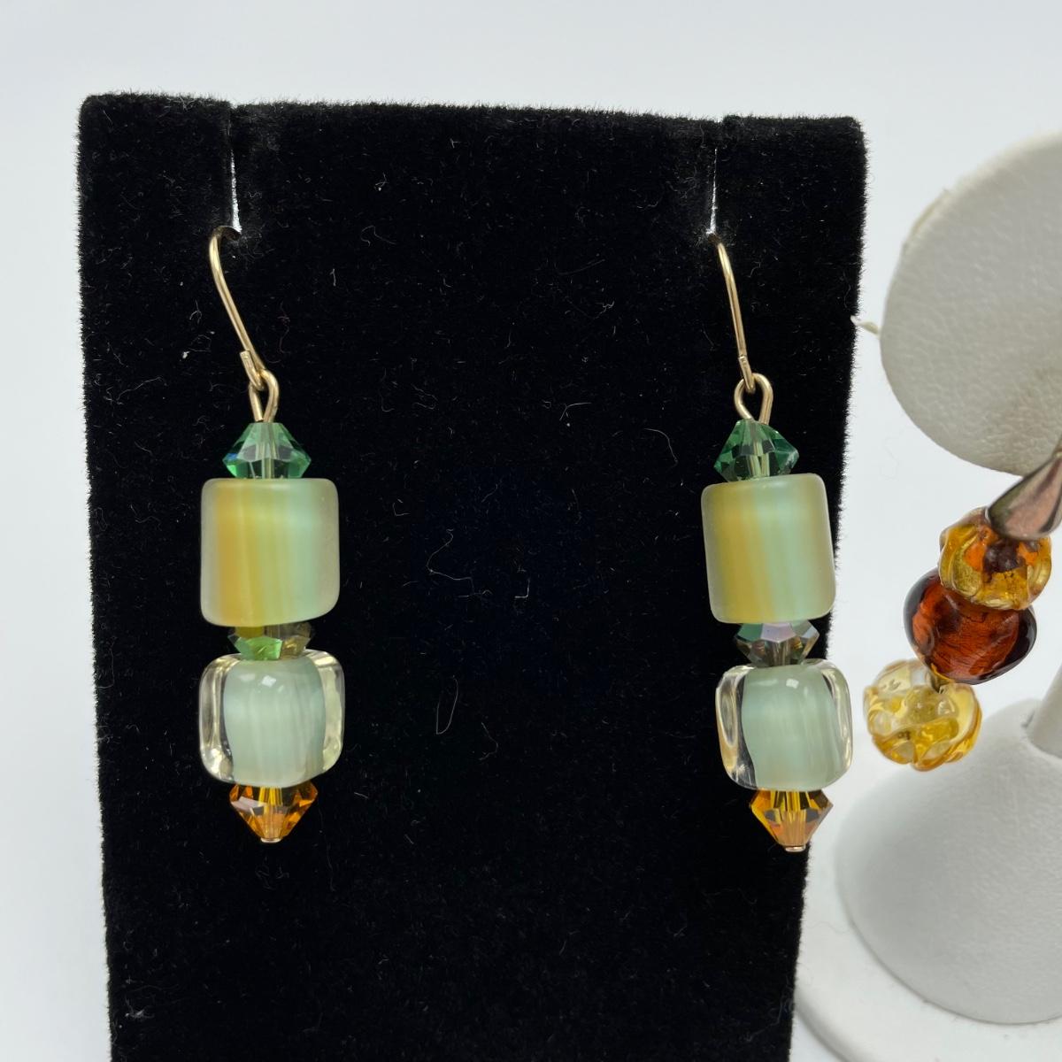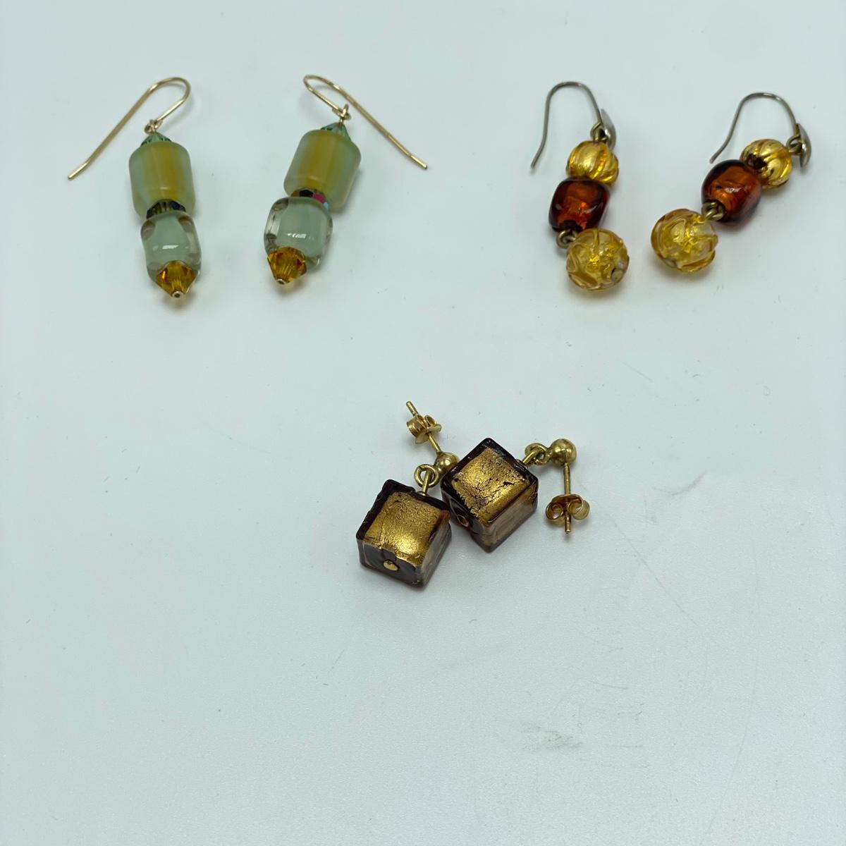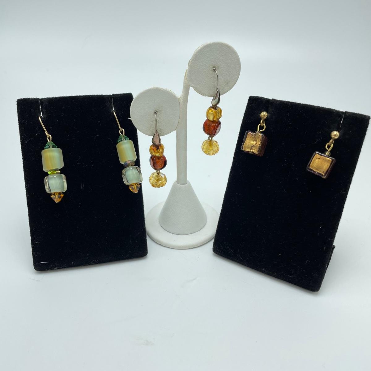 Three pretty pairs of dangle earrings made with glass and probably polymer. See images. Shipping available.