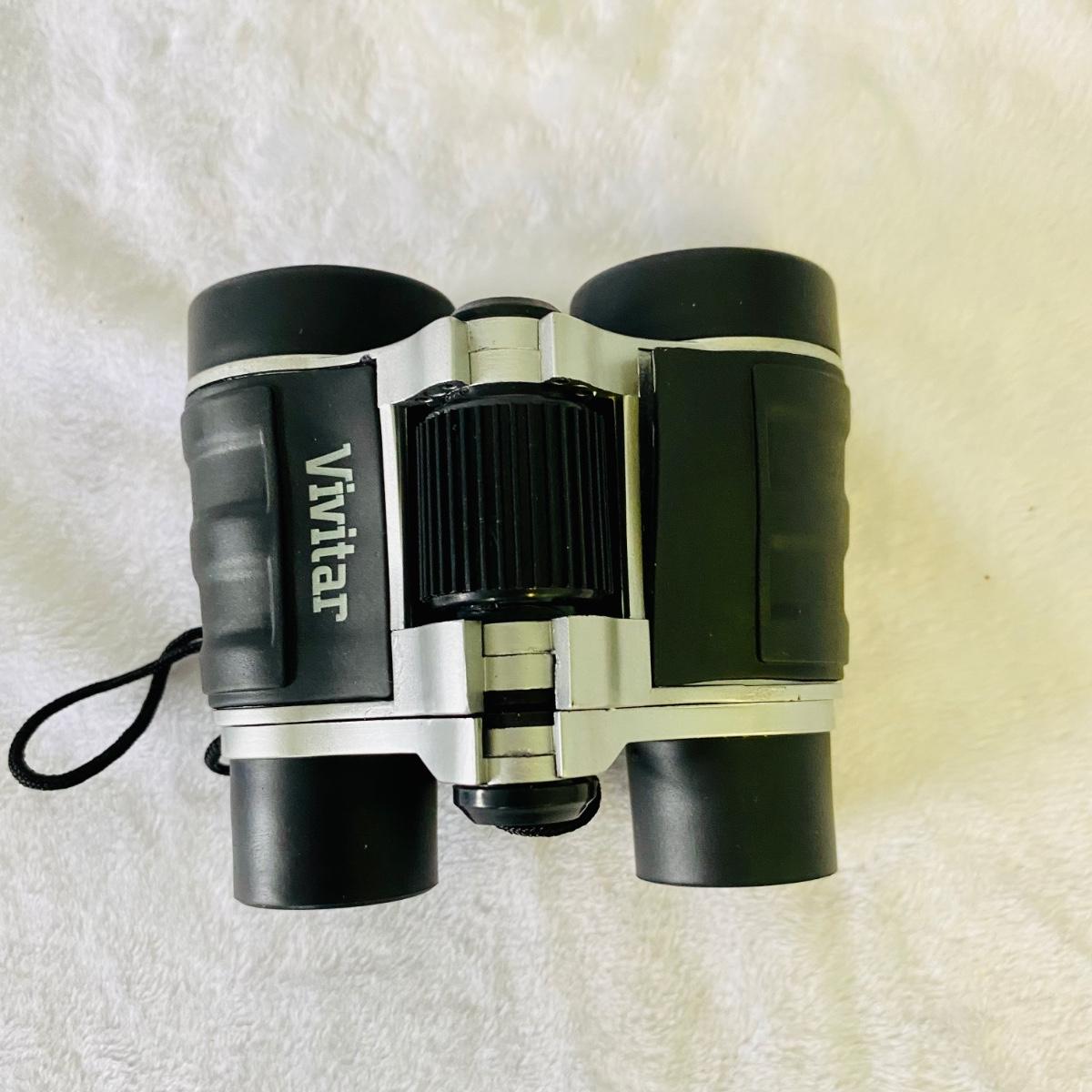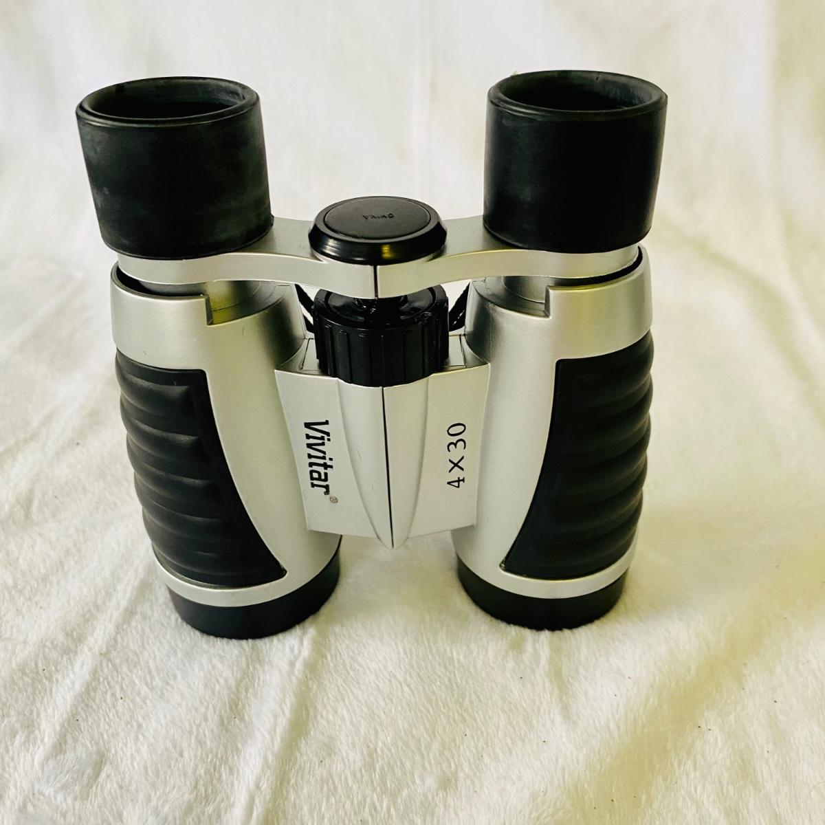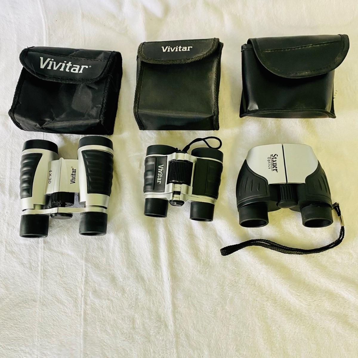 Two pairs of Vivitar binoculars. One pair measures 4.5”H and the other 3”H. Stauer pair measures 4”H. Each has a soft case. Good condition.