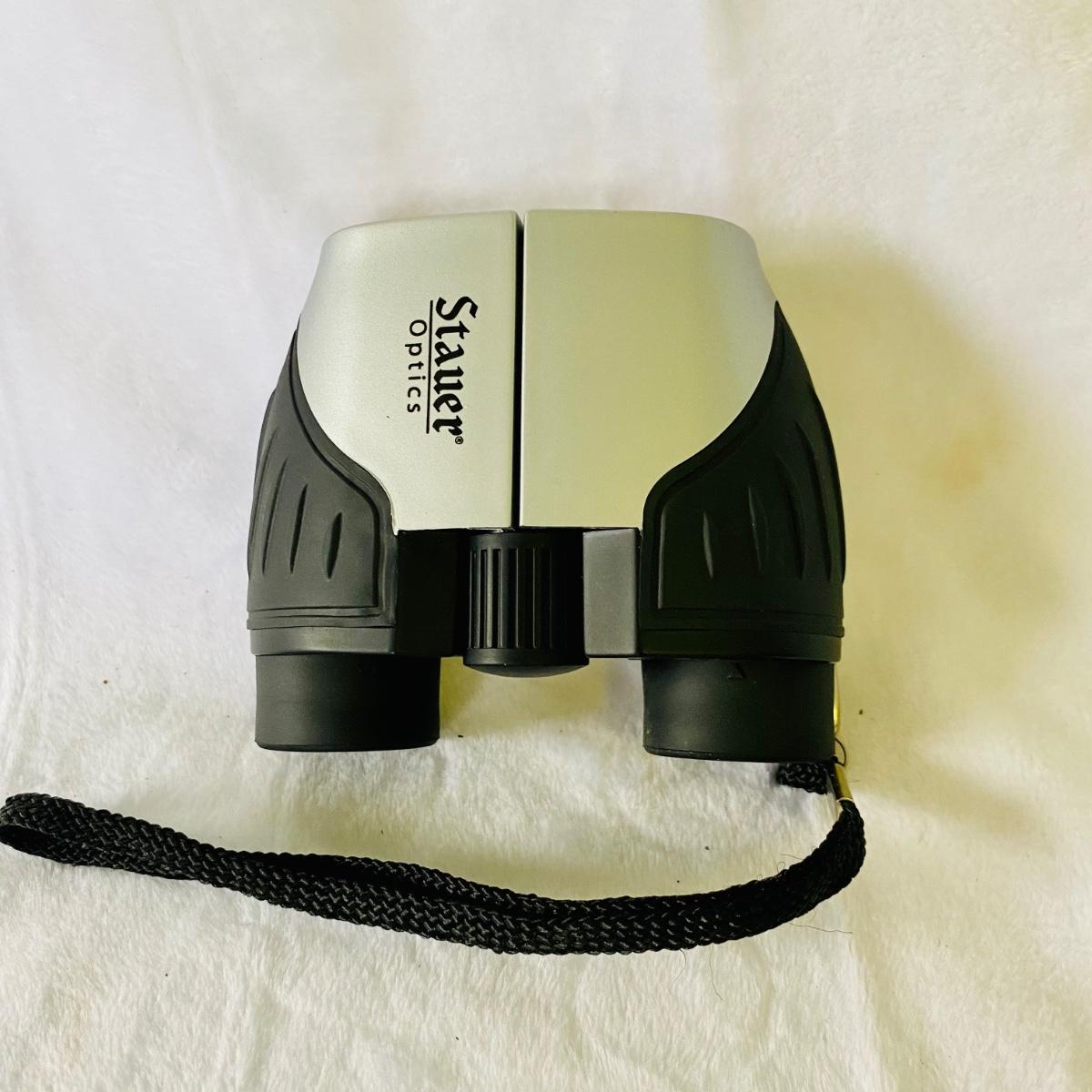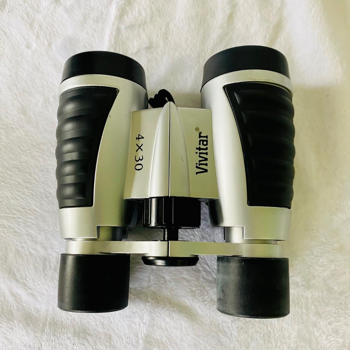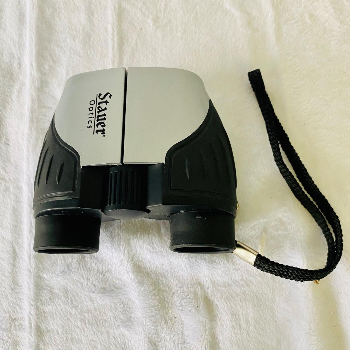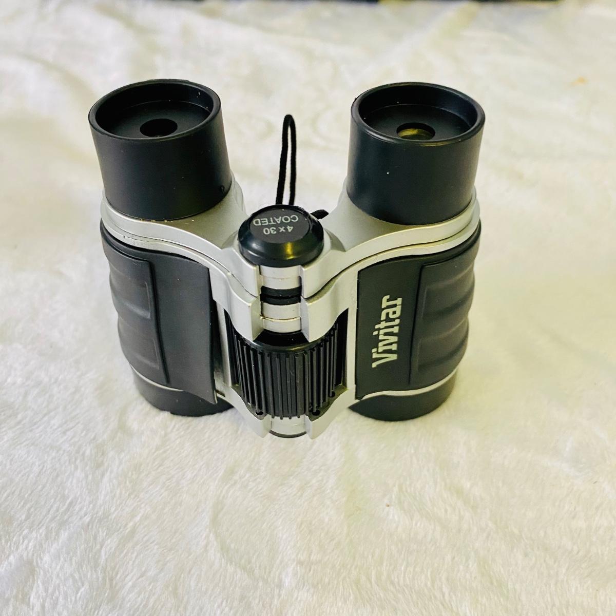 Two pairs of Vivitar binoculars. One pair measures 4.5”H and the other 3”H. Stauer pair measures 4”H. Each has a soft case. Good condition.