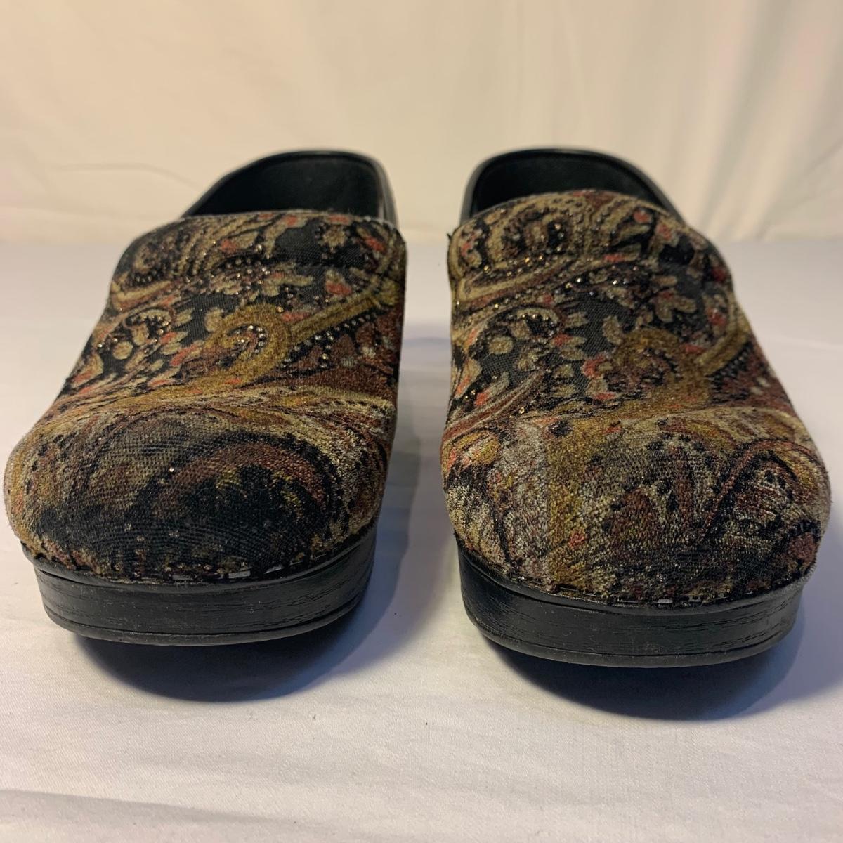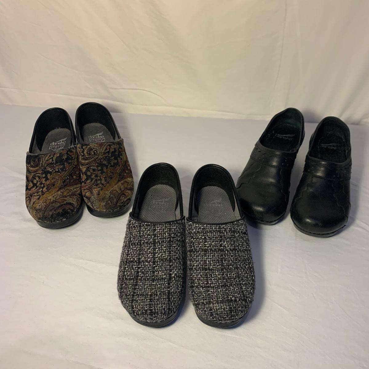 Three pairs of Dansko shoes, women’s size 38. All appear to be somewhat worn; the paisley pair a bit more worn than the others. Please see photos for inventory and condition details.