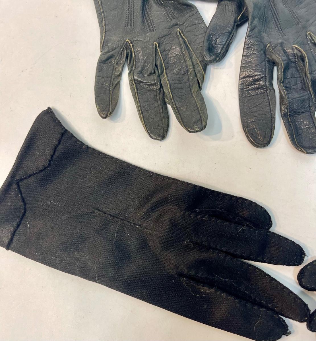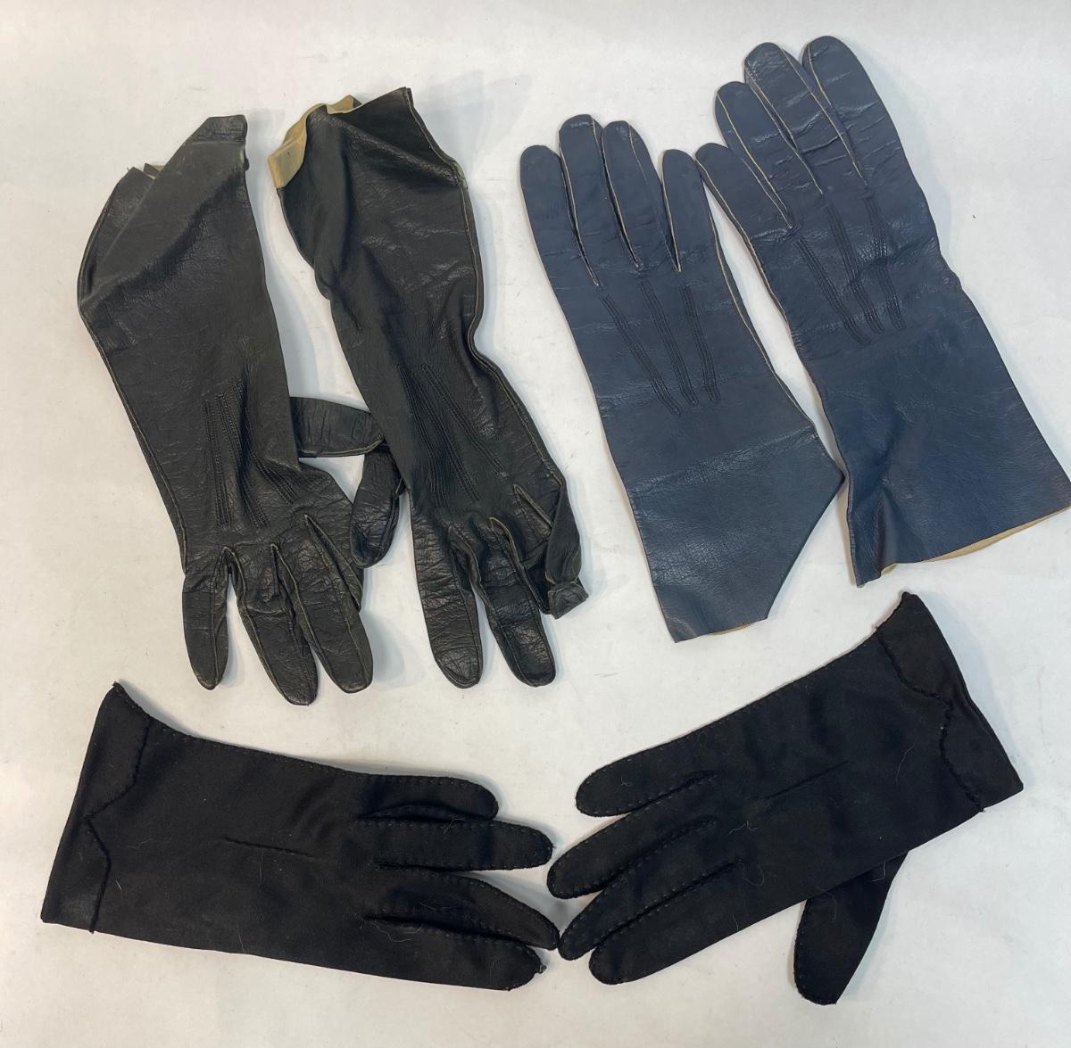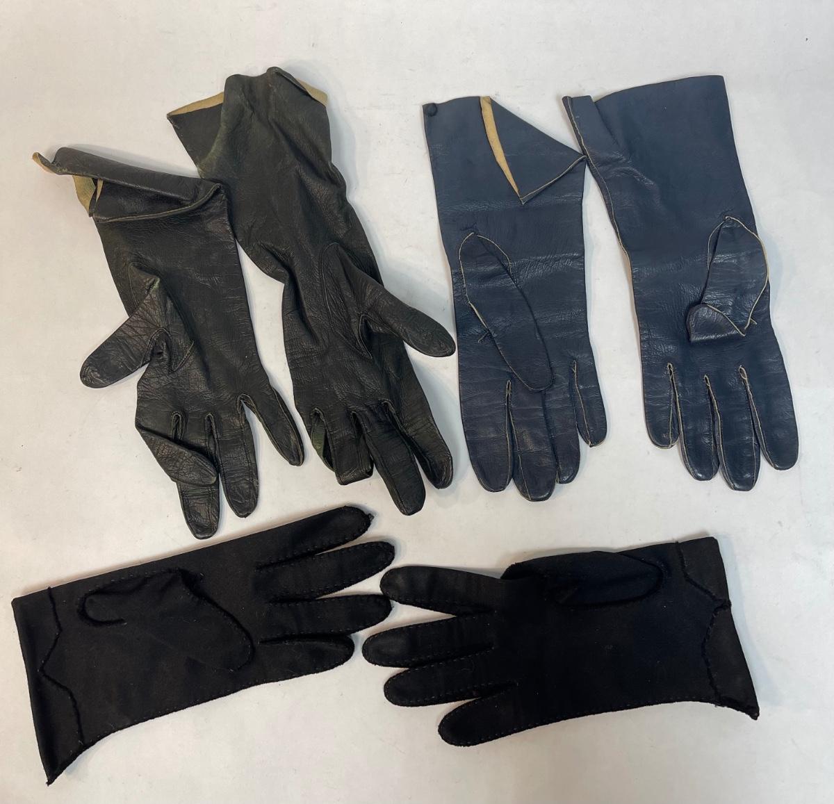 Two pairs of leather gloves, one blue & one black. One pair of black cloth gloves. All in good vintage condition.