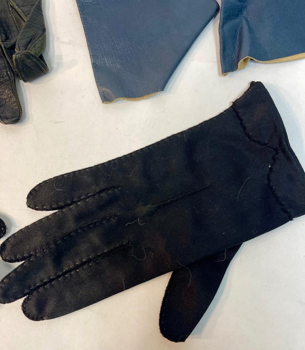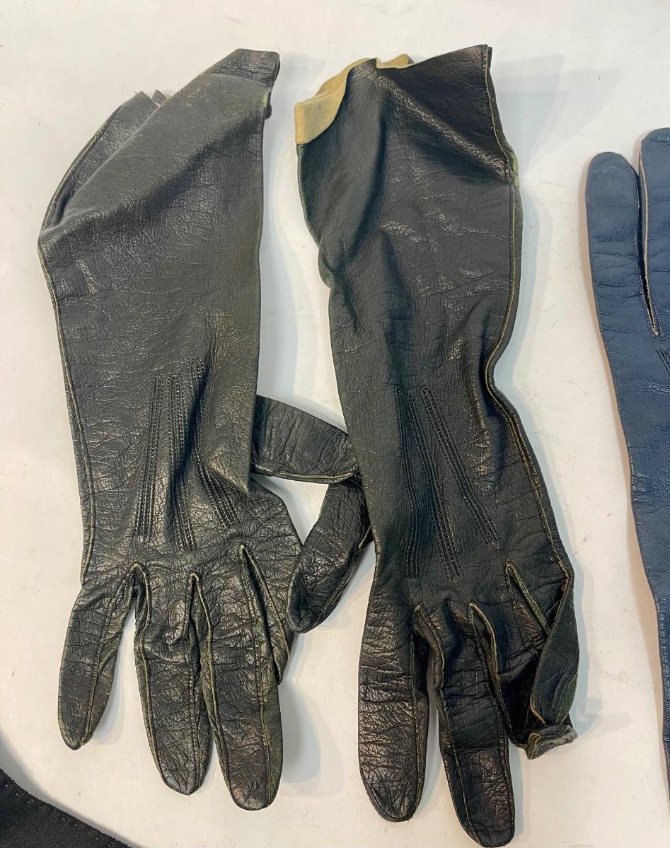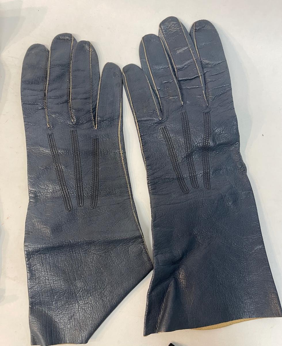 Two pairs of leather gloves, one blue & one black. One pair of black cloth gloves. All in good vintage condition.