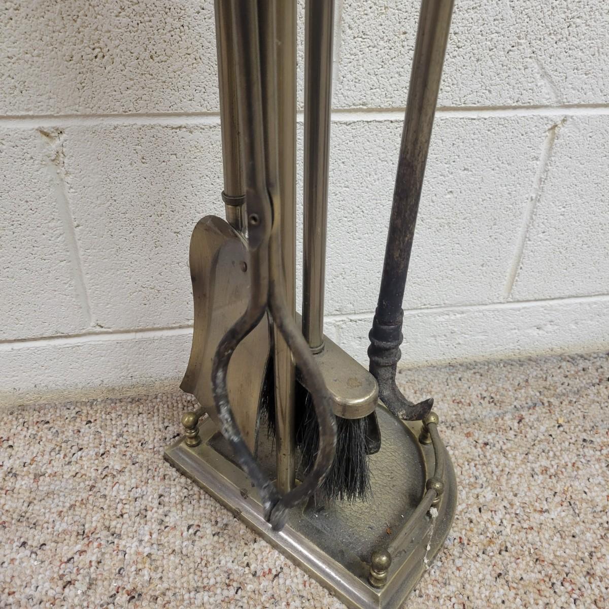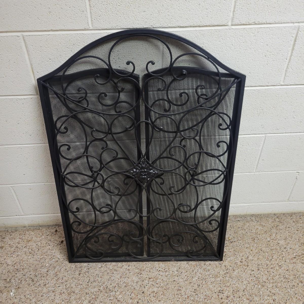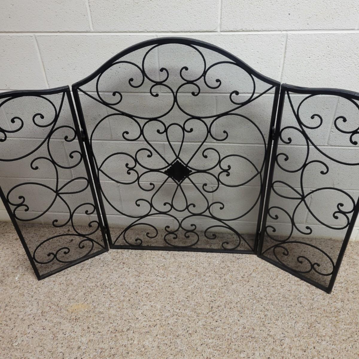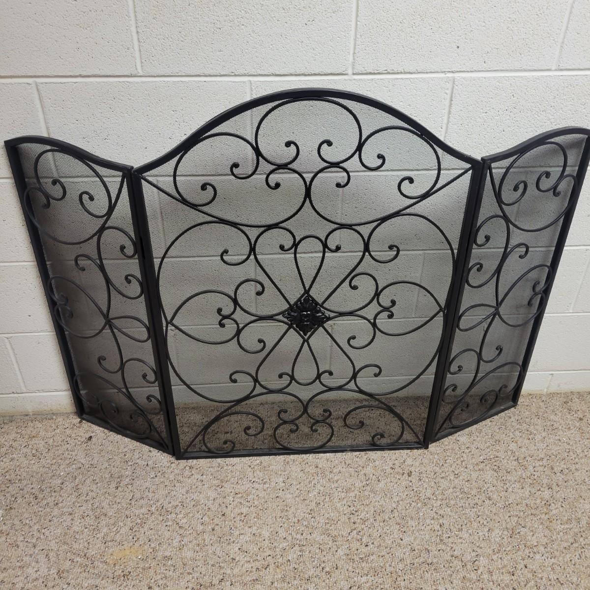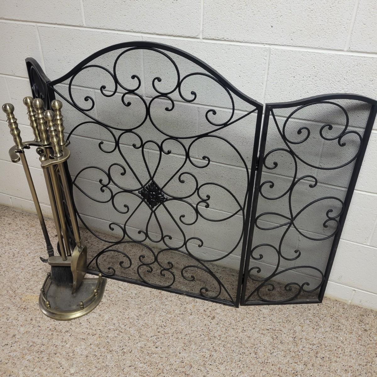 A fireplace screen and tools. Included is a wrought iron, three panel fireplace screen that measures approximately 50" x 36". Also included is a brass fireplace tool set with a poker, broom, shovel and log clamp. Measures approximately 10" x 8" x 30.5". Also includes a metal log holder that measures 12” x 22” x 13. Items are in good condition with some minor damage from use.