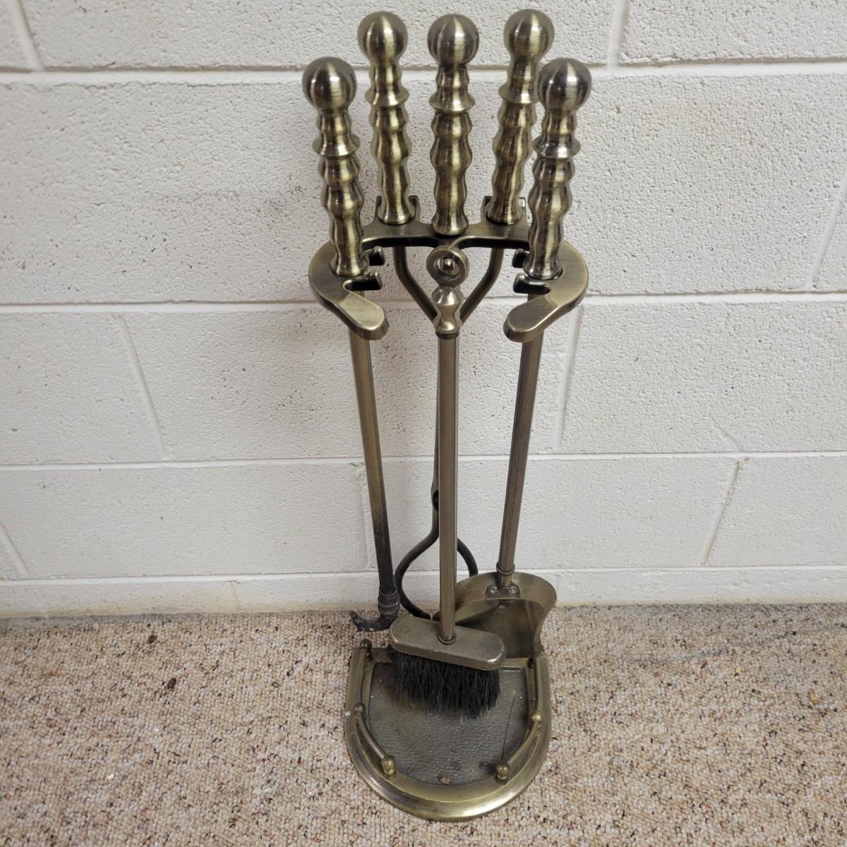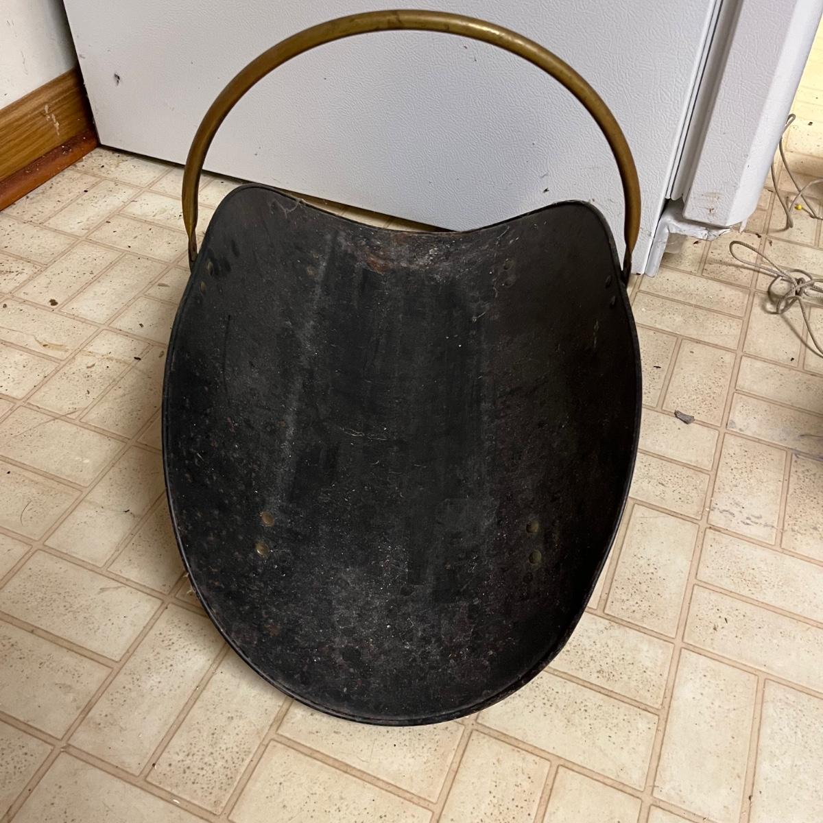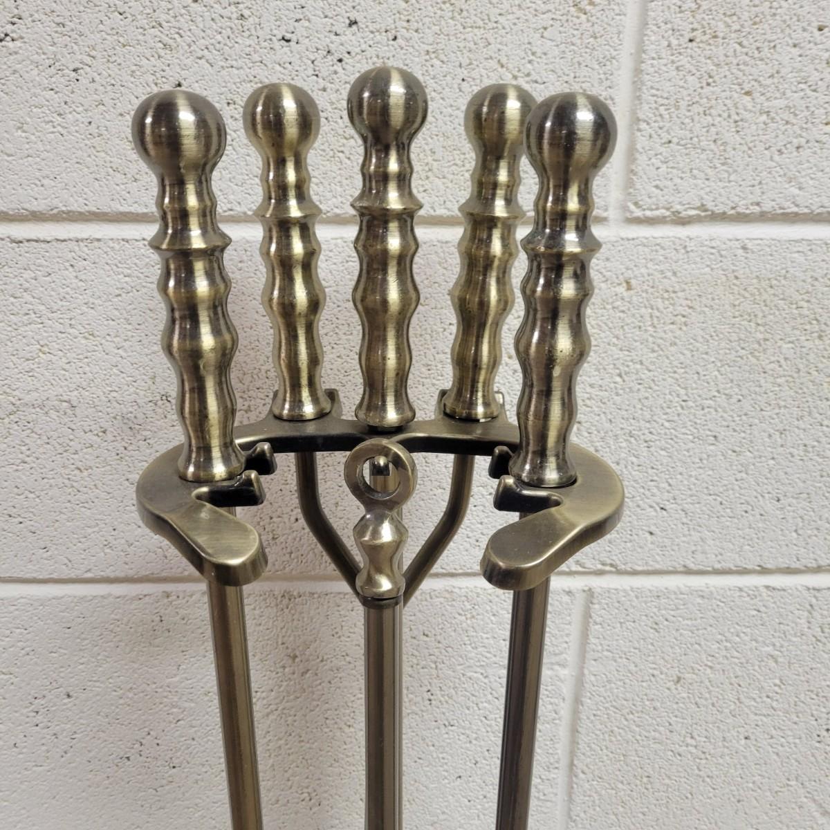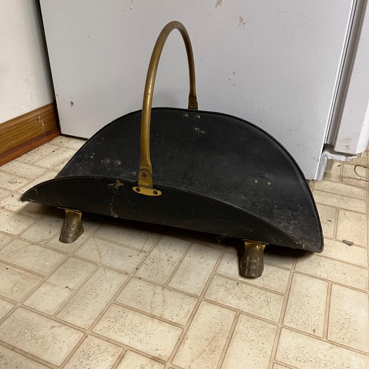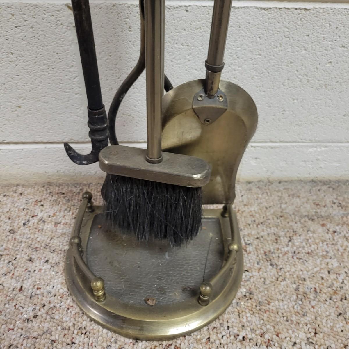 A fireplace screen and tools. Included is a wrought iron, three panel fireplace screen that measures approximately 50" x 36". Also included is a brass fireplace tool set with a poker, broom, shovel and log clamp. Measures approximately 10" x 8" x 30.5". Also includes a metal log holder that measures 12” x 22” x 13. Items are in good condition with some minor damage from use.