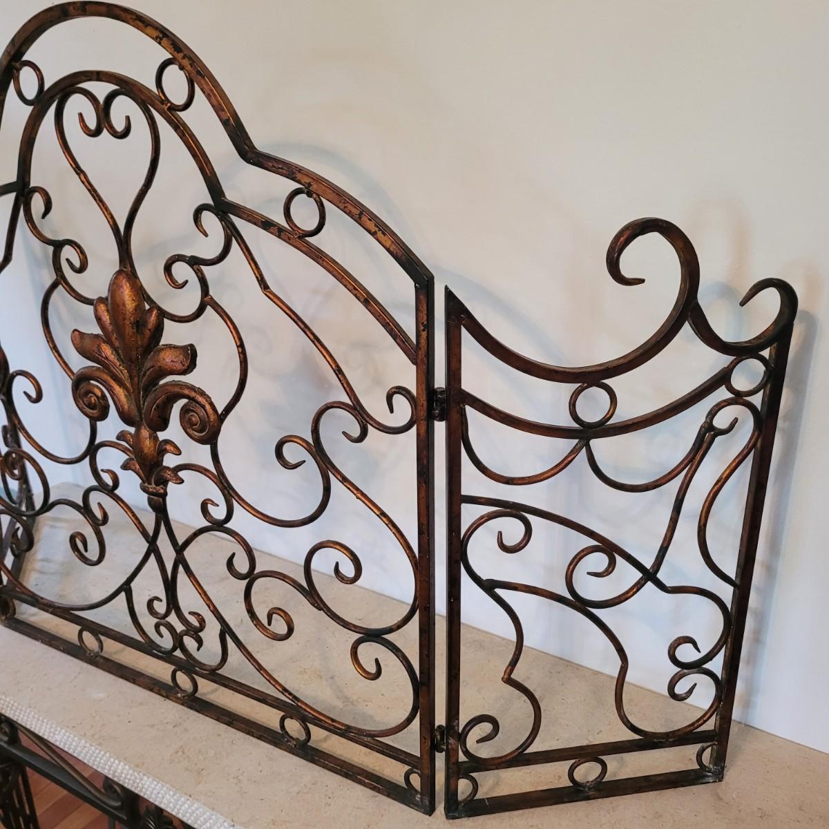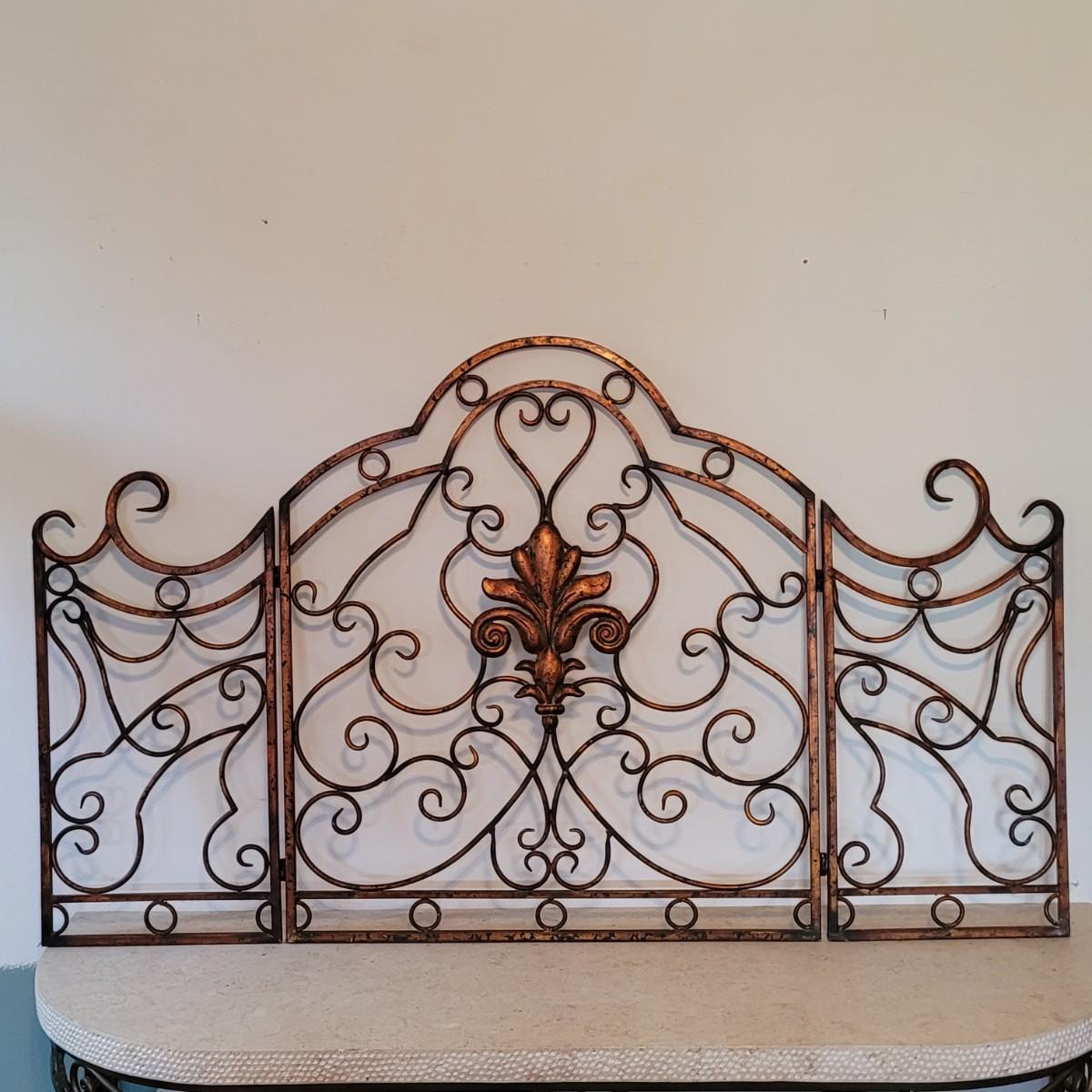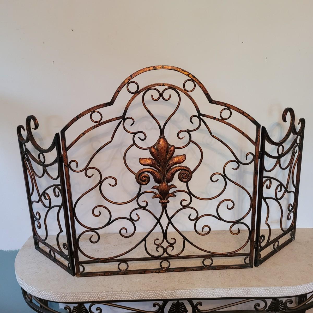 This lot includes one ornate metal three panel fireplace screen protector. It appears to be made from steel and painted to look like copper. It features three folding panels with swirling vines throughout. The center panel displays a fleur-de-lis in its middle. When open, the screen measures 55.5" x 33"H.