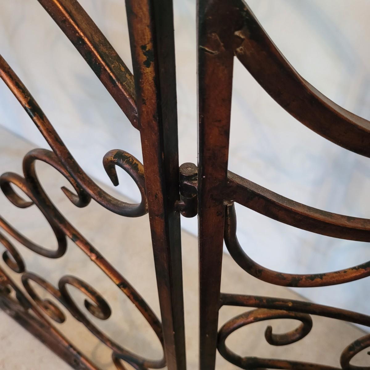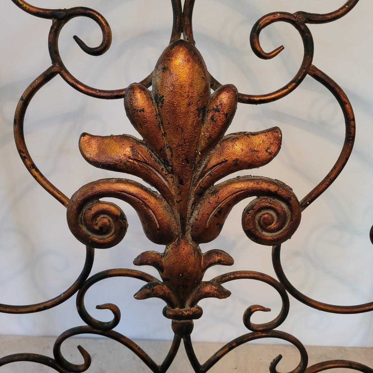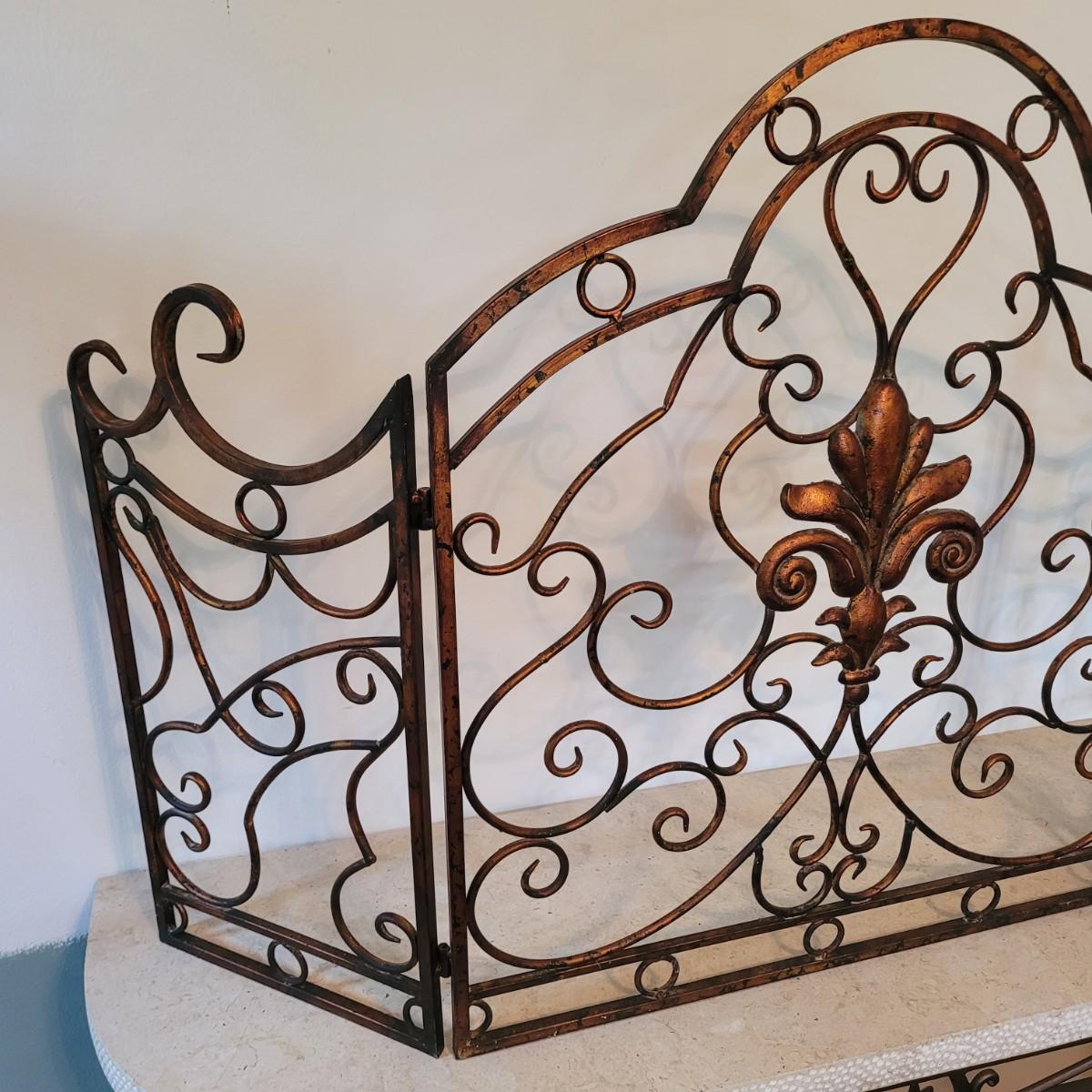 This lot includes one ornate metal three panel fireplace screen protector. It appears to be made from steel and painted to look like copper. It features three folding panels with swirling vines throughout. The center panel displays a fleur-de-lis in its middle. When open, the screen measures 55.5" x 33"H.