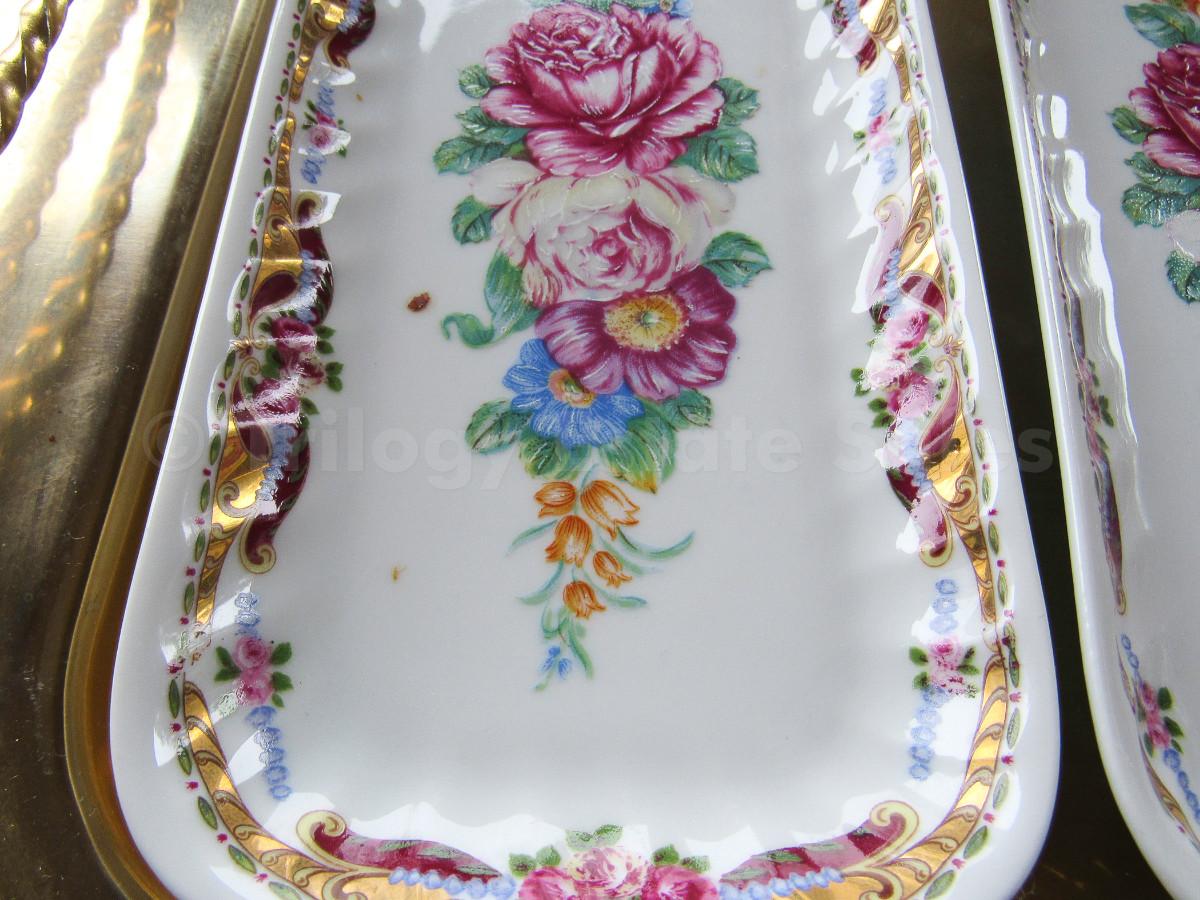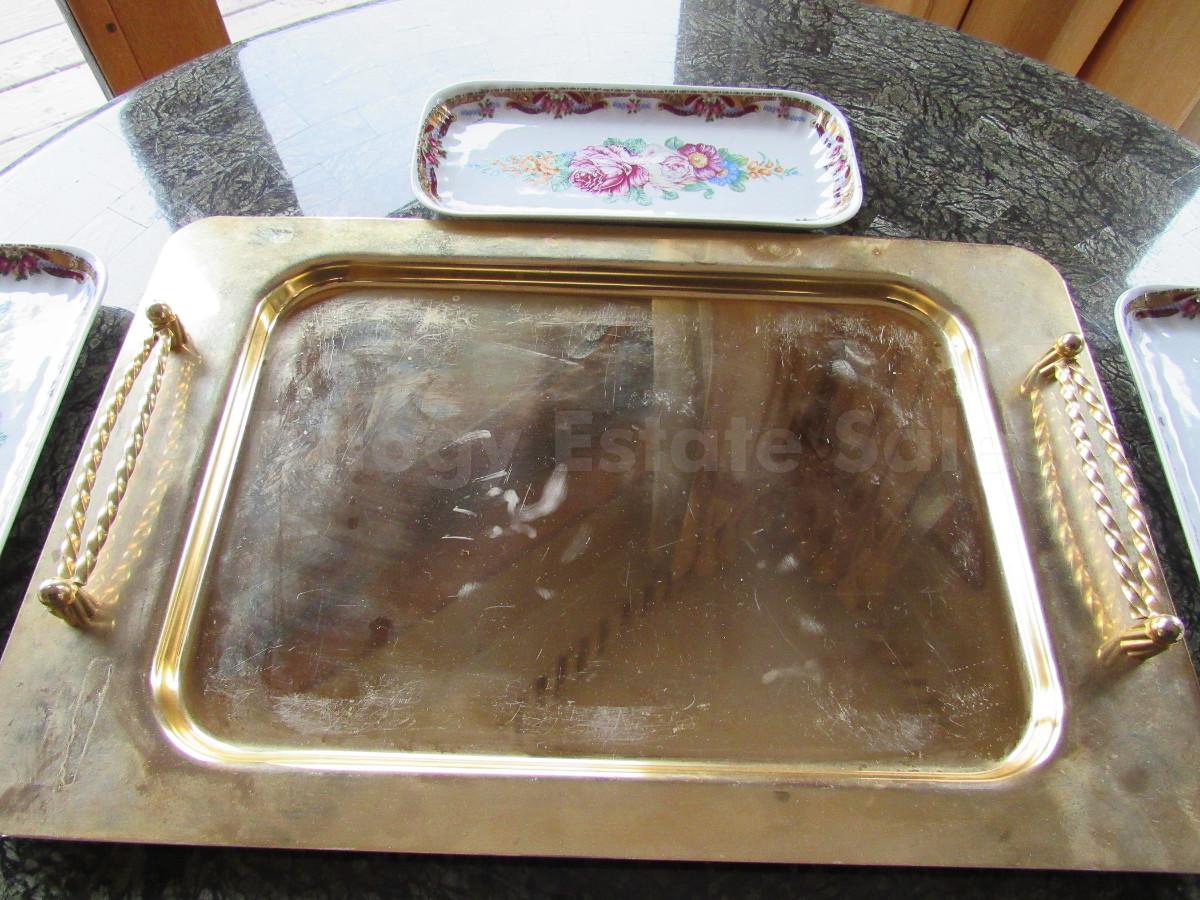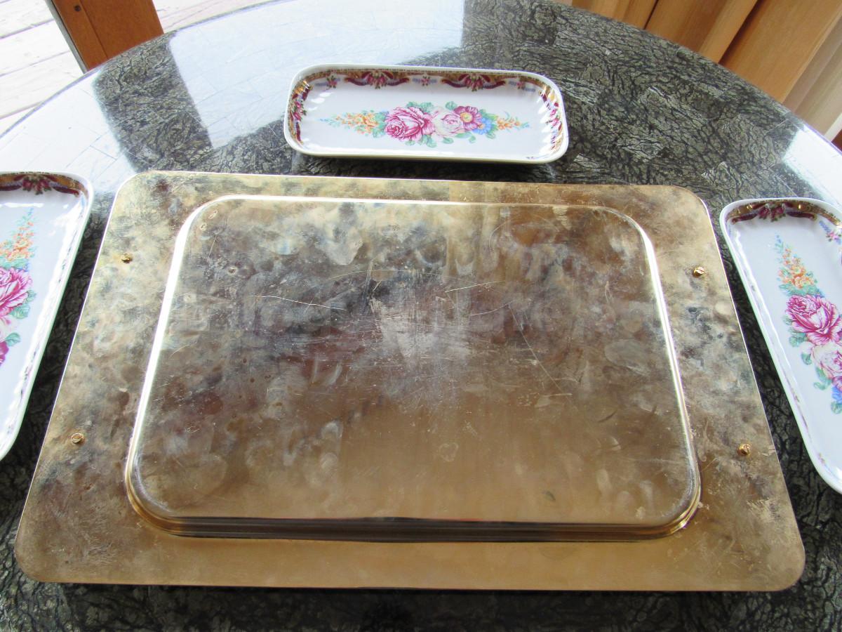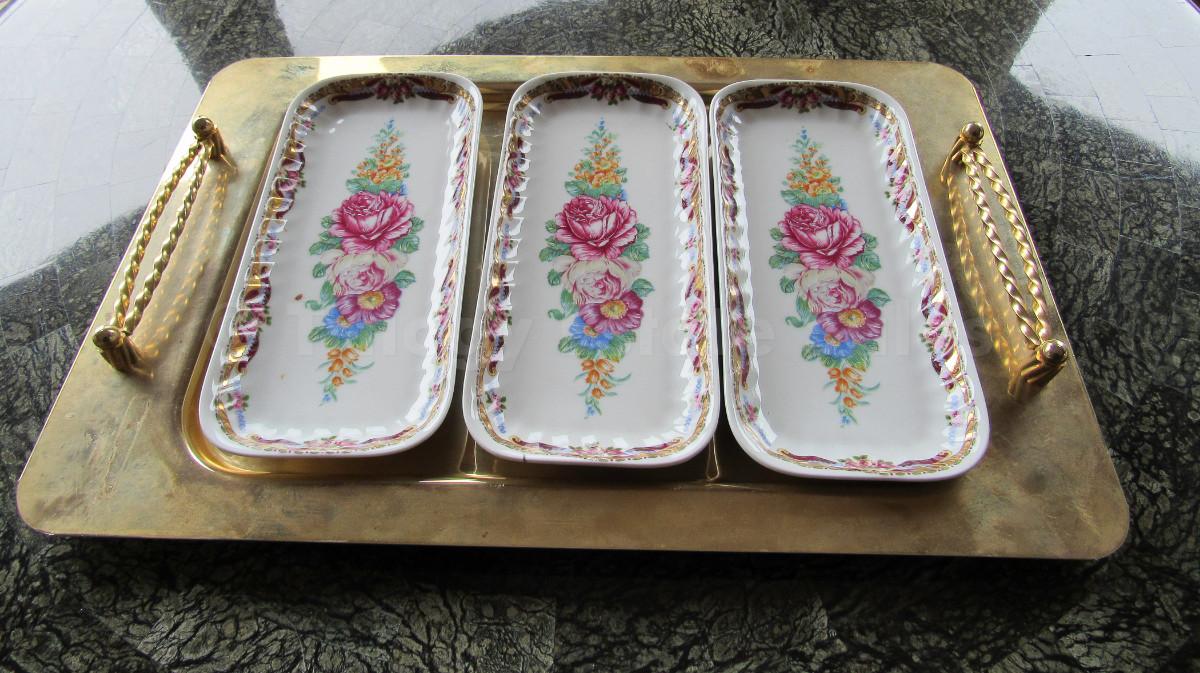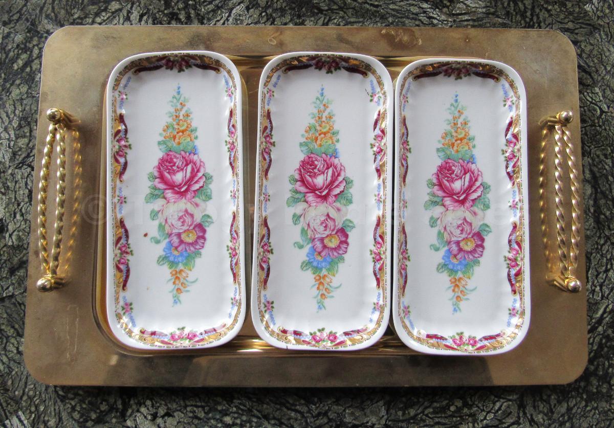 Gold tone tray with 3 porcelain flowered insert trays. Vizavi porcelain 3.75” x 8.25”; tray is 15.75” length x 10.25” wide