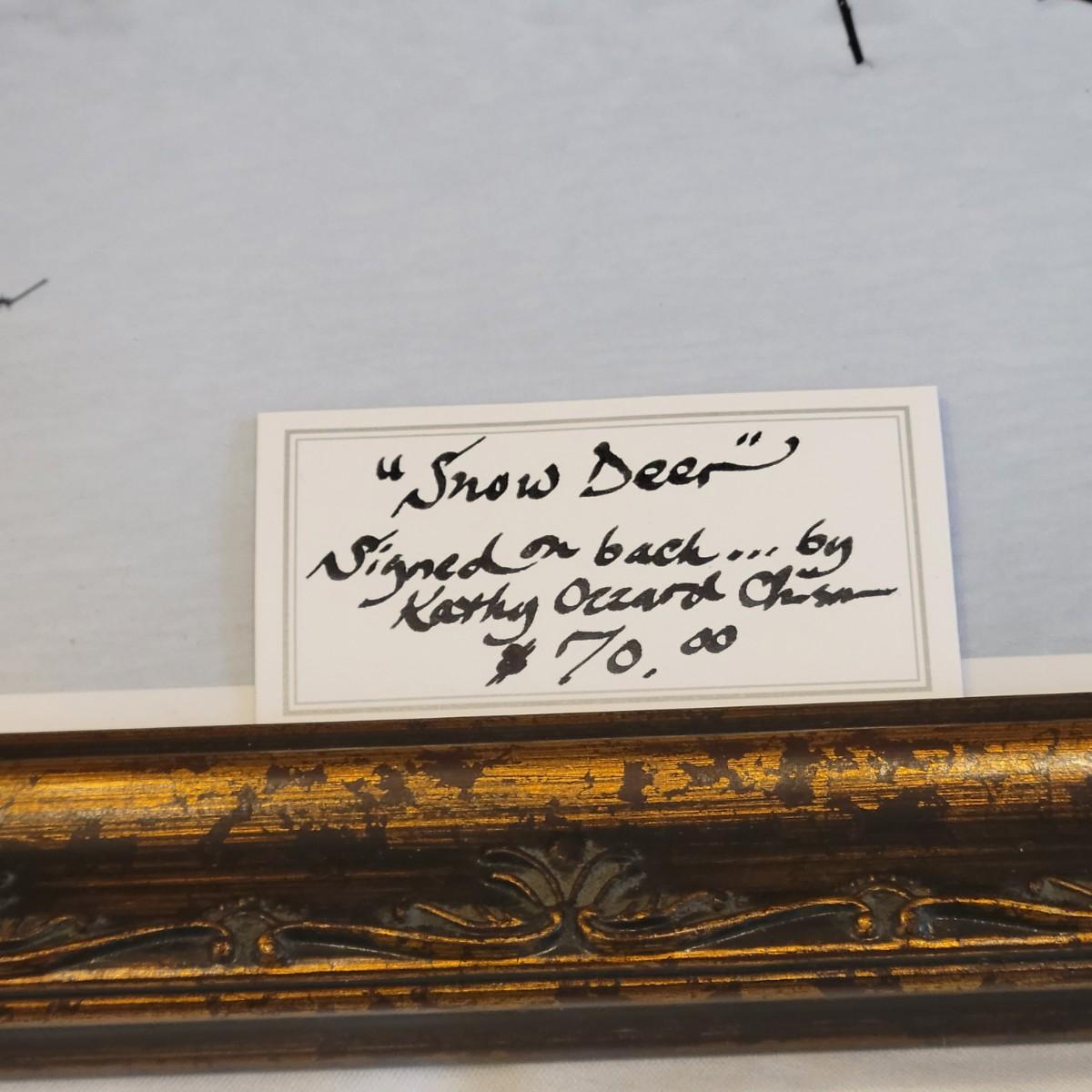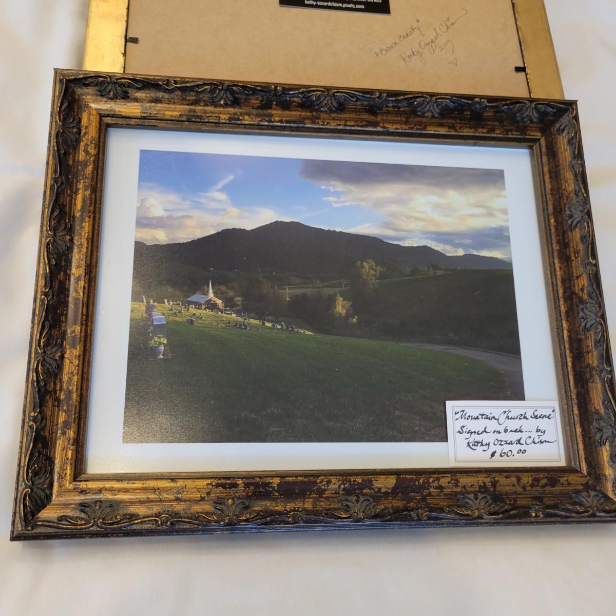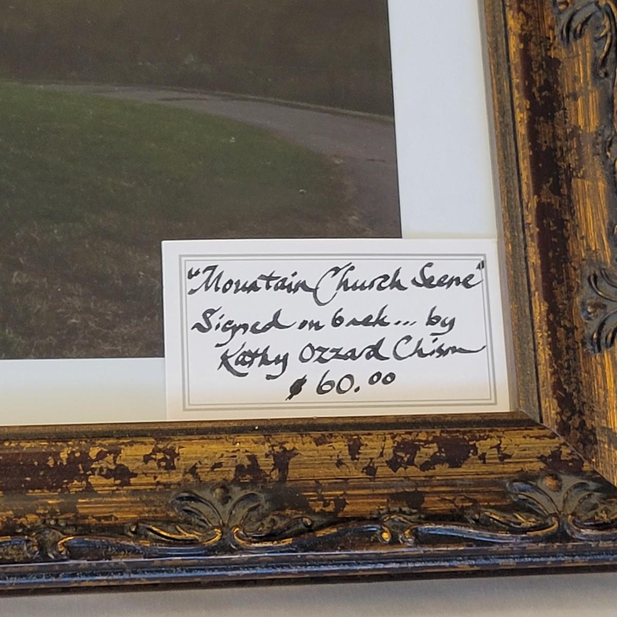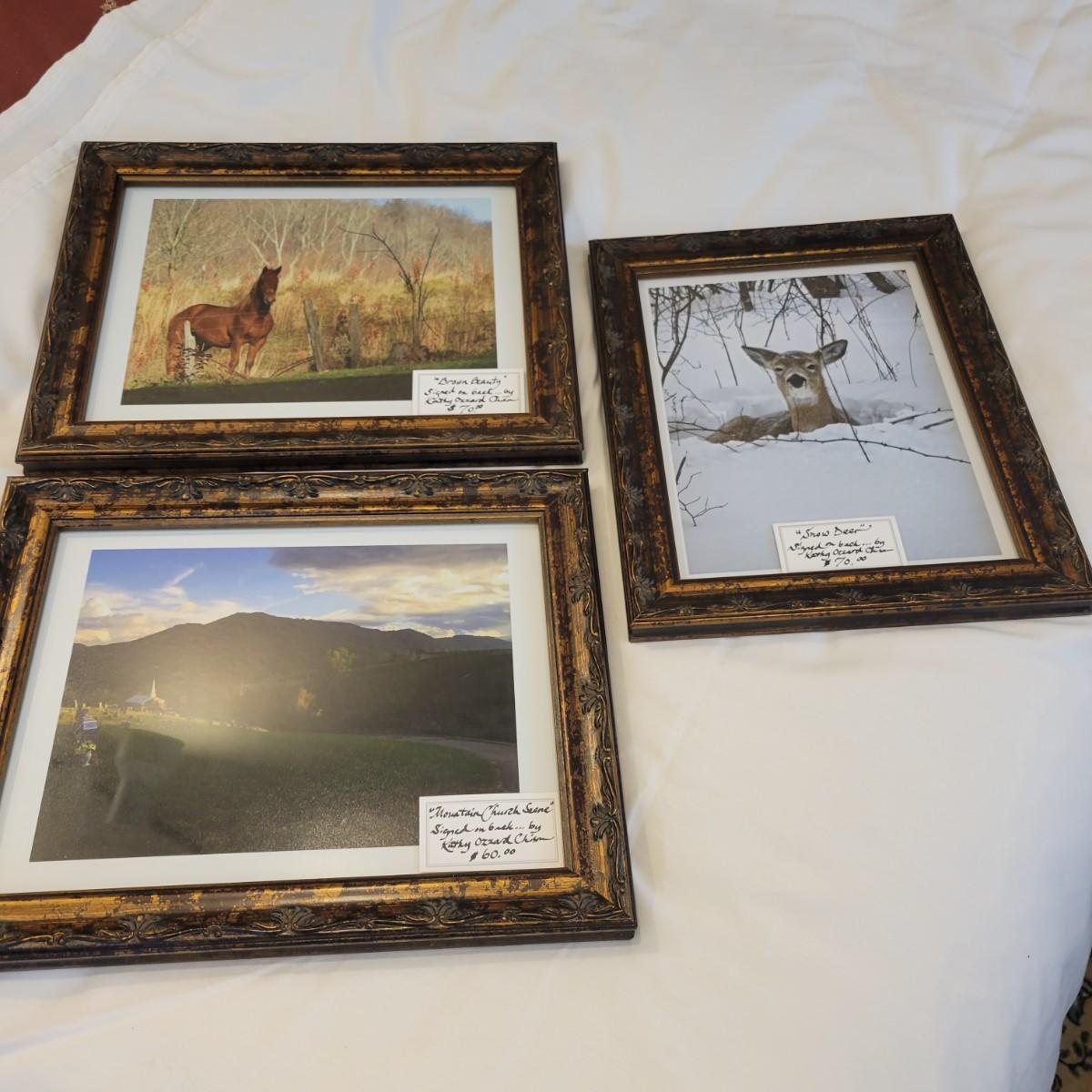 Three pen signed photographs by local photographer Kathy Ozzard Chism. Included is "Brown Beauty", Snow Deer" and "Mountain Church Scene". All three are framed in matching wood frames with a bronze colored finish and measure approximately 14.5" x 11.5"H. Shipping available. Shipping can be costly. We suggest contacting our preferred local shipping provider, Postage Express, with dimensions and getting an estimate before bidding: (828) 670-5501 or postageexpress@yahoo.com.