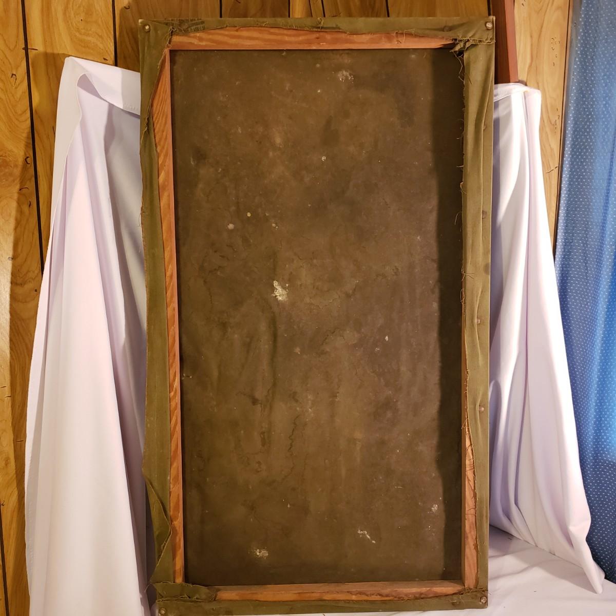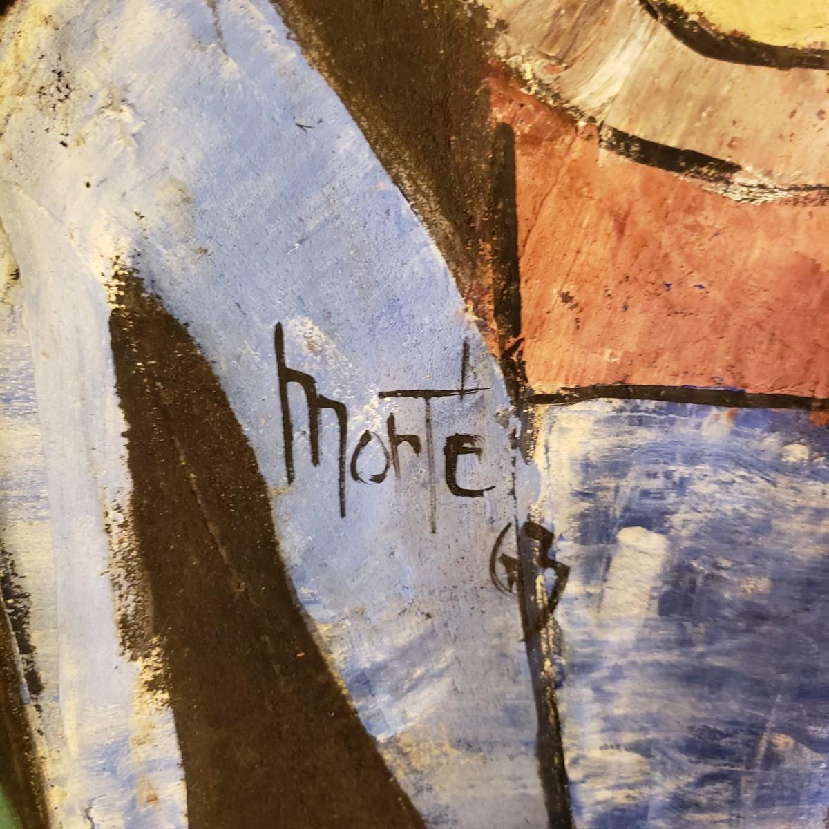 This painting featuring three people in a band with Morte signed on it is canvas on a wooden frame. The canvas is tacked onto the frame, see pictures. The frame measures approximately 24" x 43".