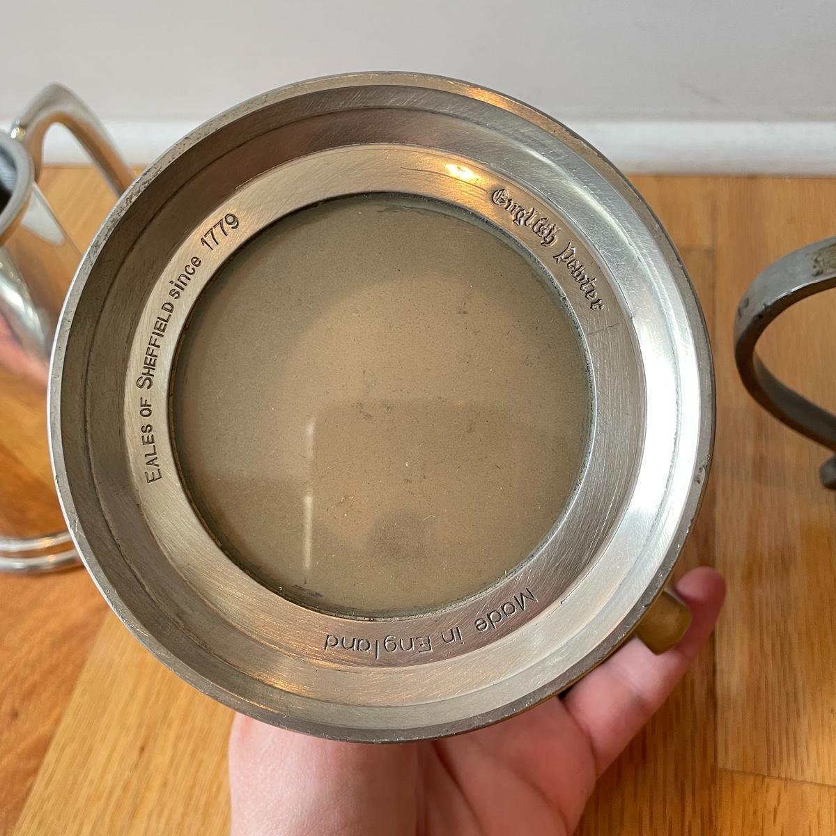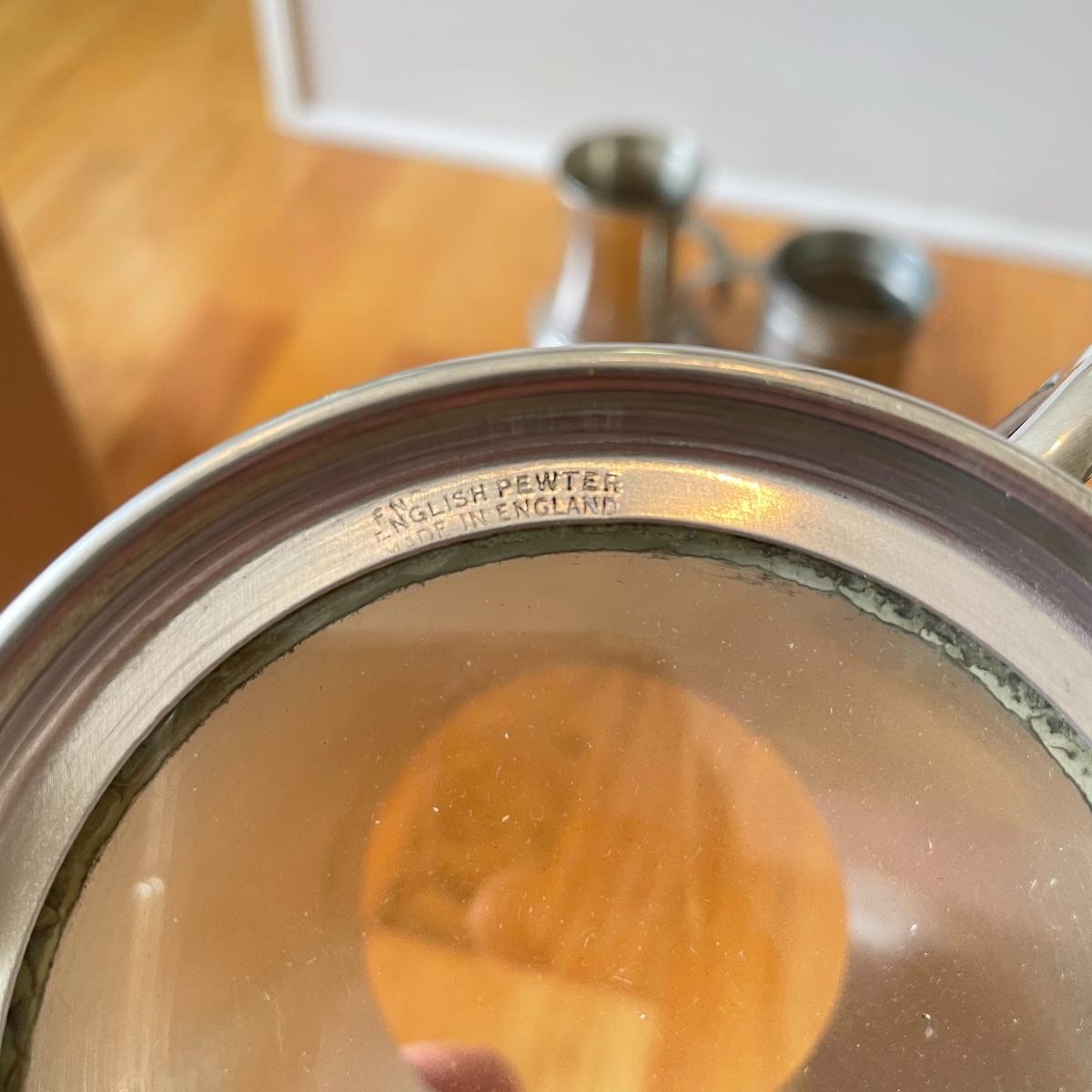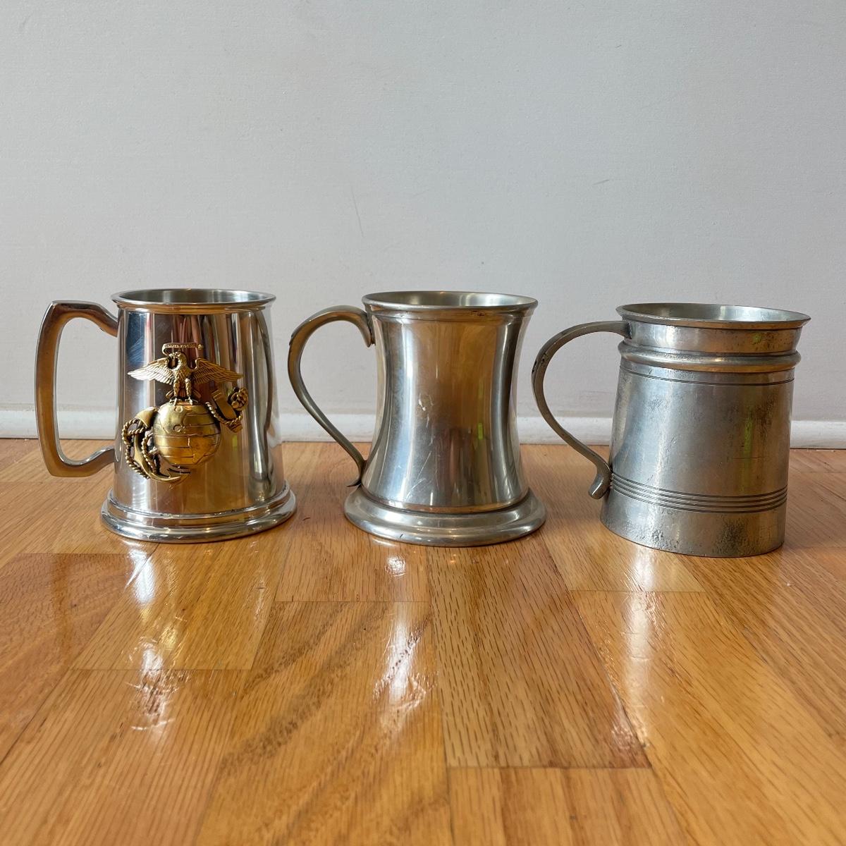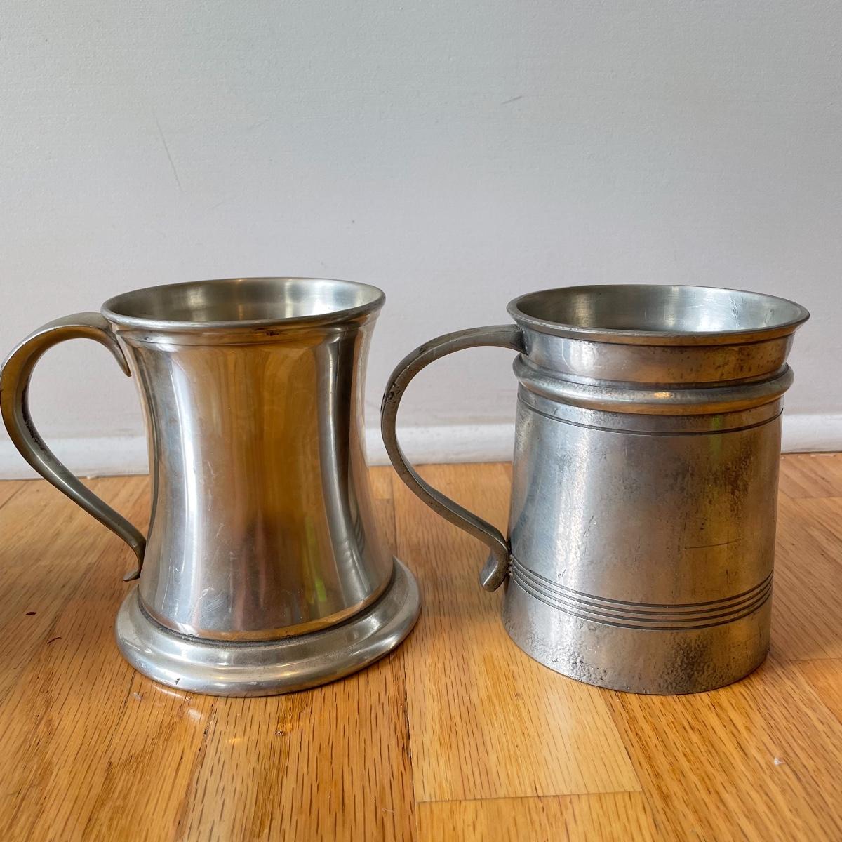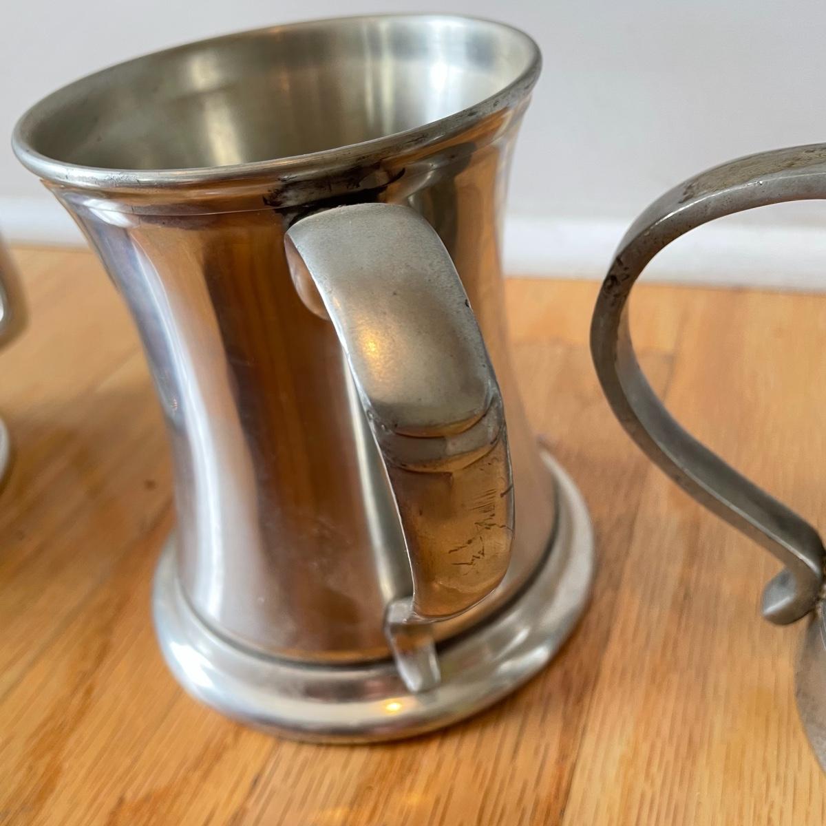 Two glass bottom pewter mugs both made with English Pewter, one marked Eales of Sheffield. All three around about 4.5” tall. Shipping available.
