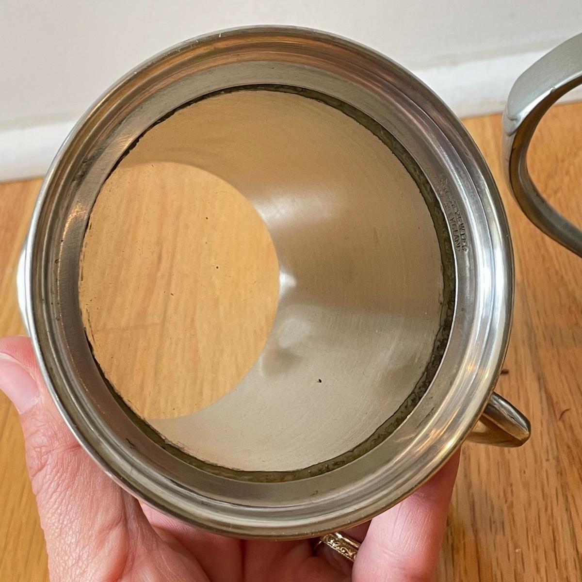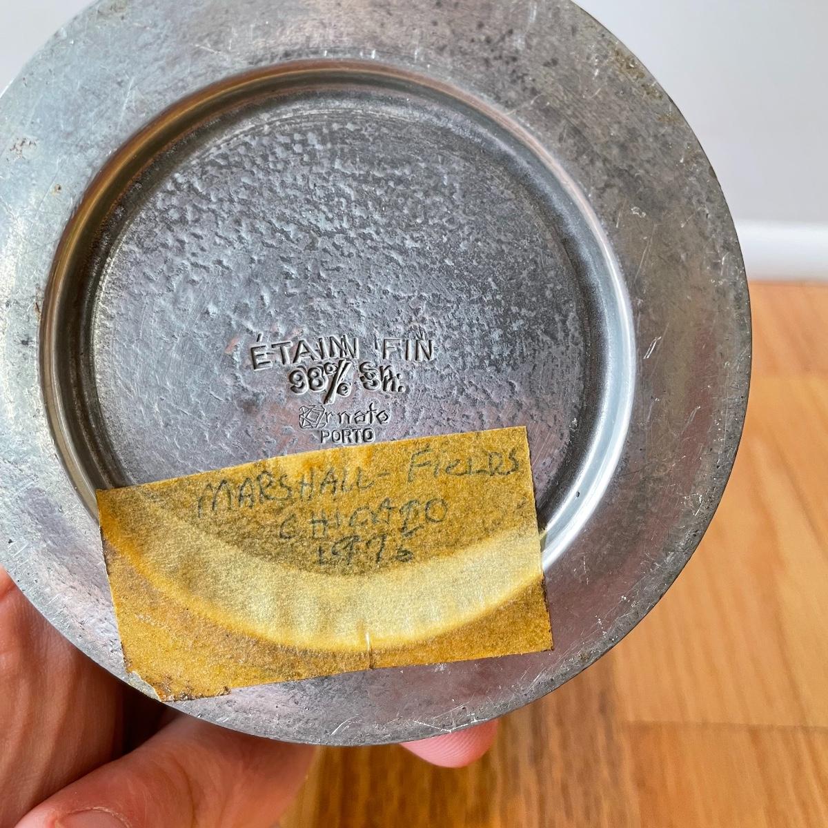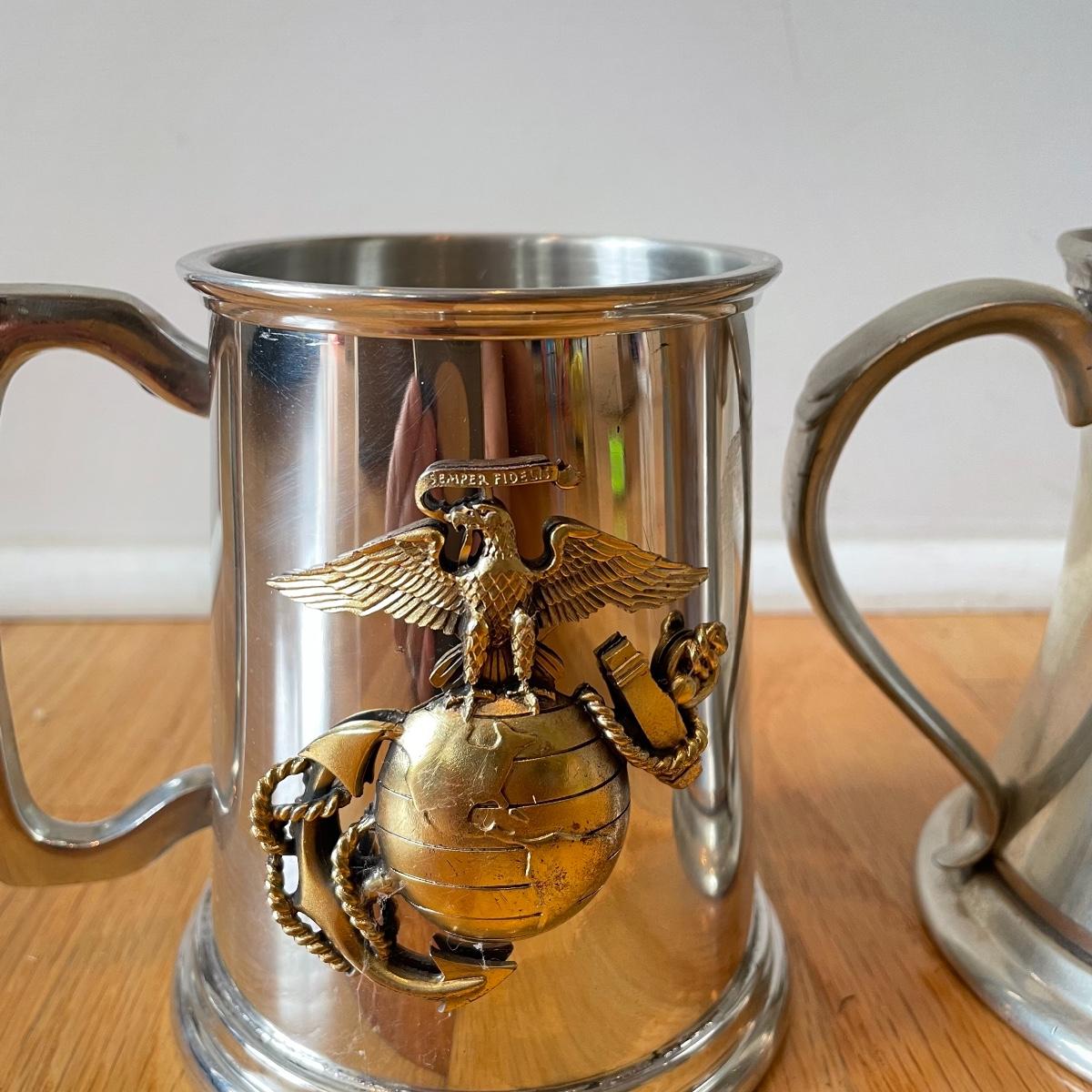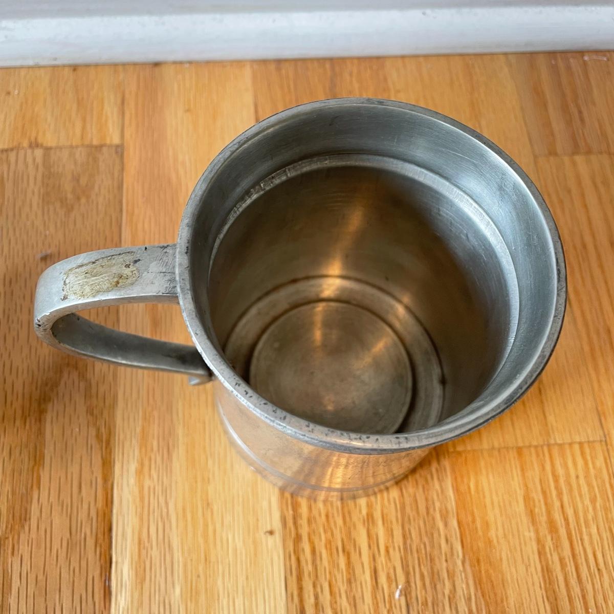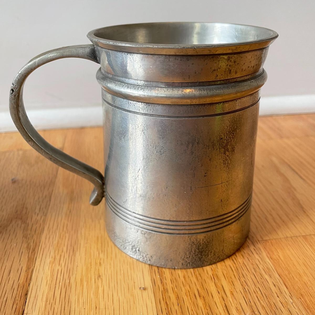 Two glass bottom pewter mugs both made with English Pewter, one marked Eales of Sheffield. All three around about 4.5” tall. Shipping available.