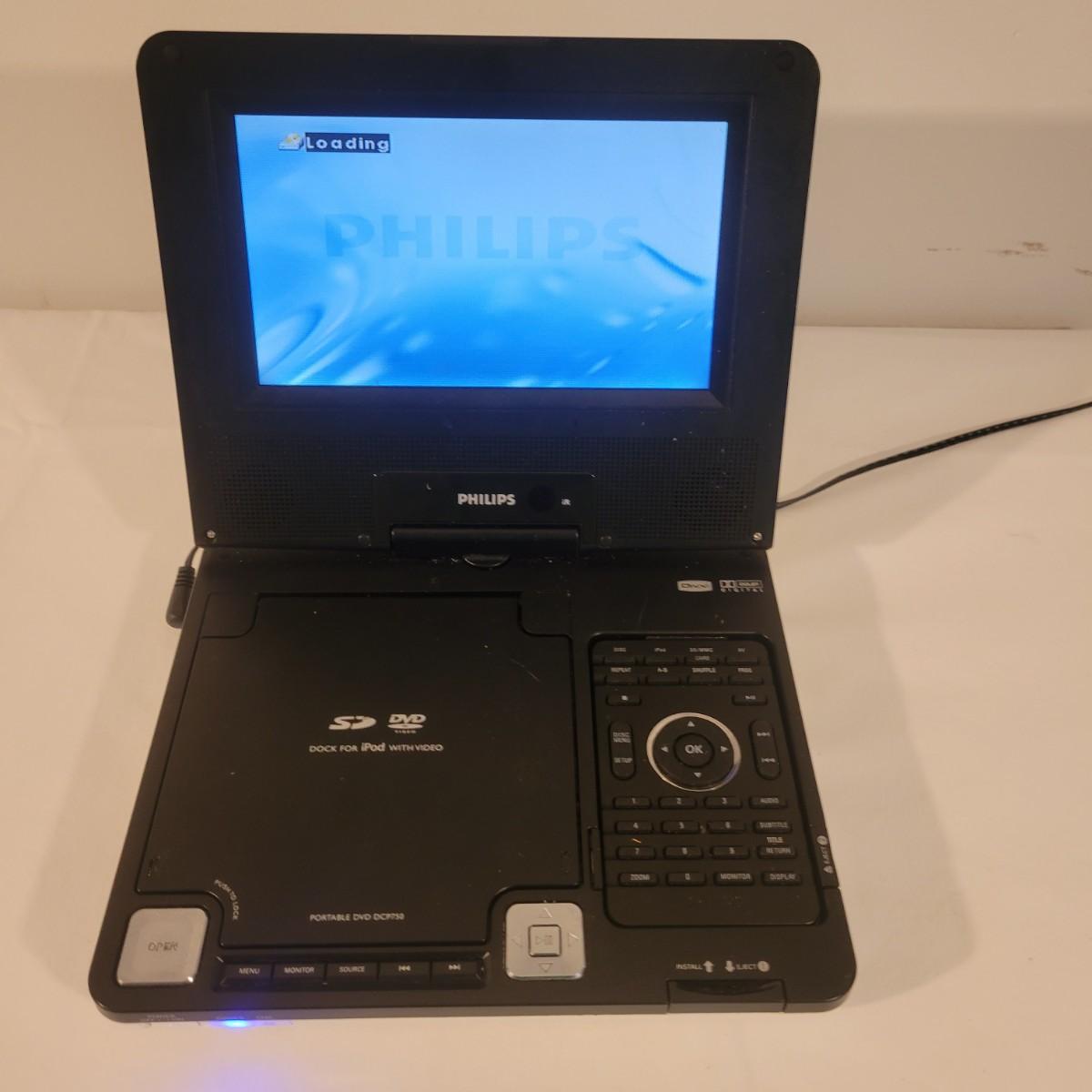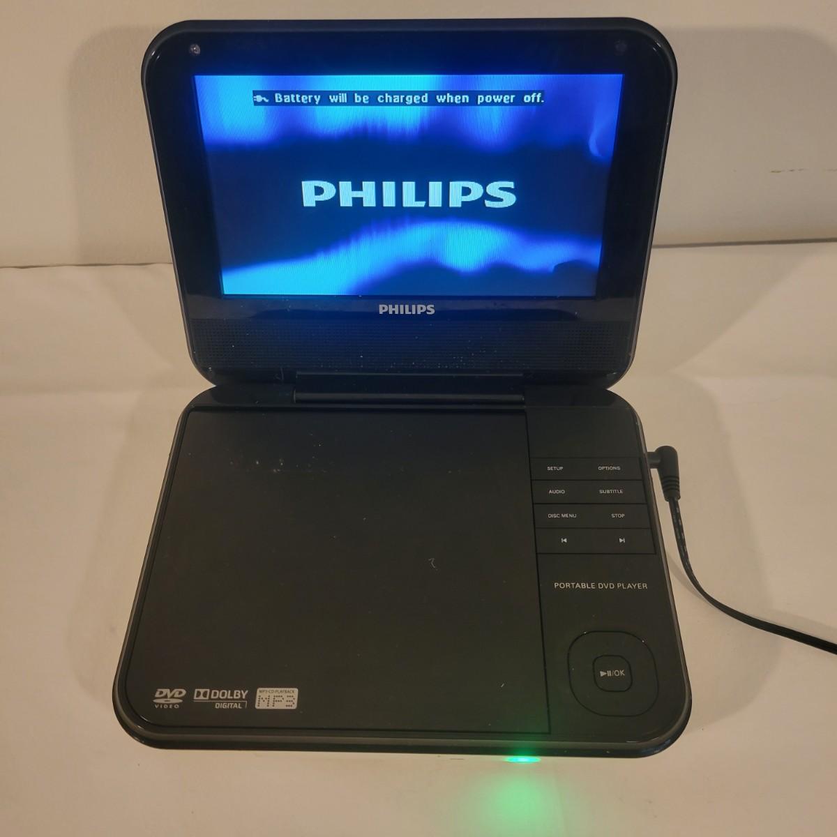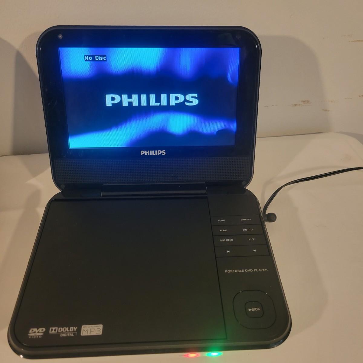 Three Phillips portable DVD players with car adapter power cords. All players have been tested and powered on. Overall, they are in good shape, but the outside of one has been doodled on. Lot also includes 3 sets of dual source, IR stereo headphones. These are battery powered and were not able to be tested. Shipping available
