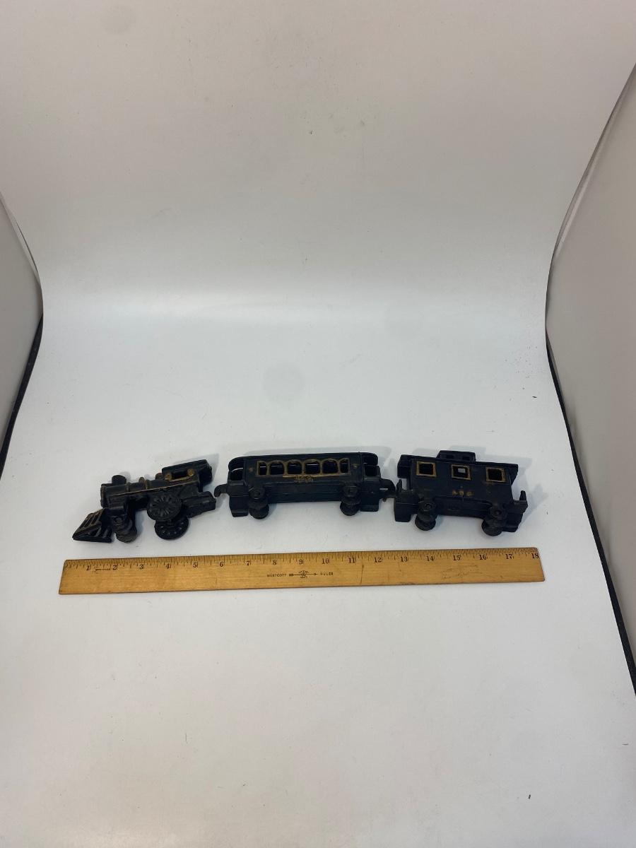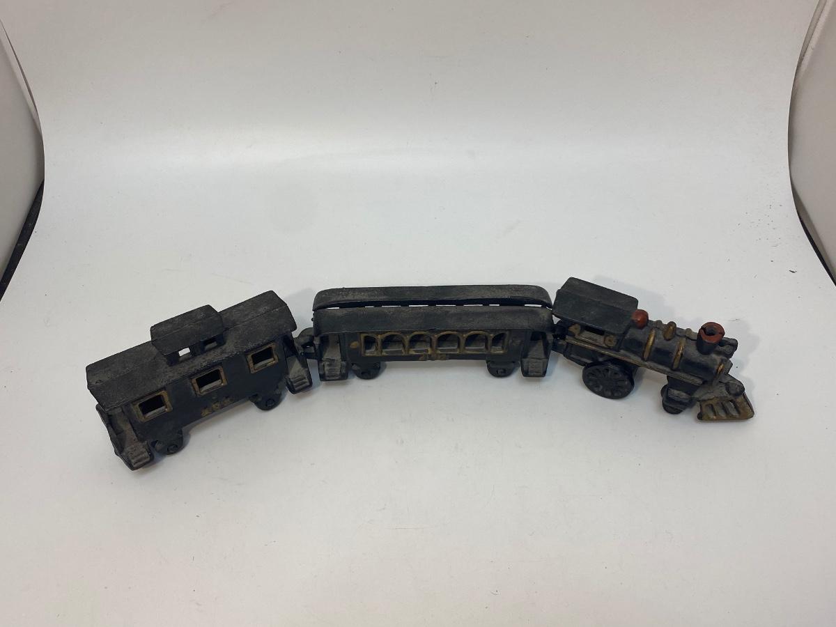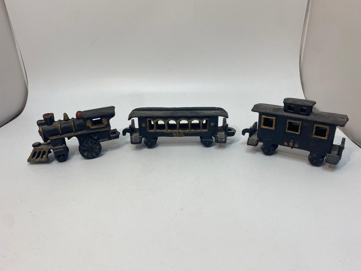 Three Piece Cast Iron Train Set. Engine, passenger car, and caboose. The can bee hooked together, wheels turn but not well. Gold accent paint on trim. Could not find any maker mark or name on pieces. About 6" length per car.