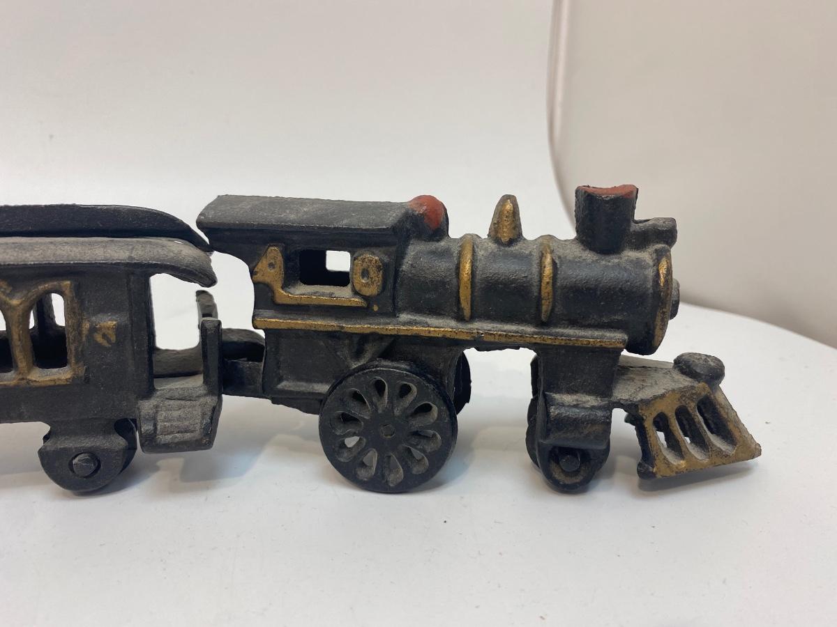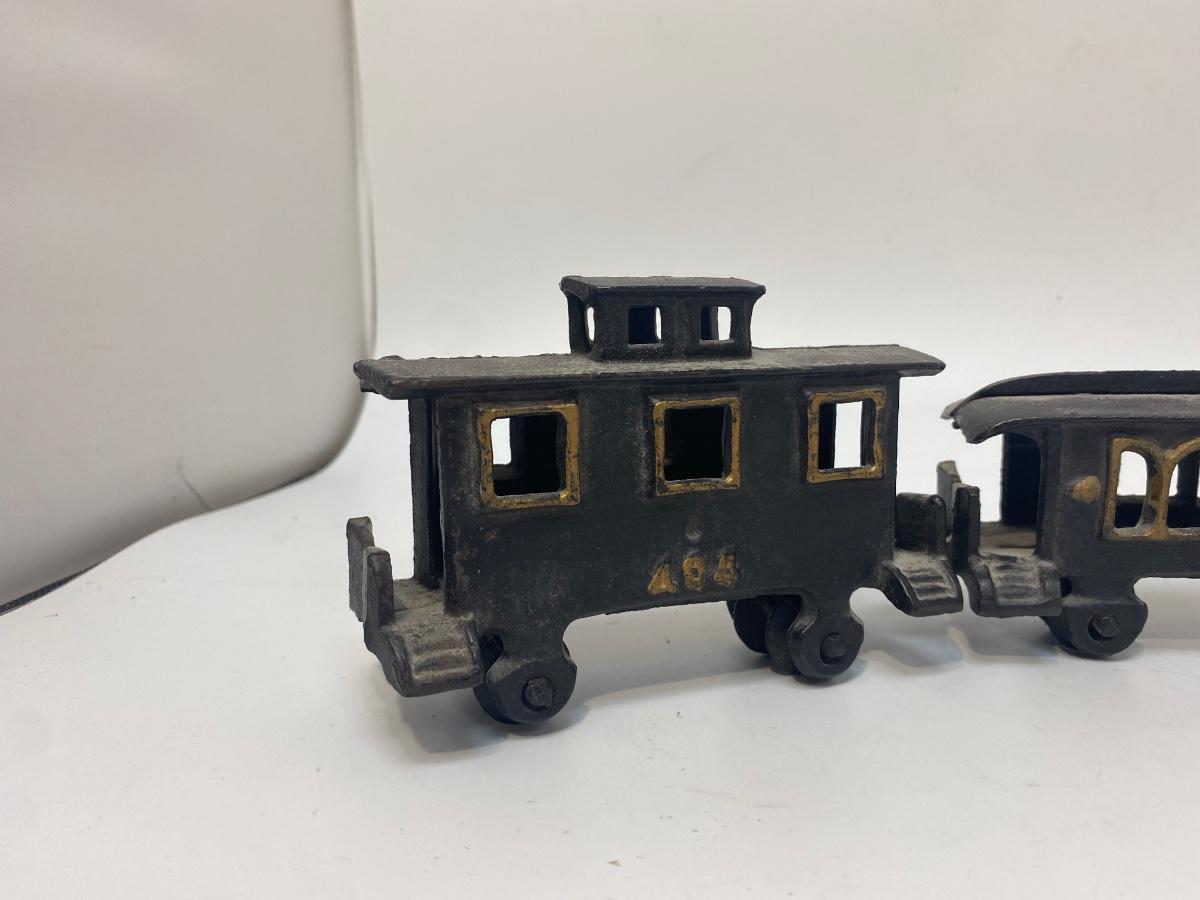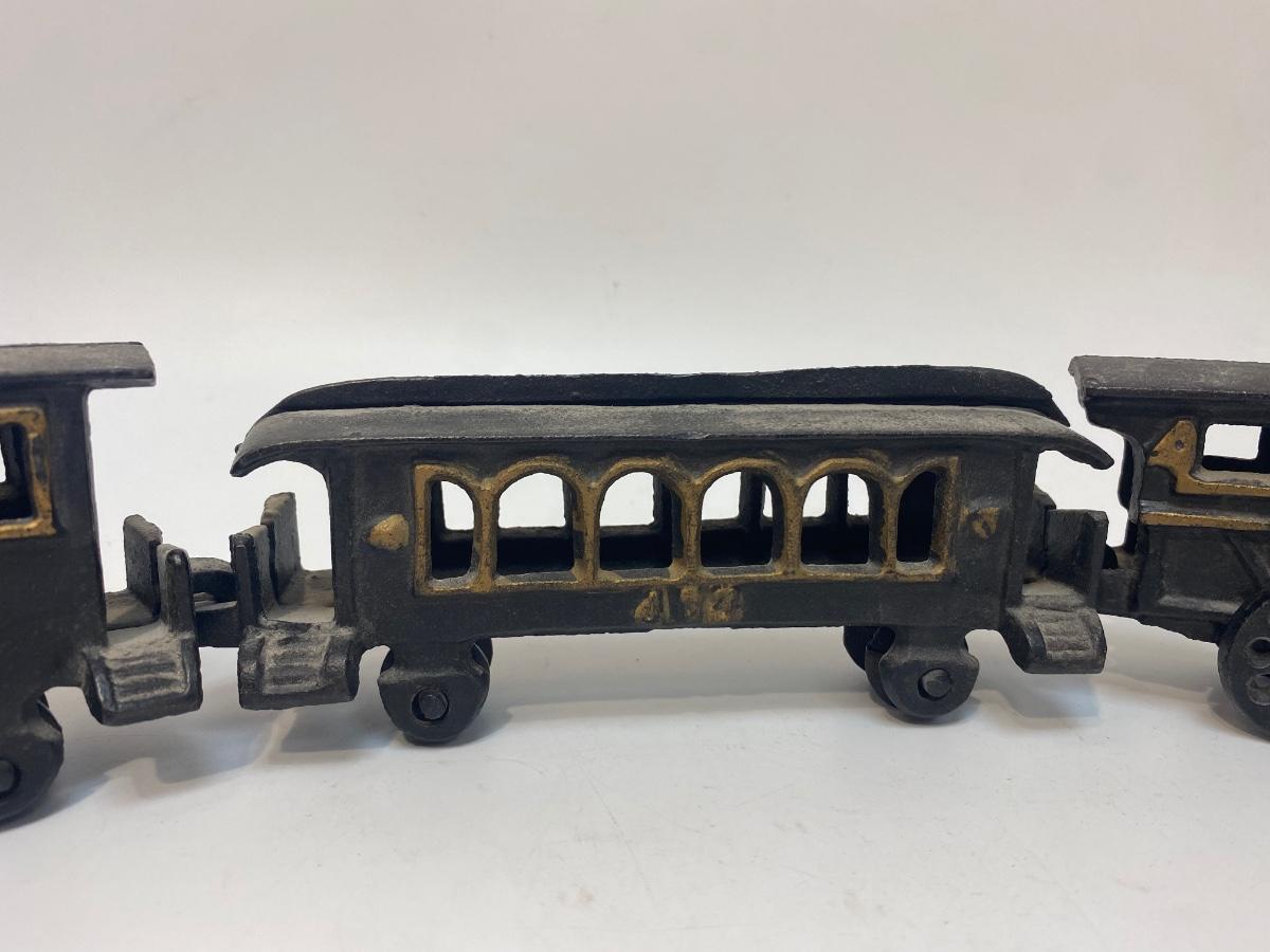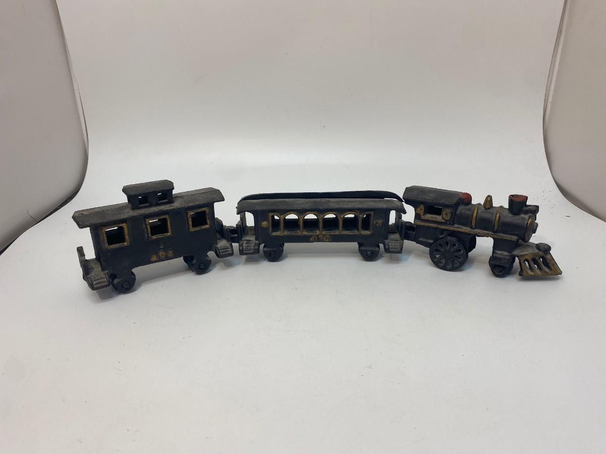 Three Piece Cast Iron Train Set. Engine, passenger car, and caboose. The can bee hooked together, wheels turn but not well. Gold accent paint on trim. Could not find any maker mark or name on pieces. About 6" length per car.
