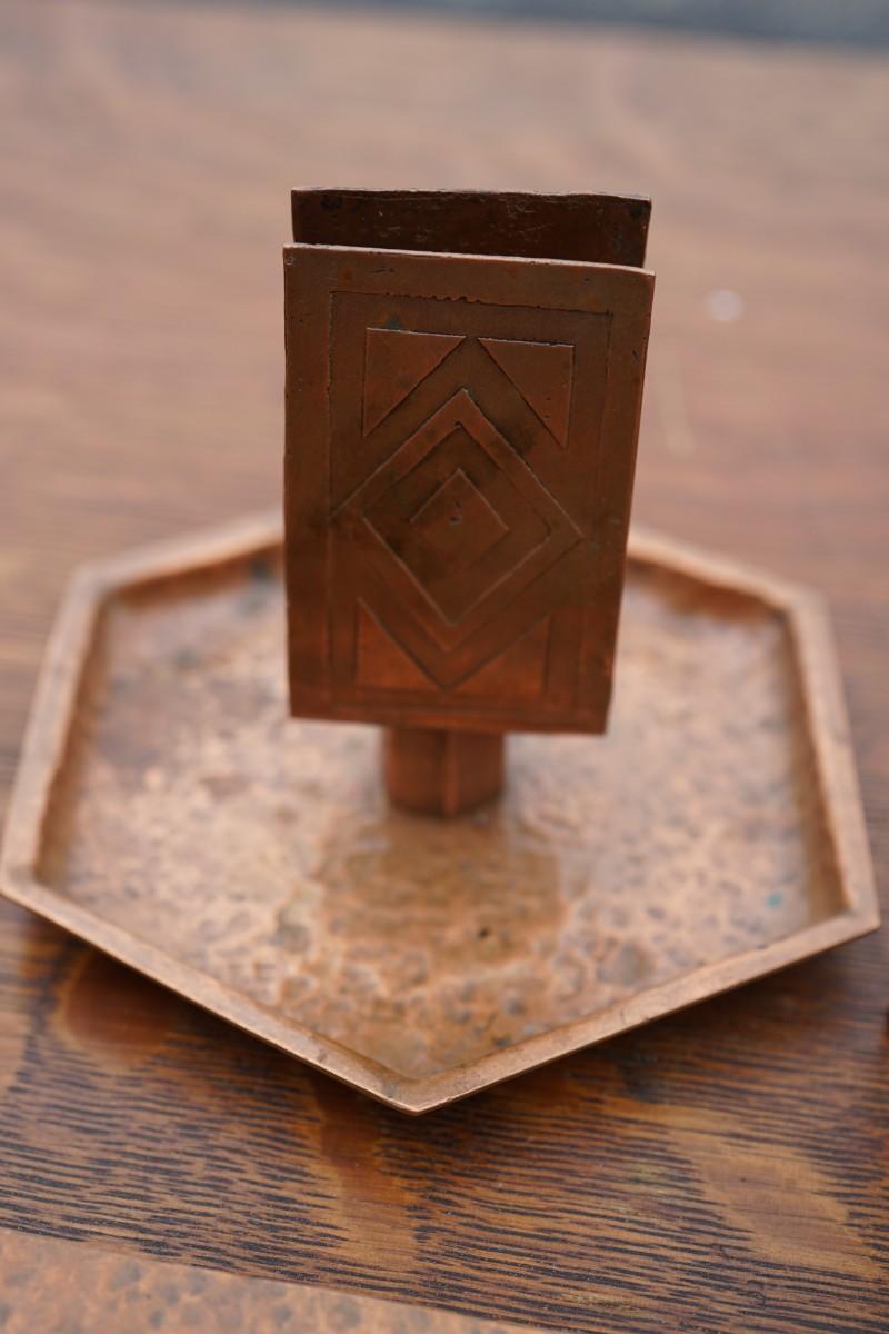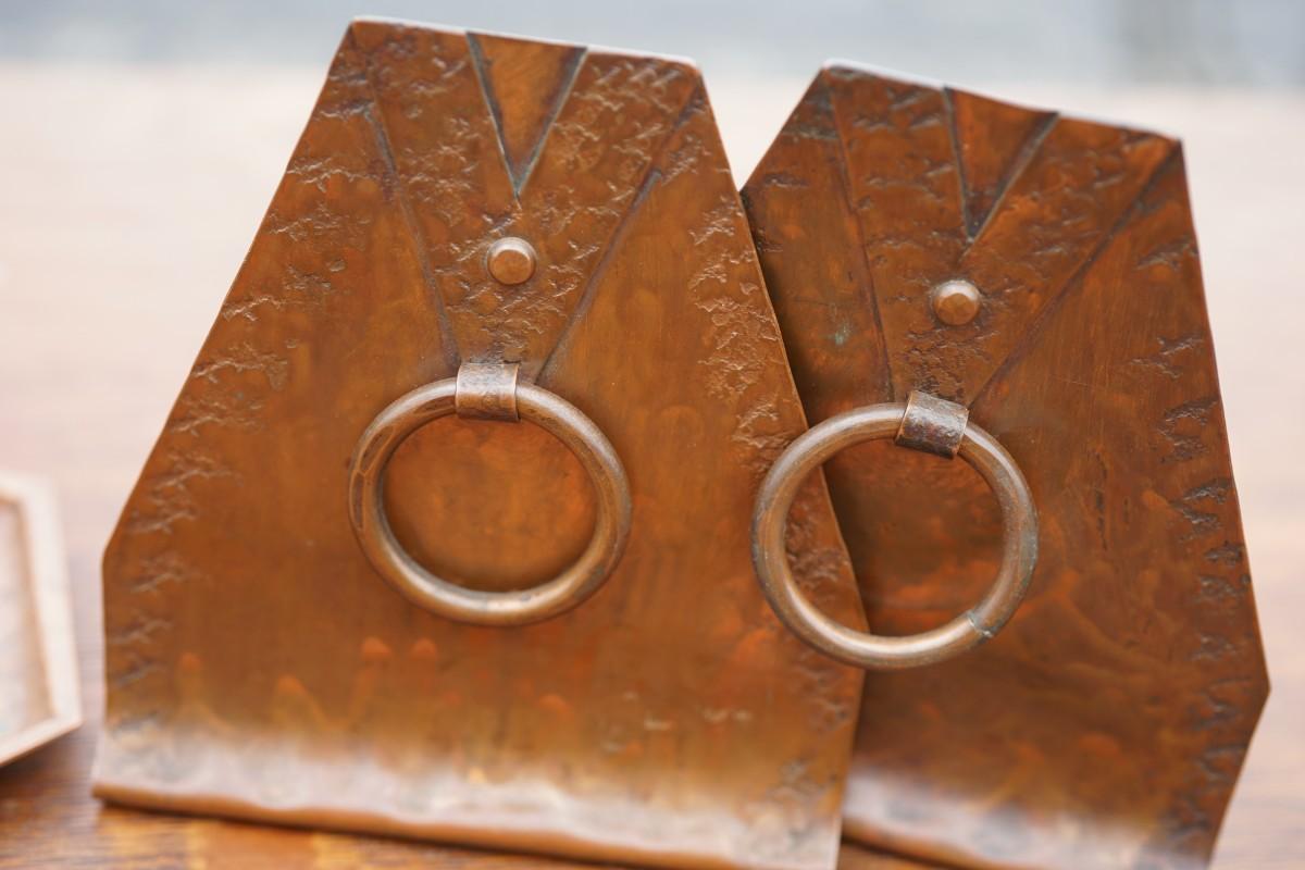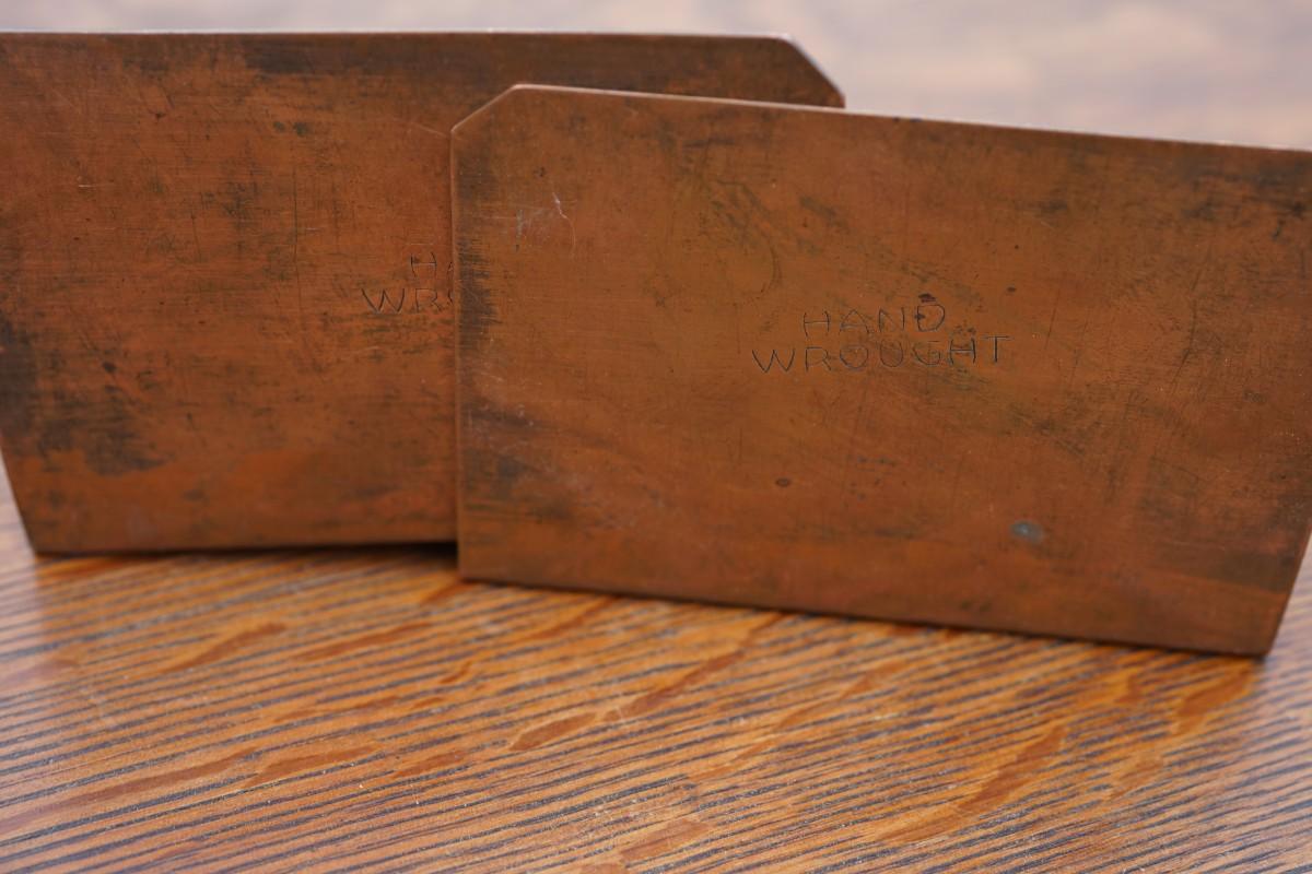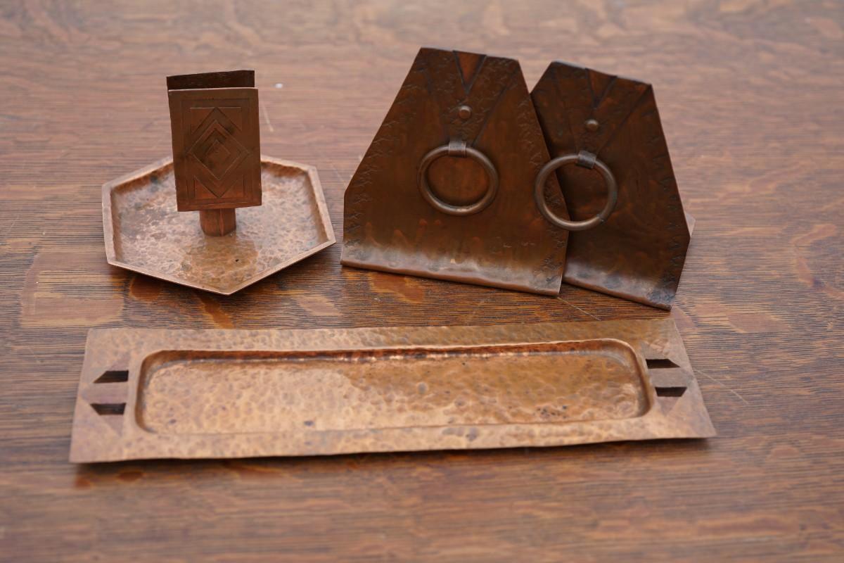 THREE PIECE HAMMERED COPPER DESK SET TO INCLUDE BOOKENDS, MATCH HOLDER AND PEN TRAY