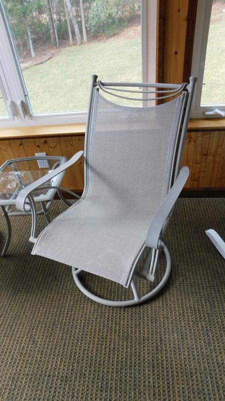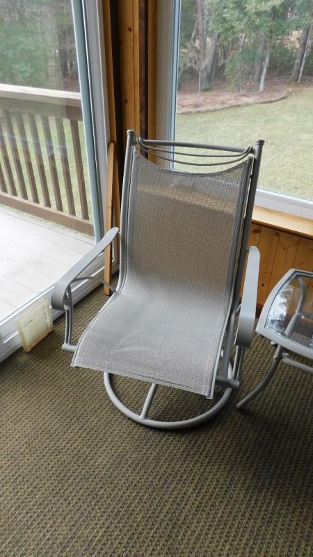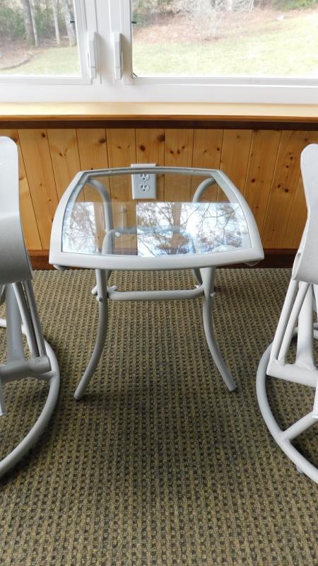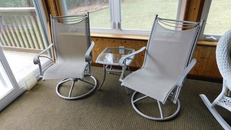 Three Piece Patio Chair and Side Table Set with glass top table and 2 metal framed swivel chairs. Good condition.