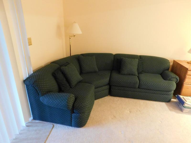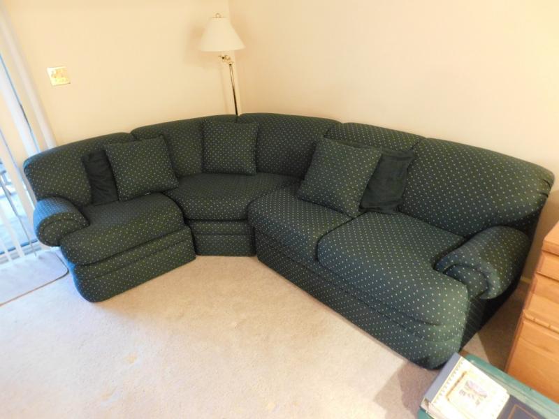 Three Piece Sectional Couch in very good condition. Rich green fabric with light color polka dots. Very nice item