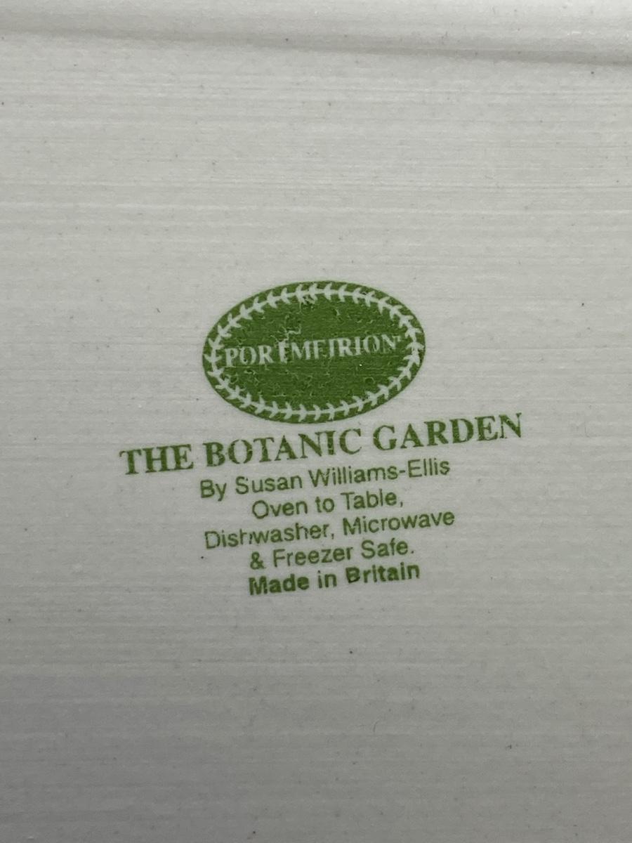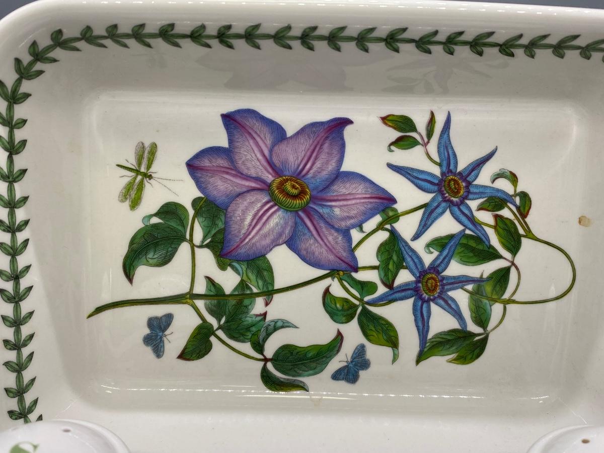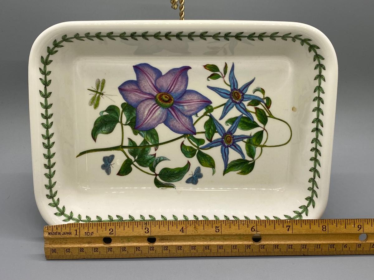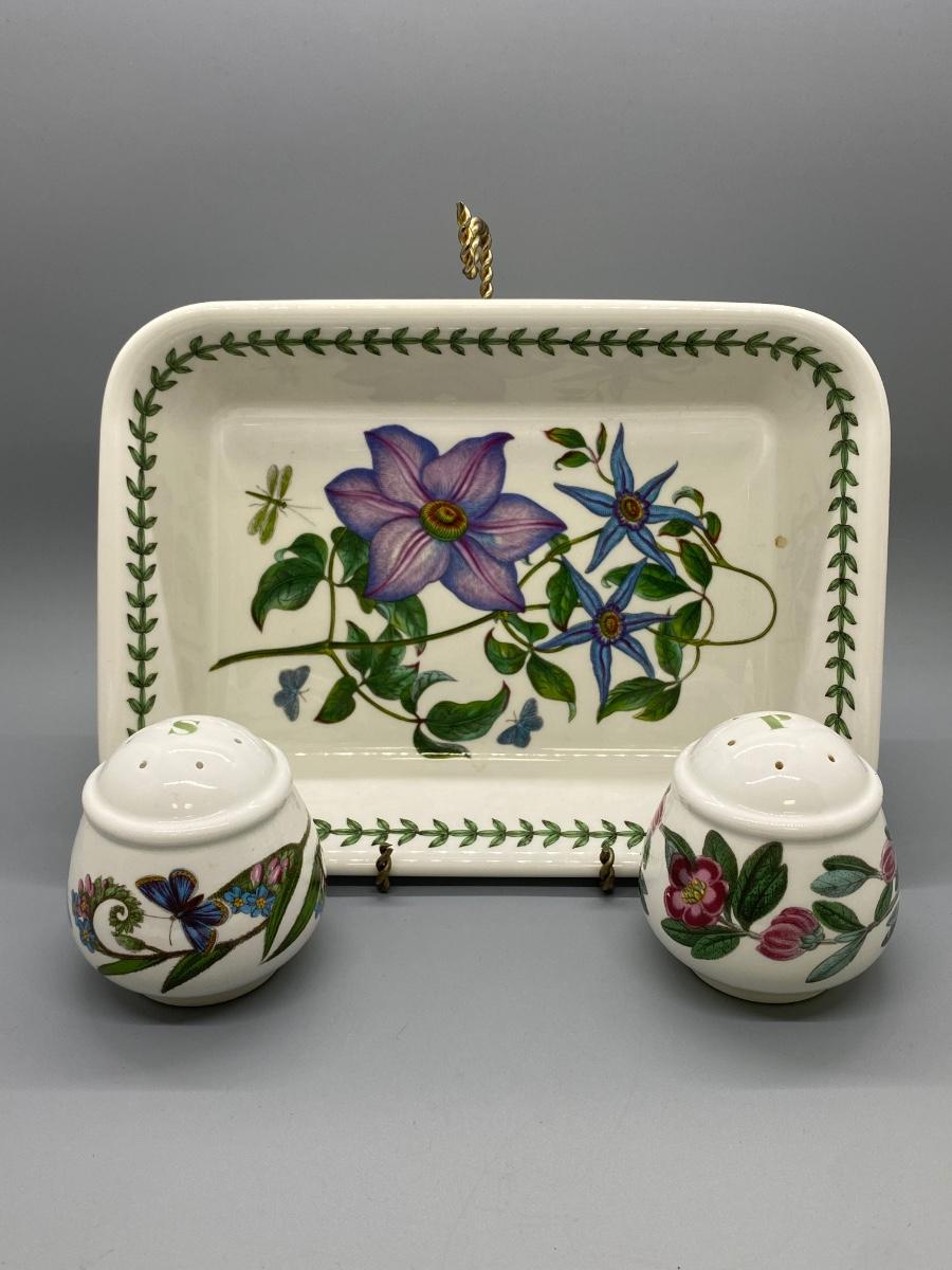 Portmeirion "The Botanic Garden" three-piece lot. Includes salt and pepper shakers and a small rectangle tray/plate. Beautiful floral design, good condition.