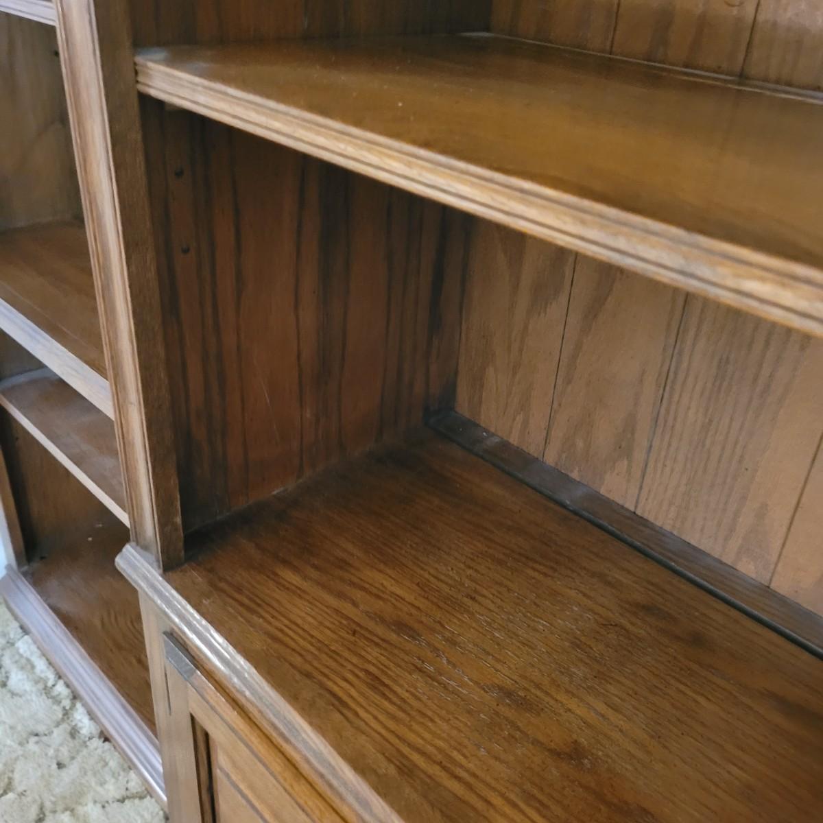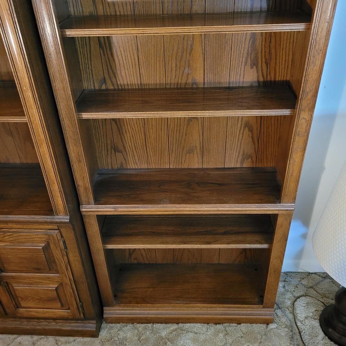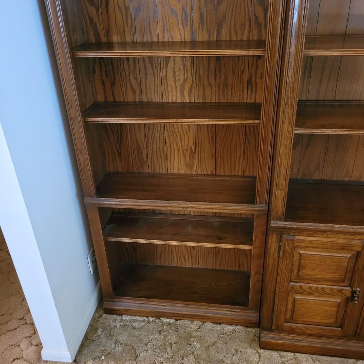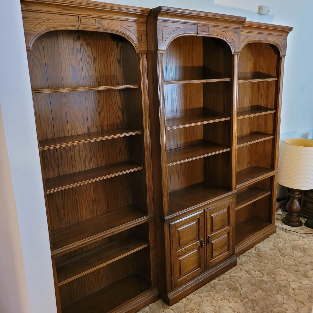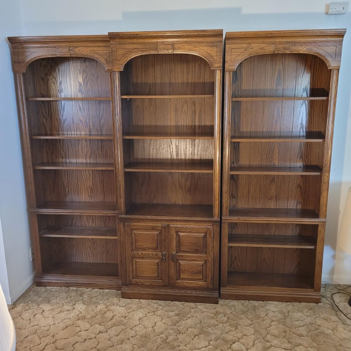 This lot includes a three piece wooden bookshelf setup. There are two matching shelves, and one unique center shelf. The two matching shelves have six shelves and individually measure 30" x 10" x 78"H. The center piece has four shelves and a lower cabinet with two swinging doors. The center piece measures 30" x 14" x 78"H.