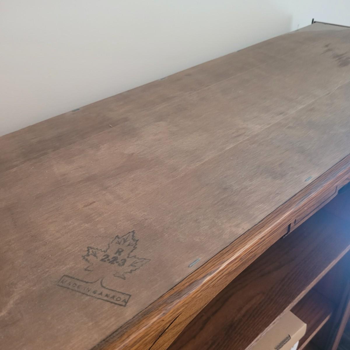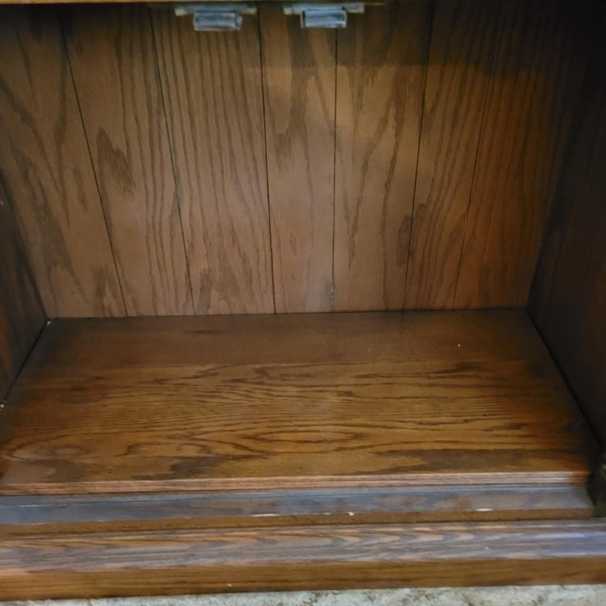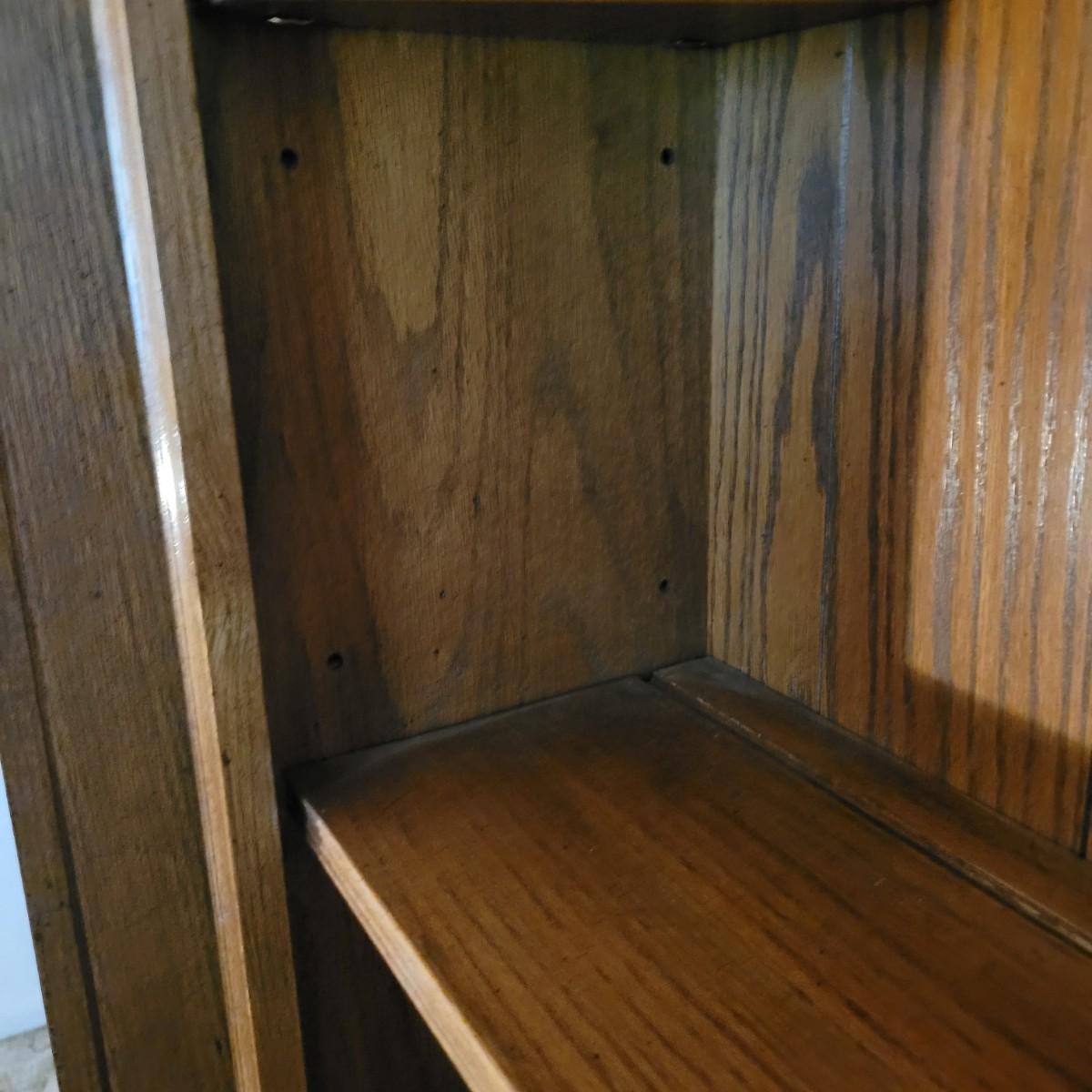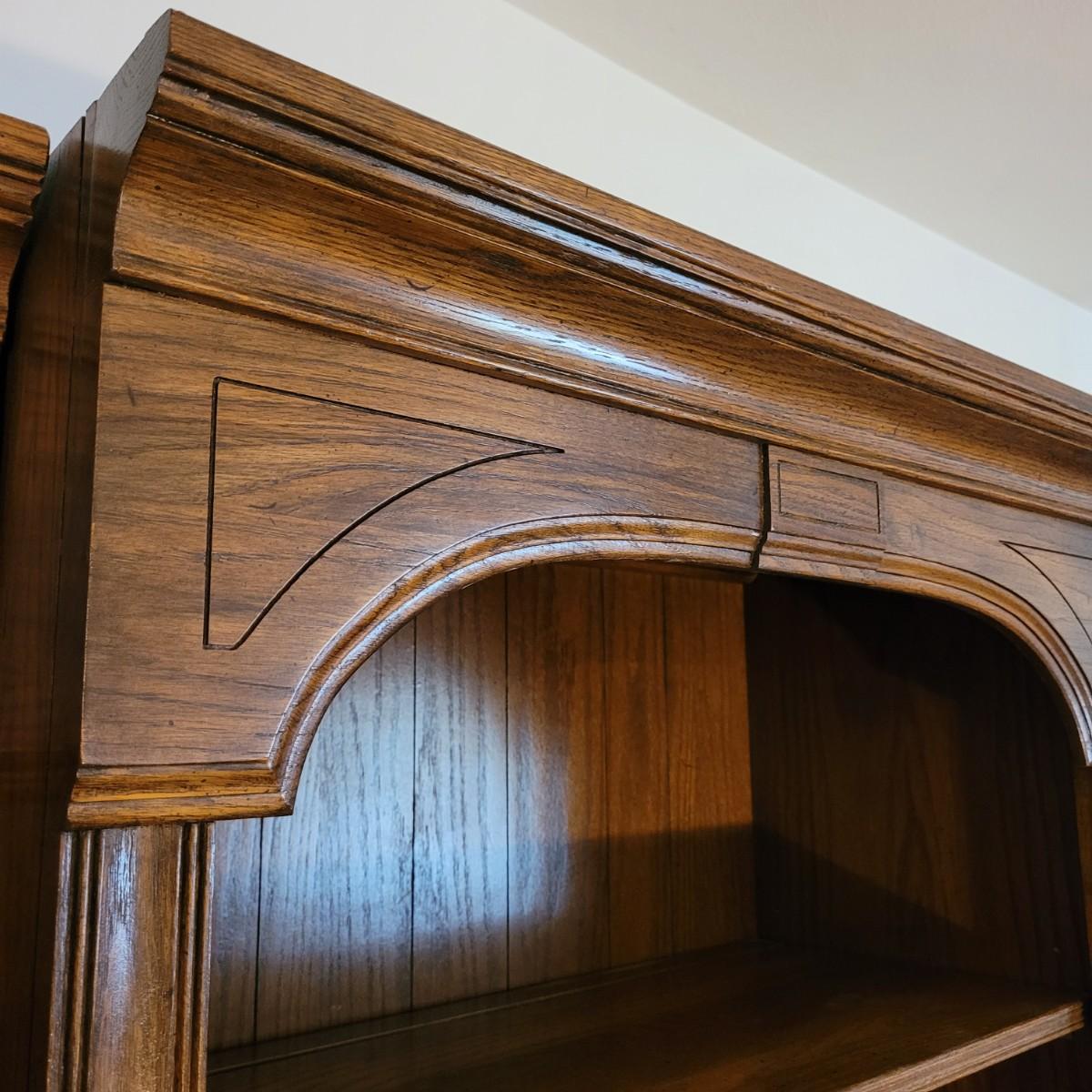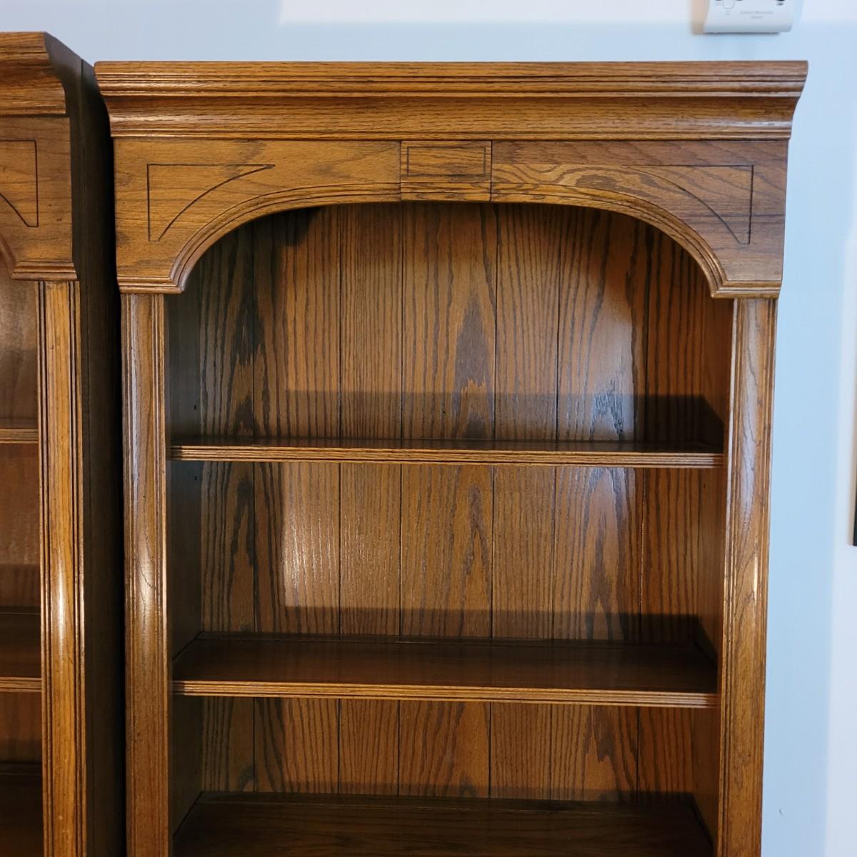 This lot includes a three piece wooden bookshelf setup. There are two matching shelves, and one unique center shelf. The two matching shelves have six shelves and individually measure 30" x 10" x 78"H. The center piece has four shelves and a lower cabinet with two swinging doors. The center piece measures 30" x 14" x 78"H.