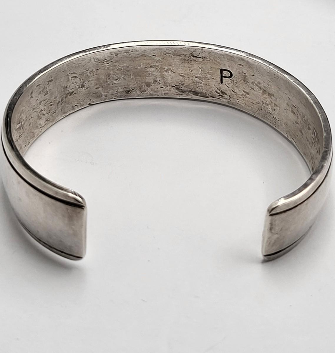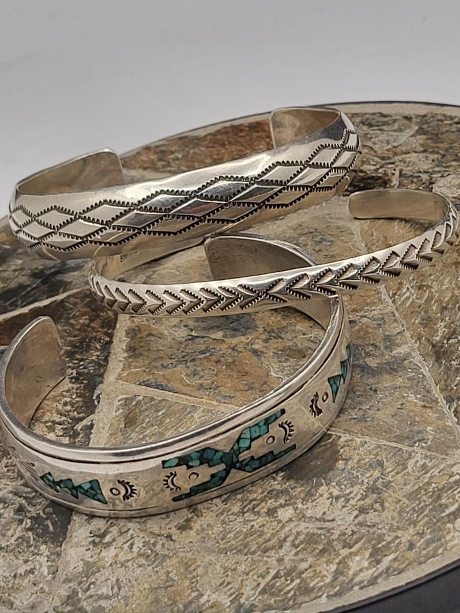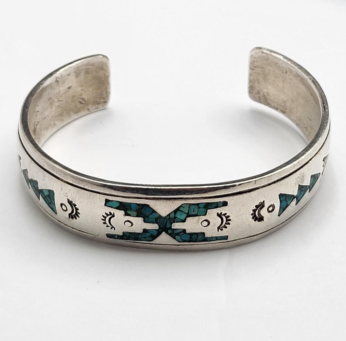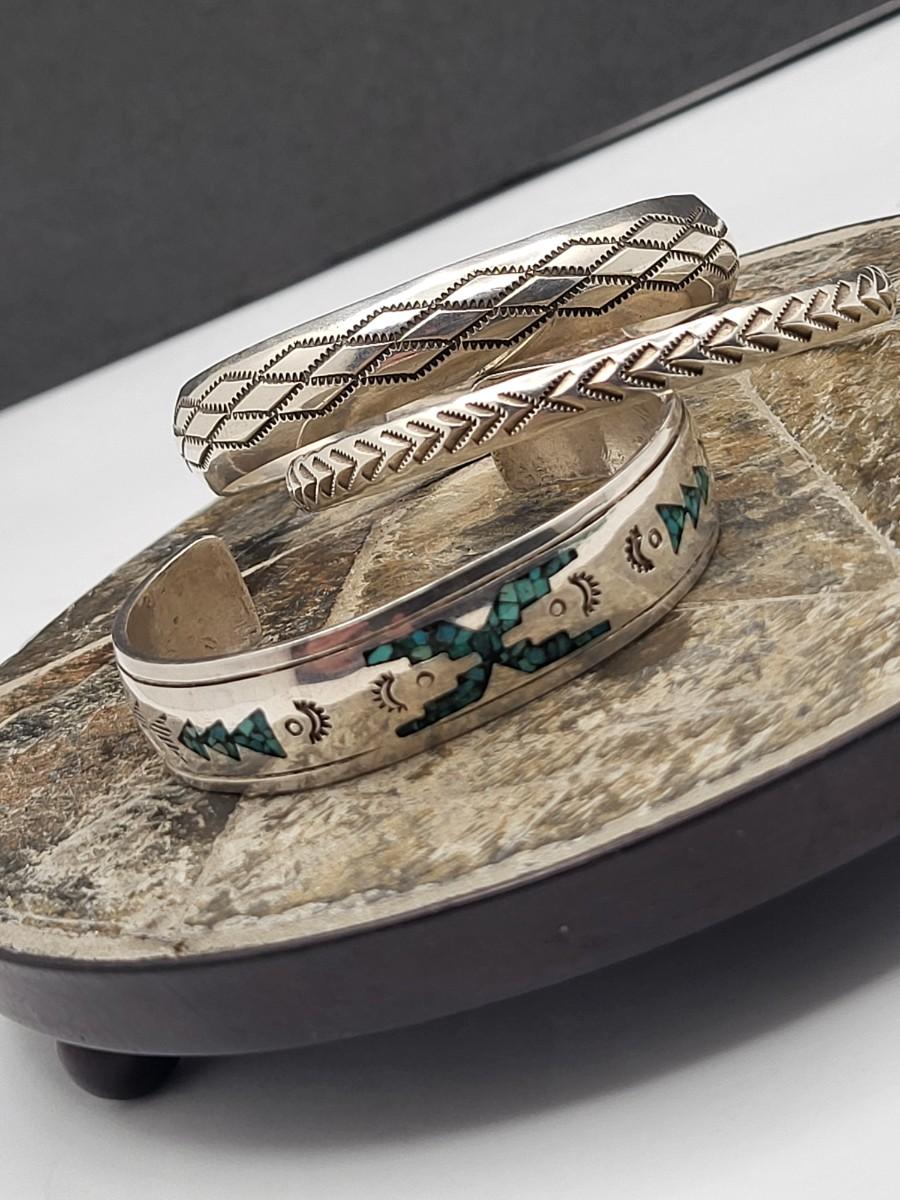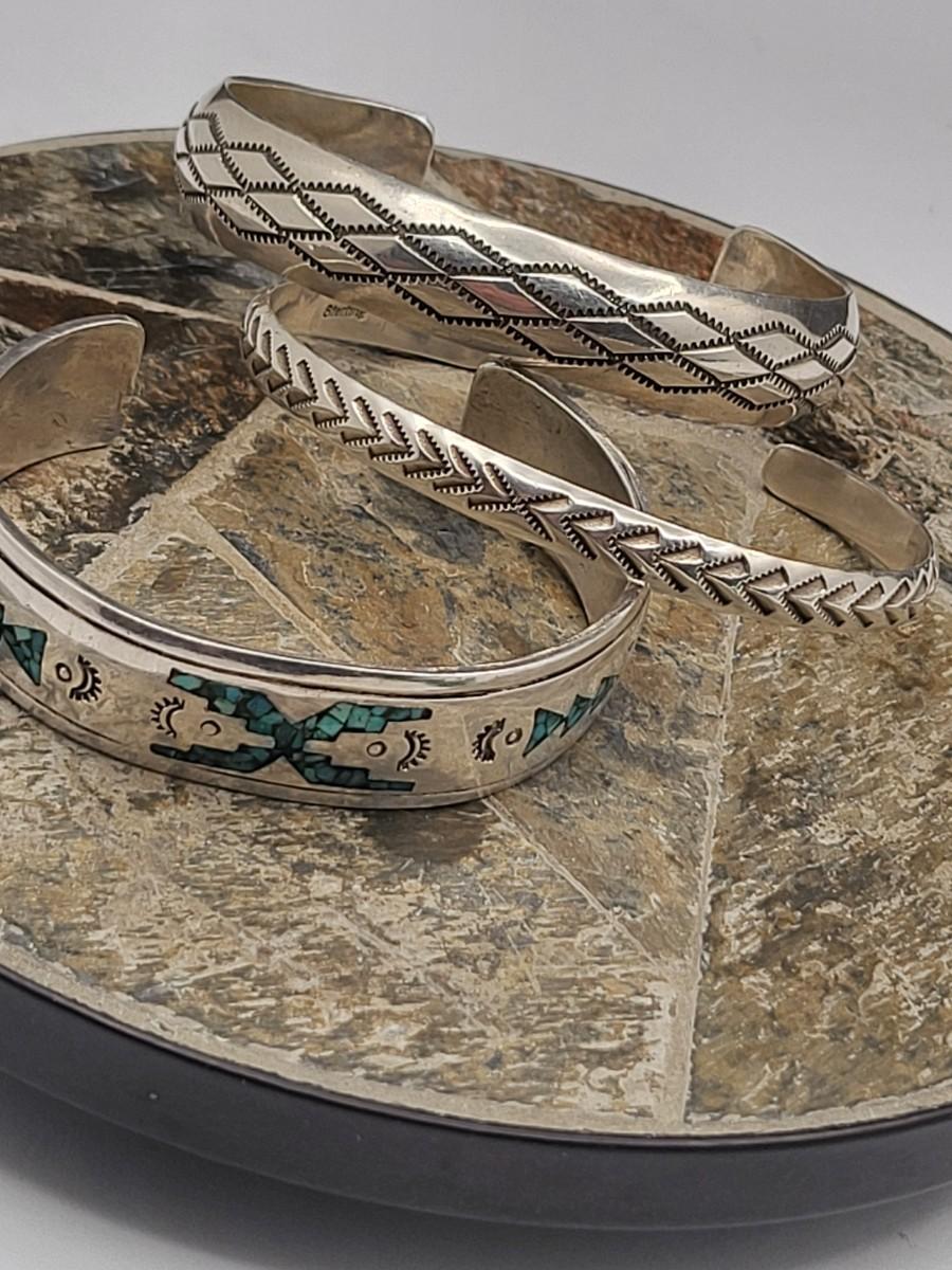 Designer, handmade cuff etched with turquoise inlay, stamped 'P'. One cuff has etched chevron pattern and one has diamond shape etching. Weighs 56 grams.