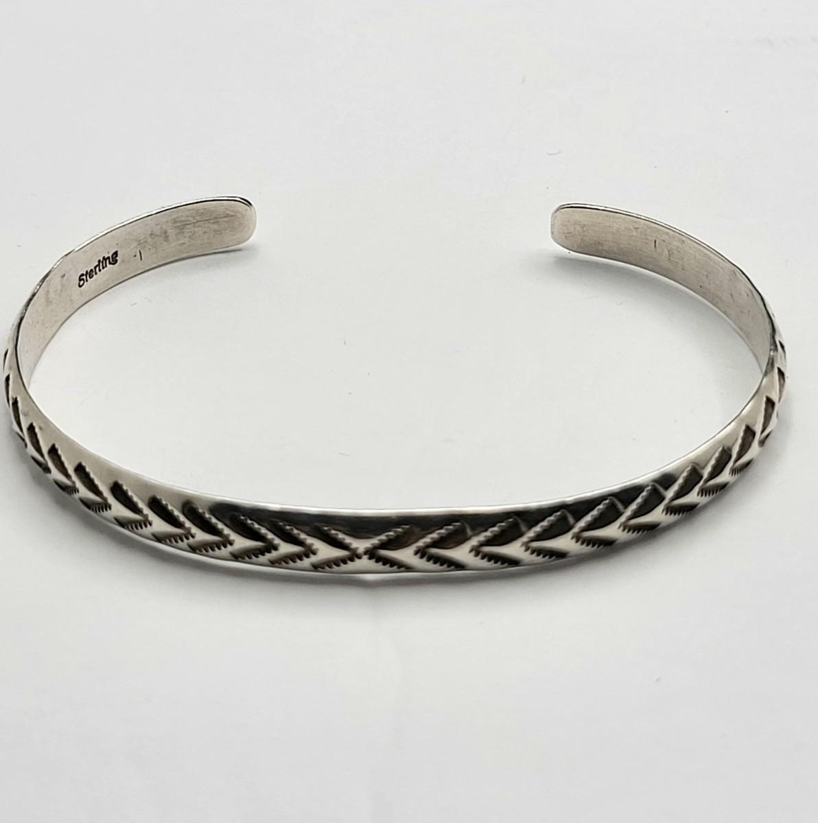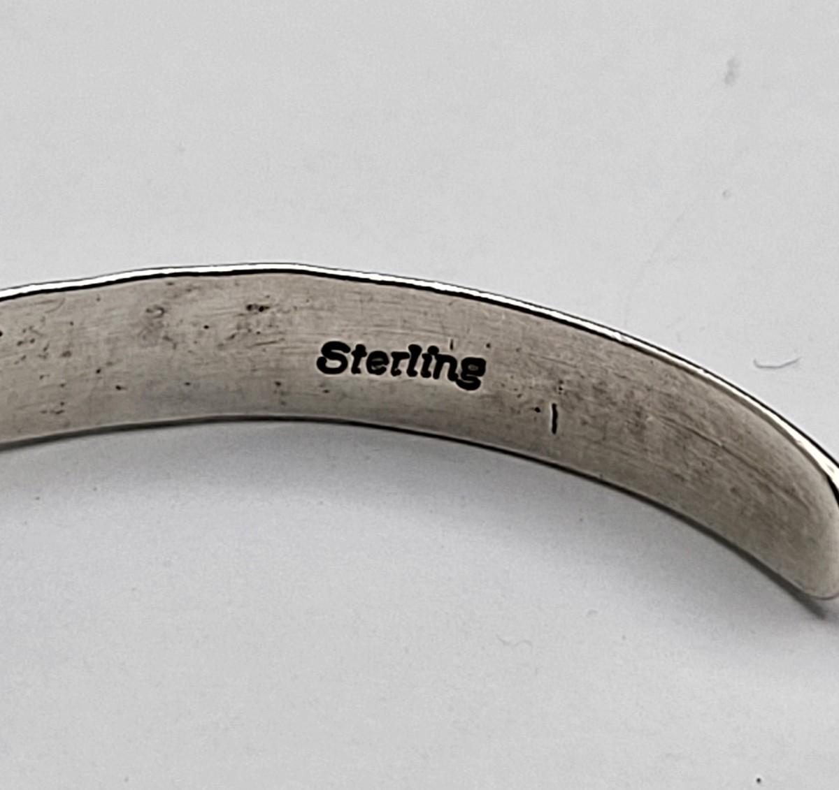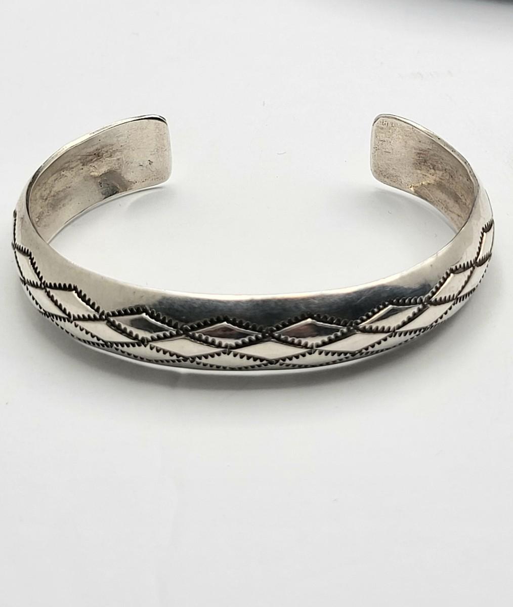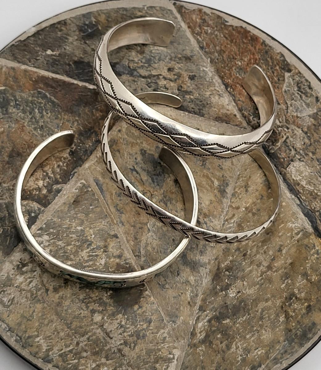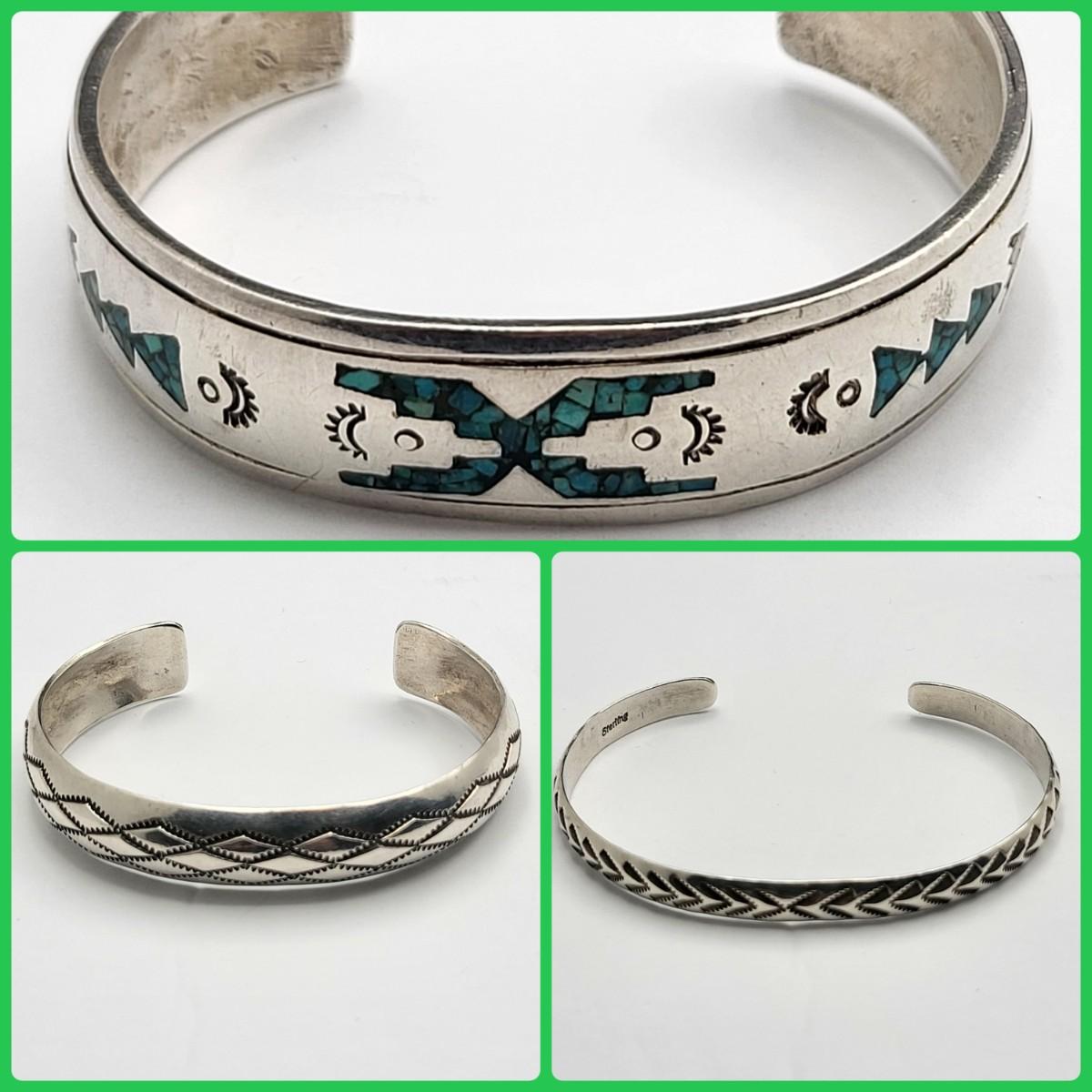 Designer, handmade cuff etched with turquoise inlay, stamped 'P'. One cuff has etched chevron pattern and one has diamond shape etching. Weighs 56 grams.