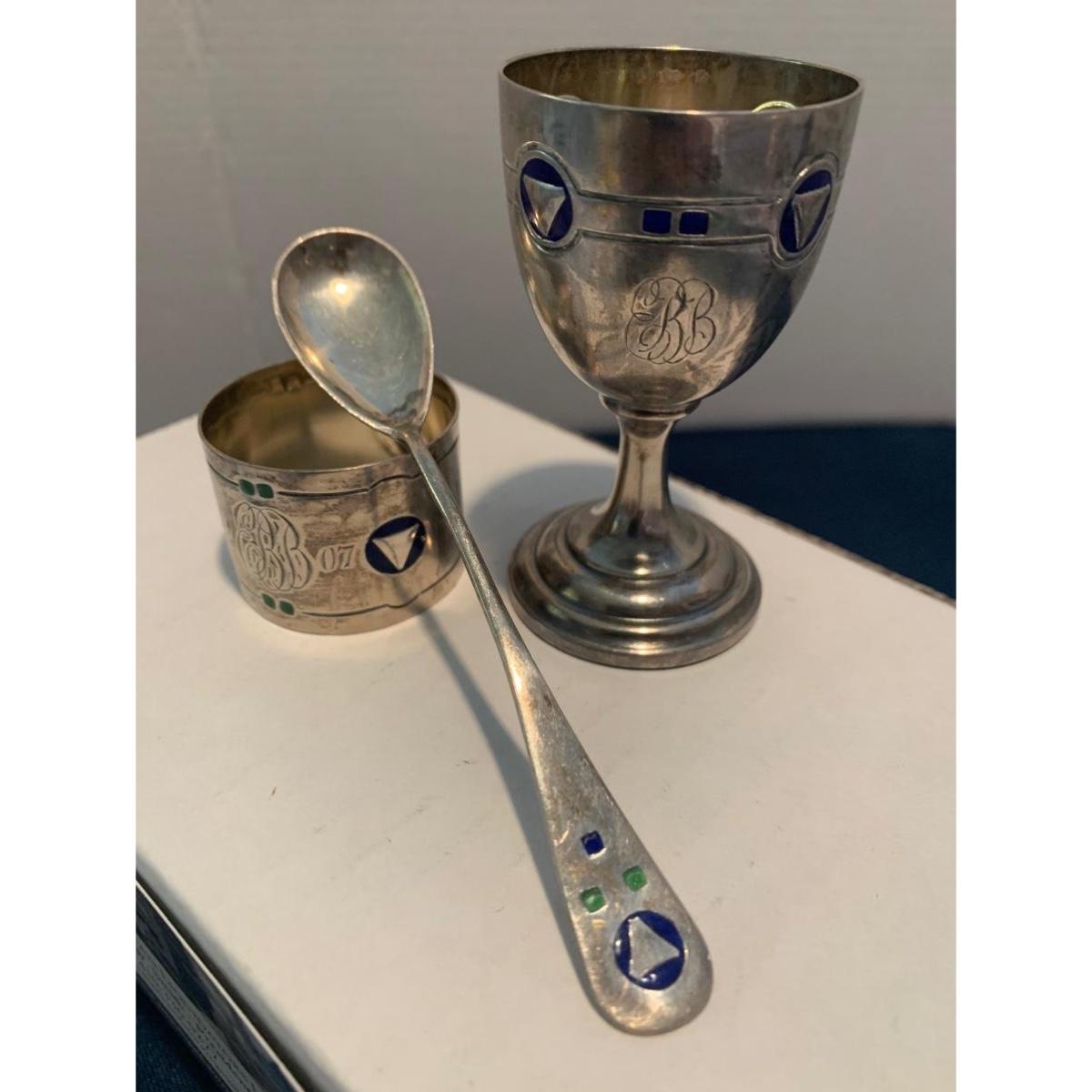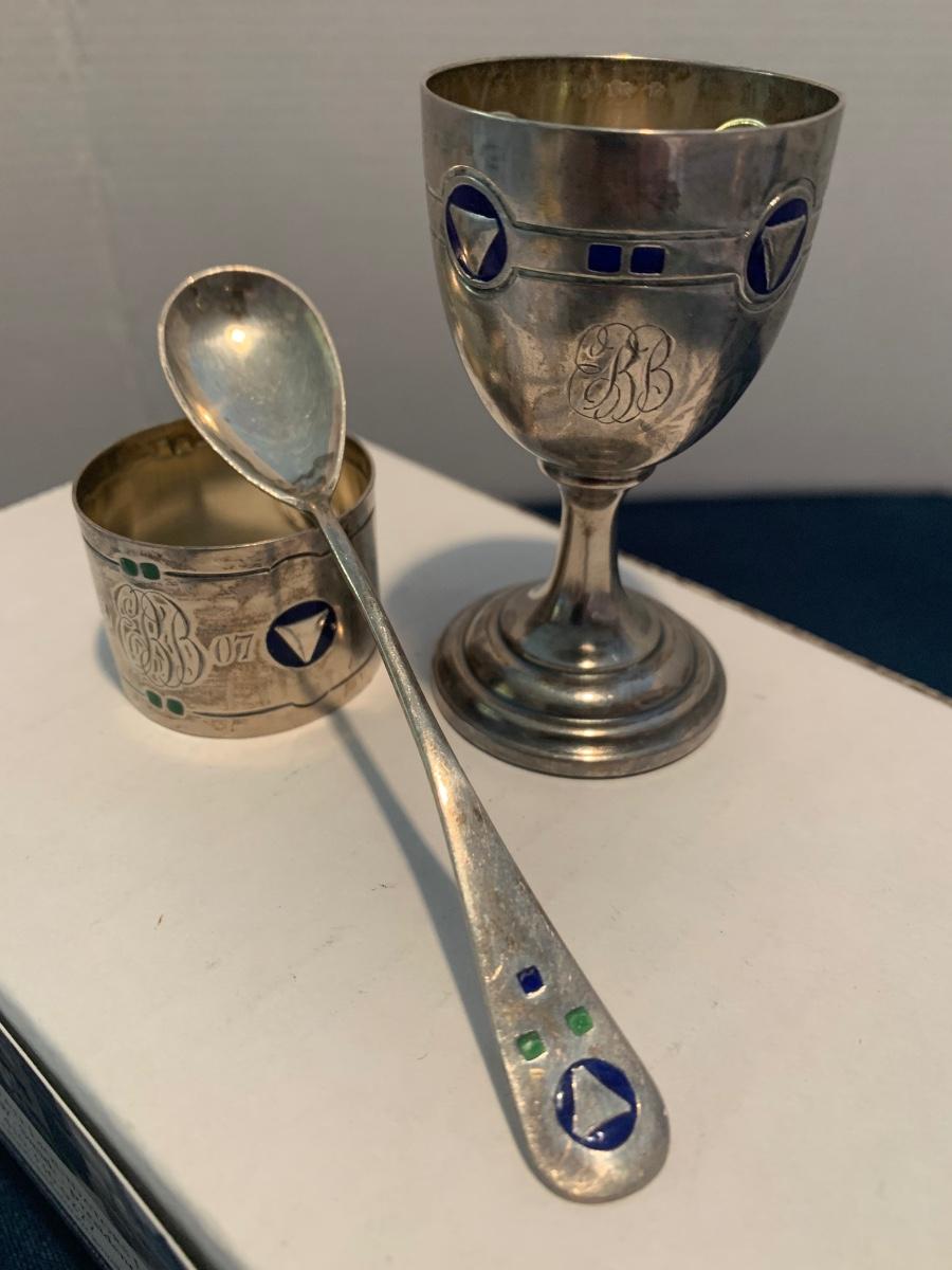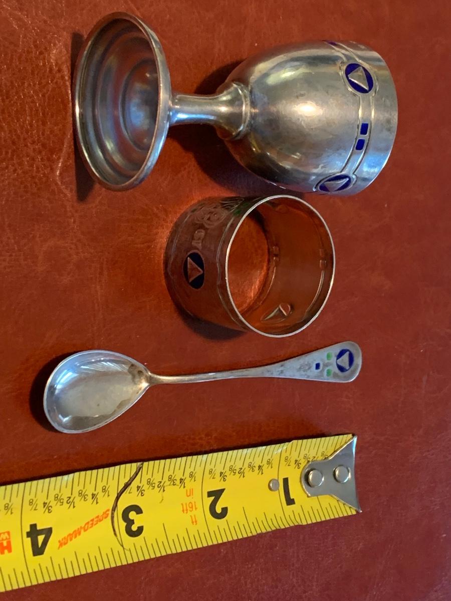 Antique Sterling SIlver Enamel Egg Cup, Spoon, Napkin Ring