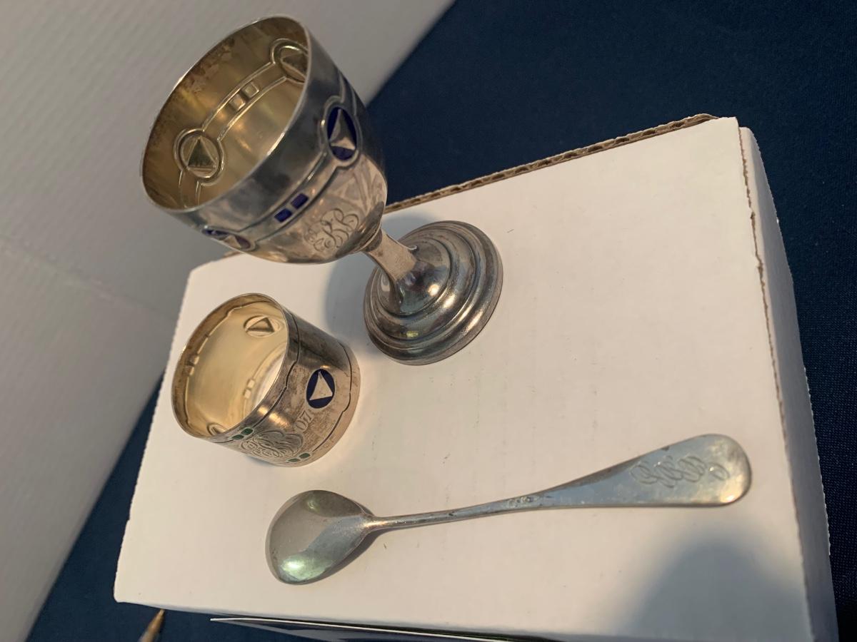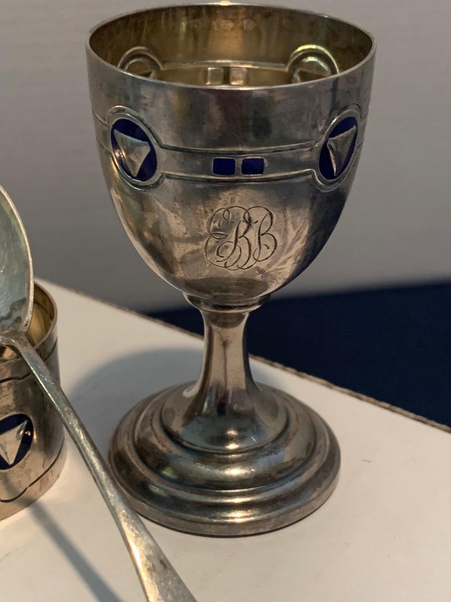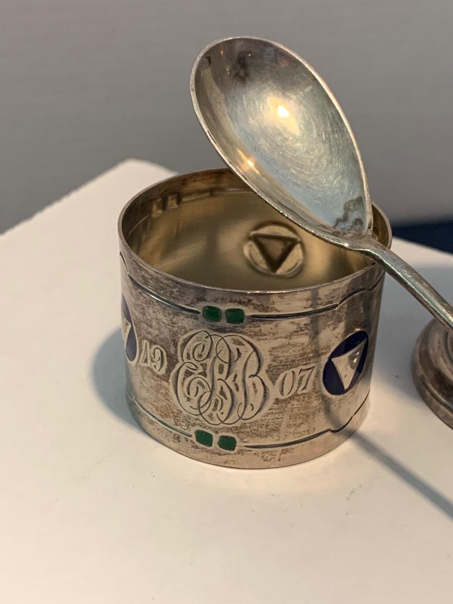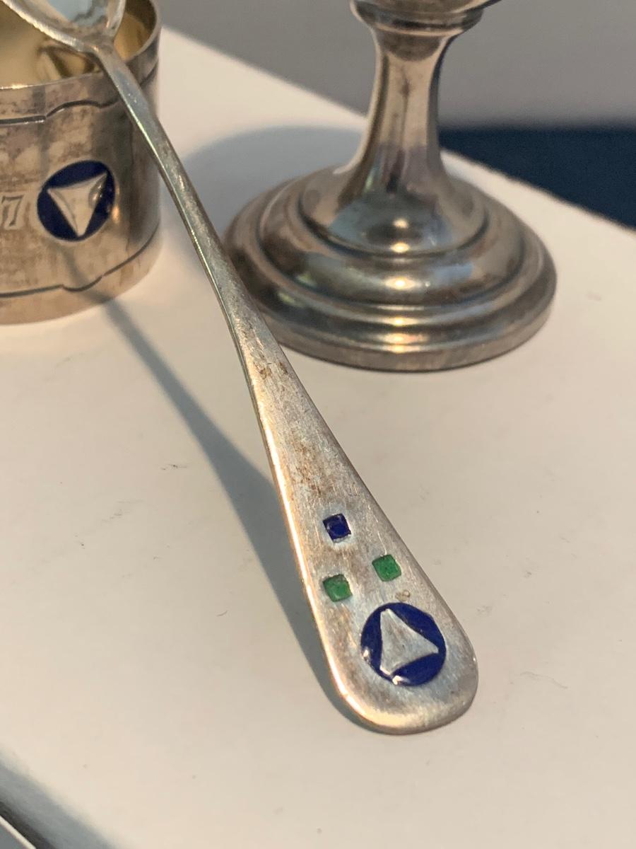 Antique Sterling SIlver Enamel Egg Cup, Spoon, Napkin Ring