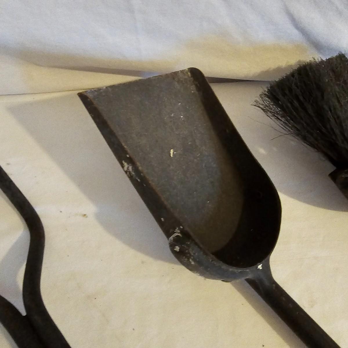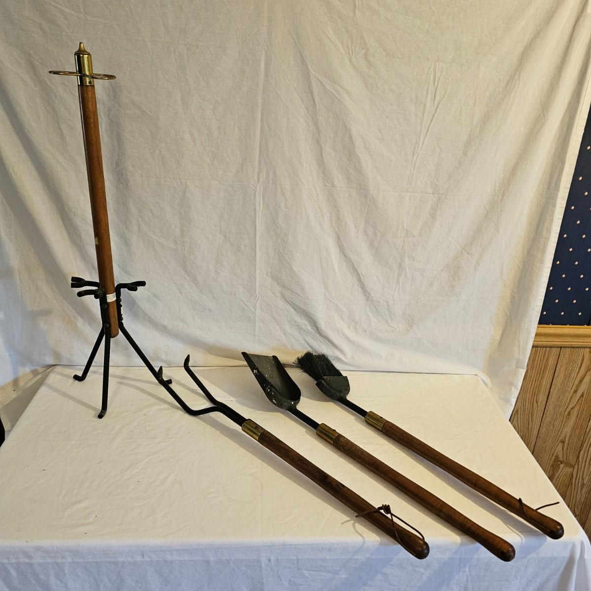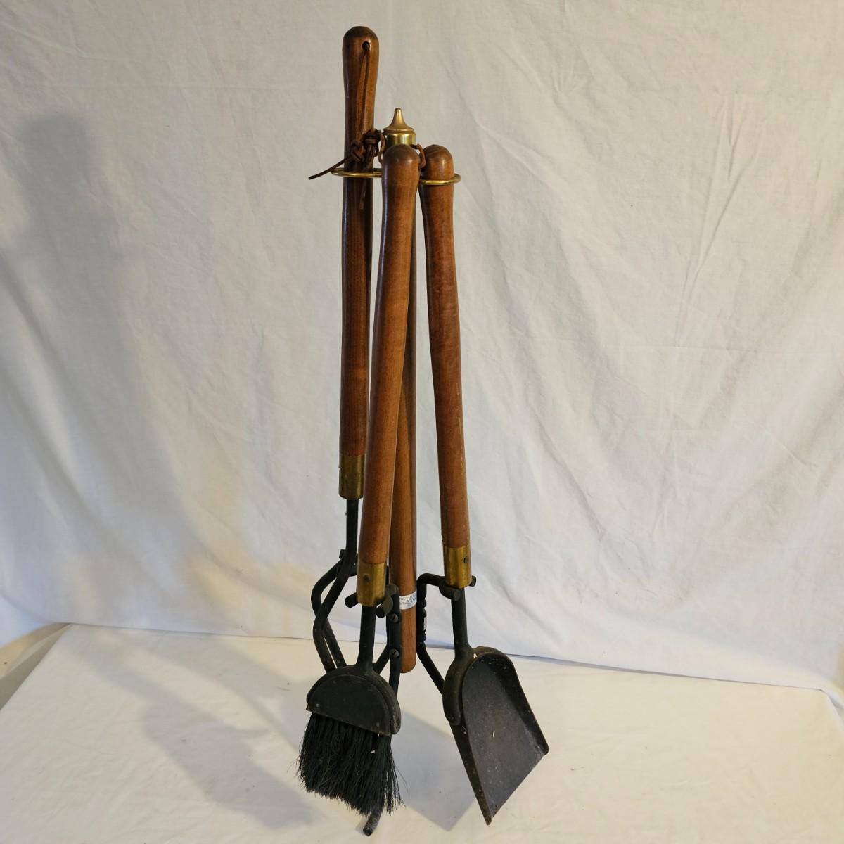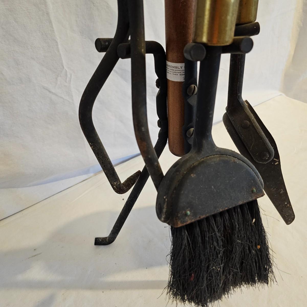 Wood handles and upright stand with cast iron feet and tool ends. One poker, one shovel and a brush, each approximately 28" - 30" long. Overall piece is 12" W x 35"H. See photos for details. Local pickup only.