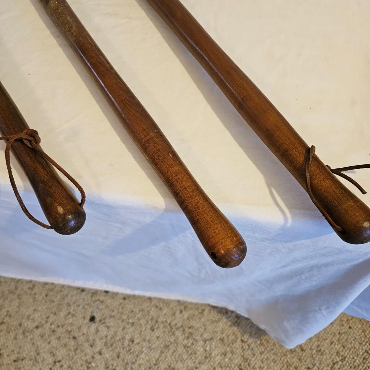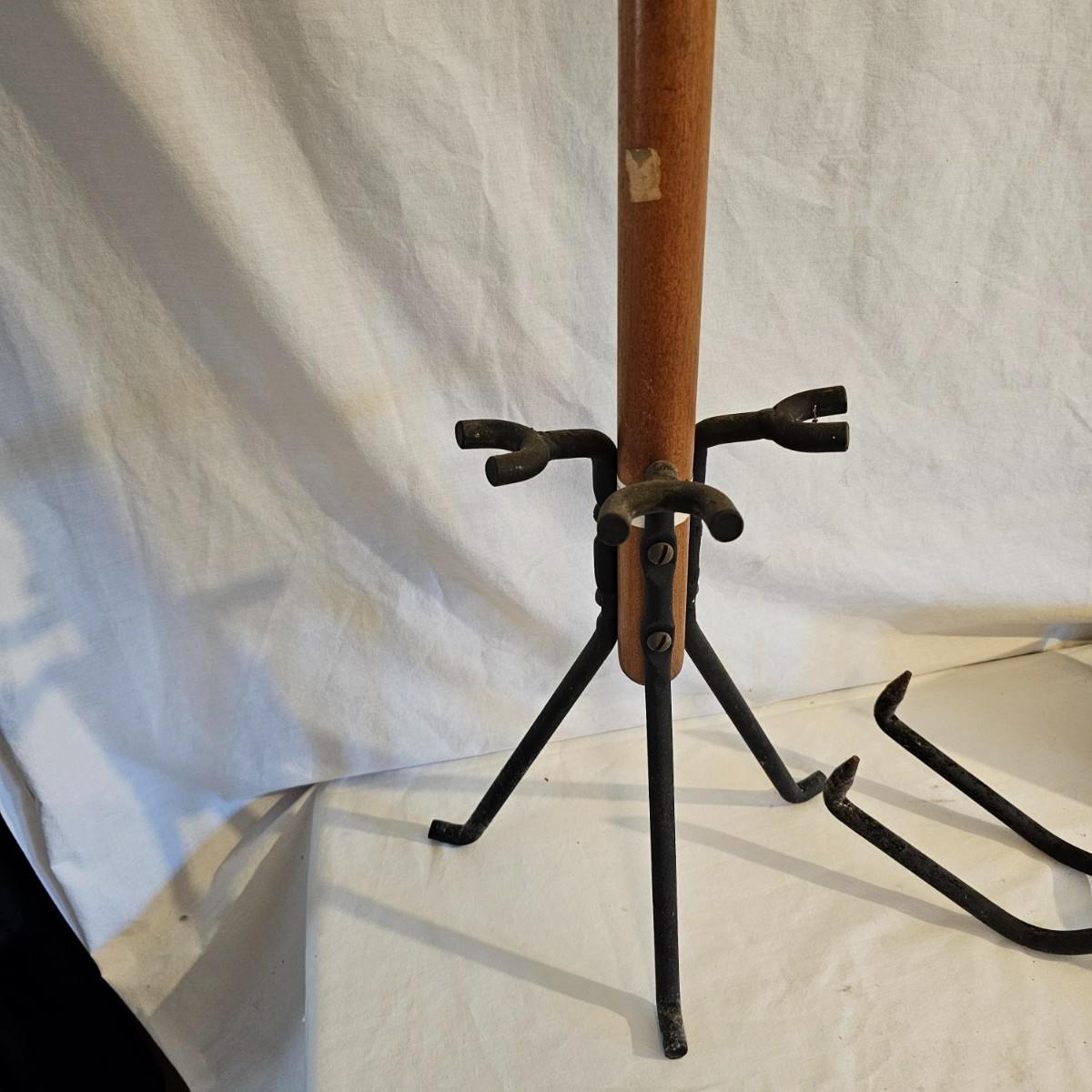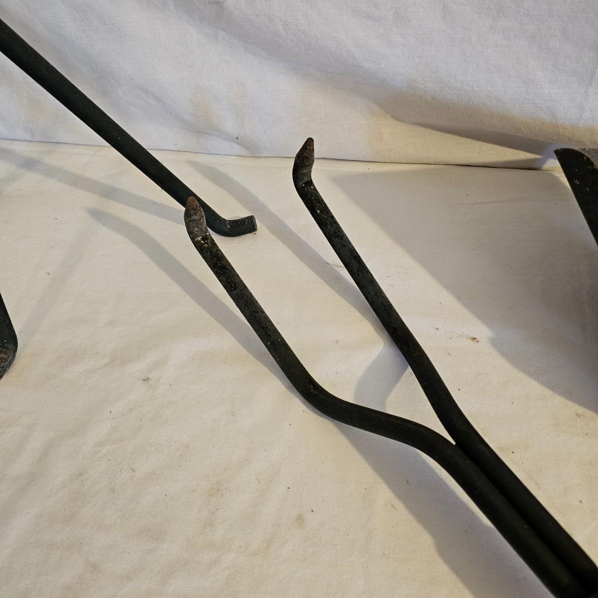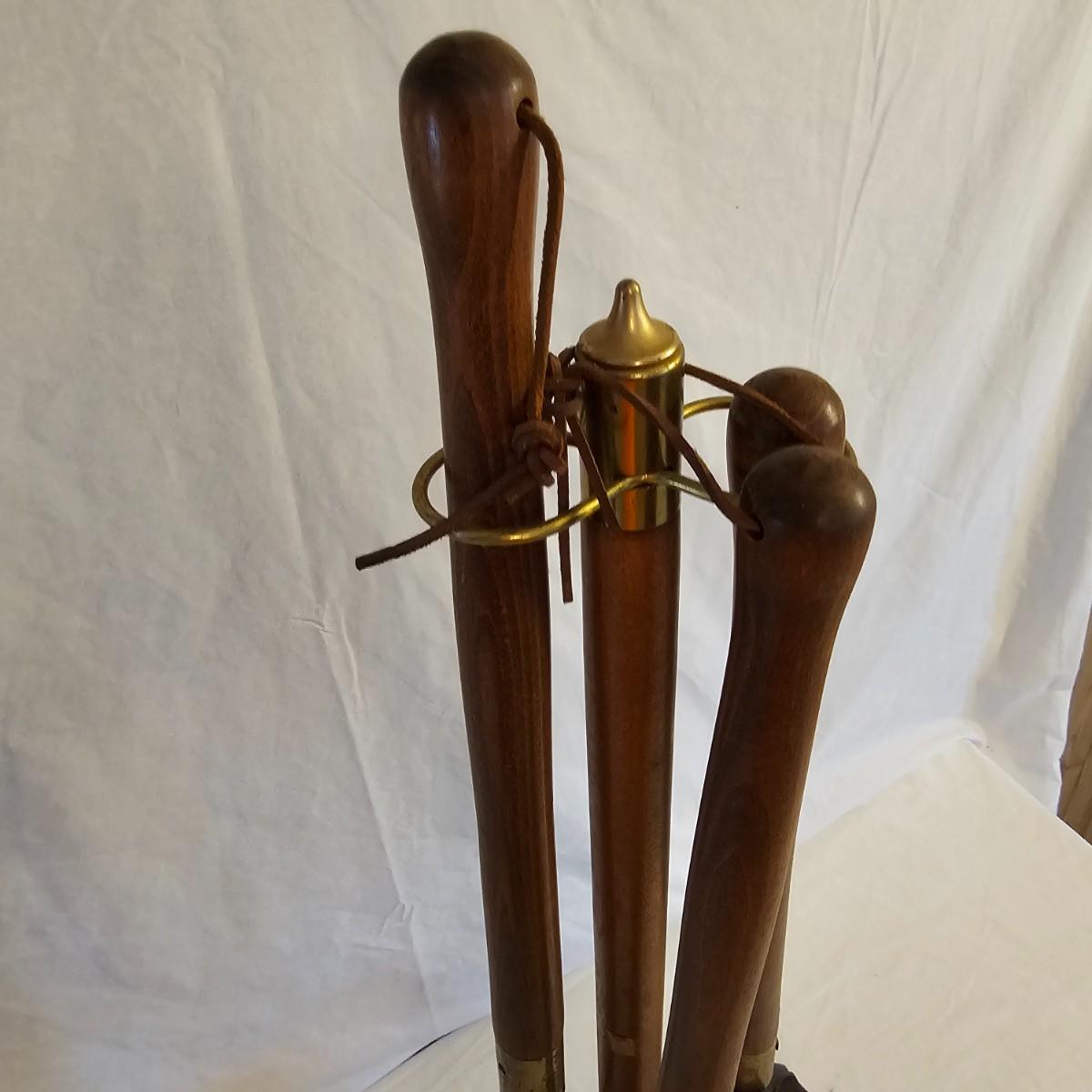 Wood handles and upright stand with cast iron feet and tool ends. One poker, one shovel and a brush, each approximately 28" - 30" long. Overall piece is 12" W x 35"H. See photos for details. Local pickup only.
