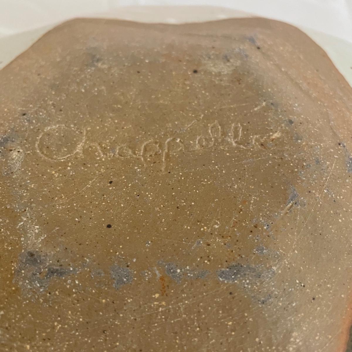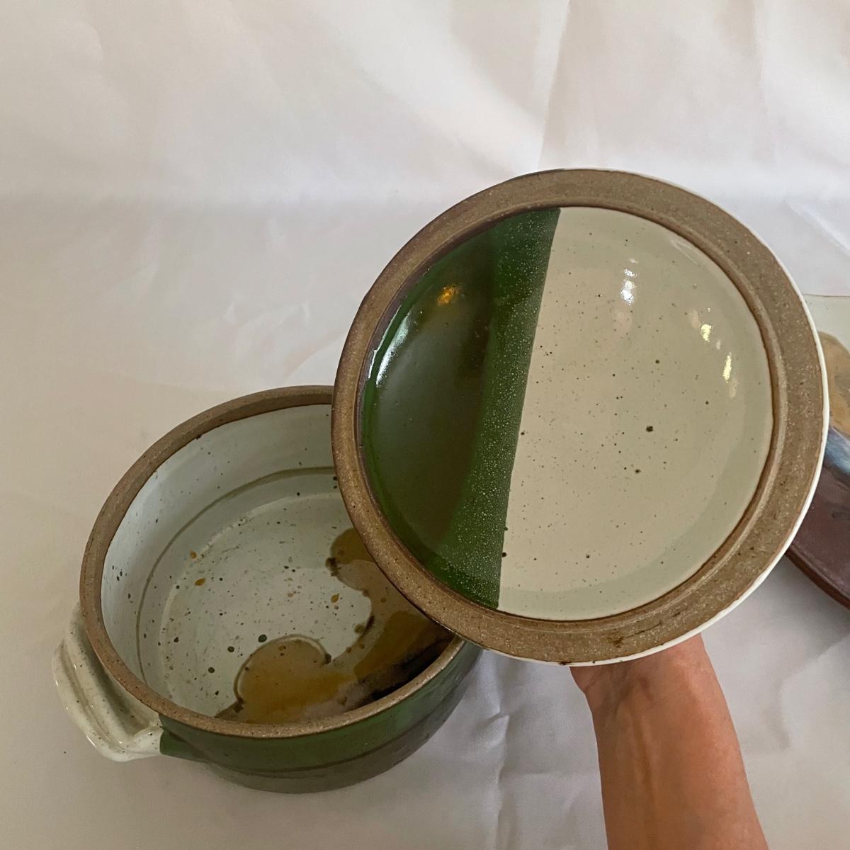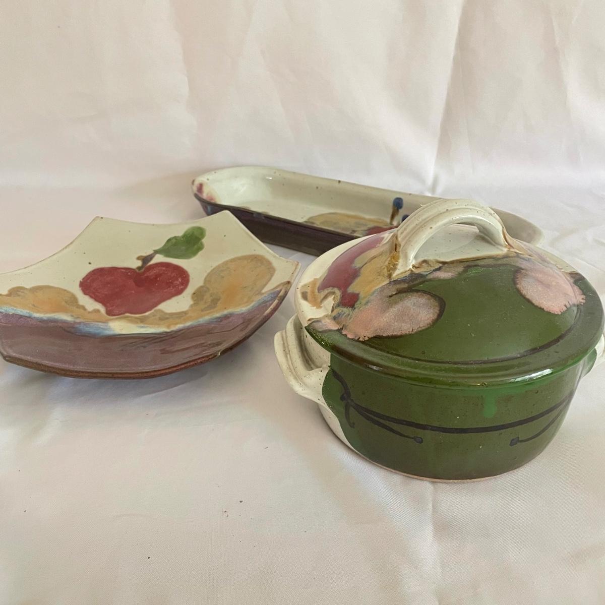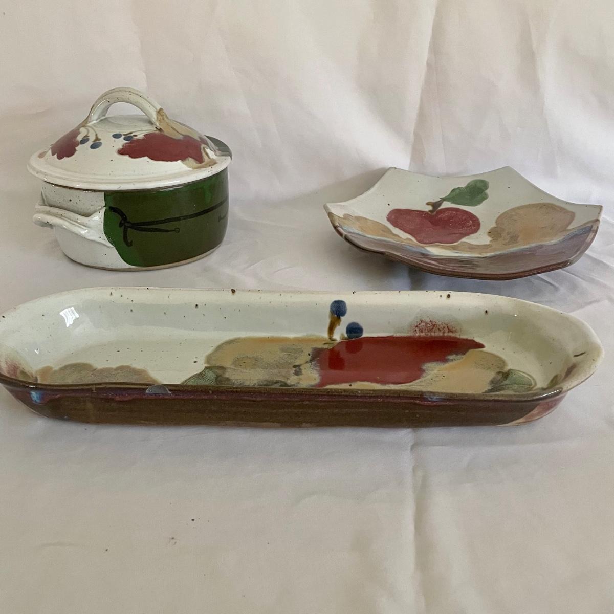 2 platters and a large lidded casserole style dish make up this assortment of Chapelle pottery; all three pieces of handmade pottery are signed.