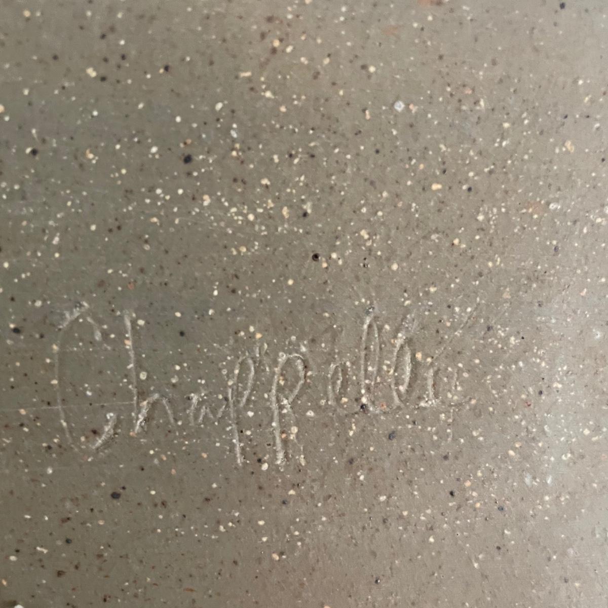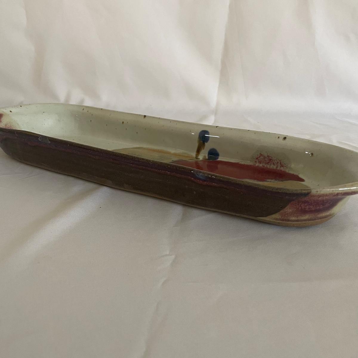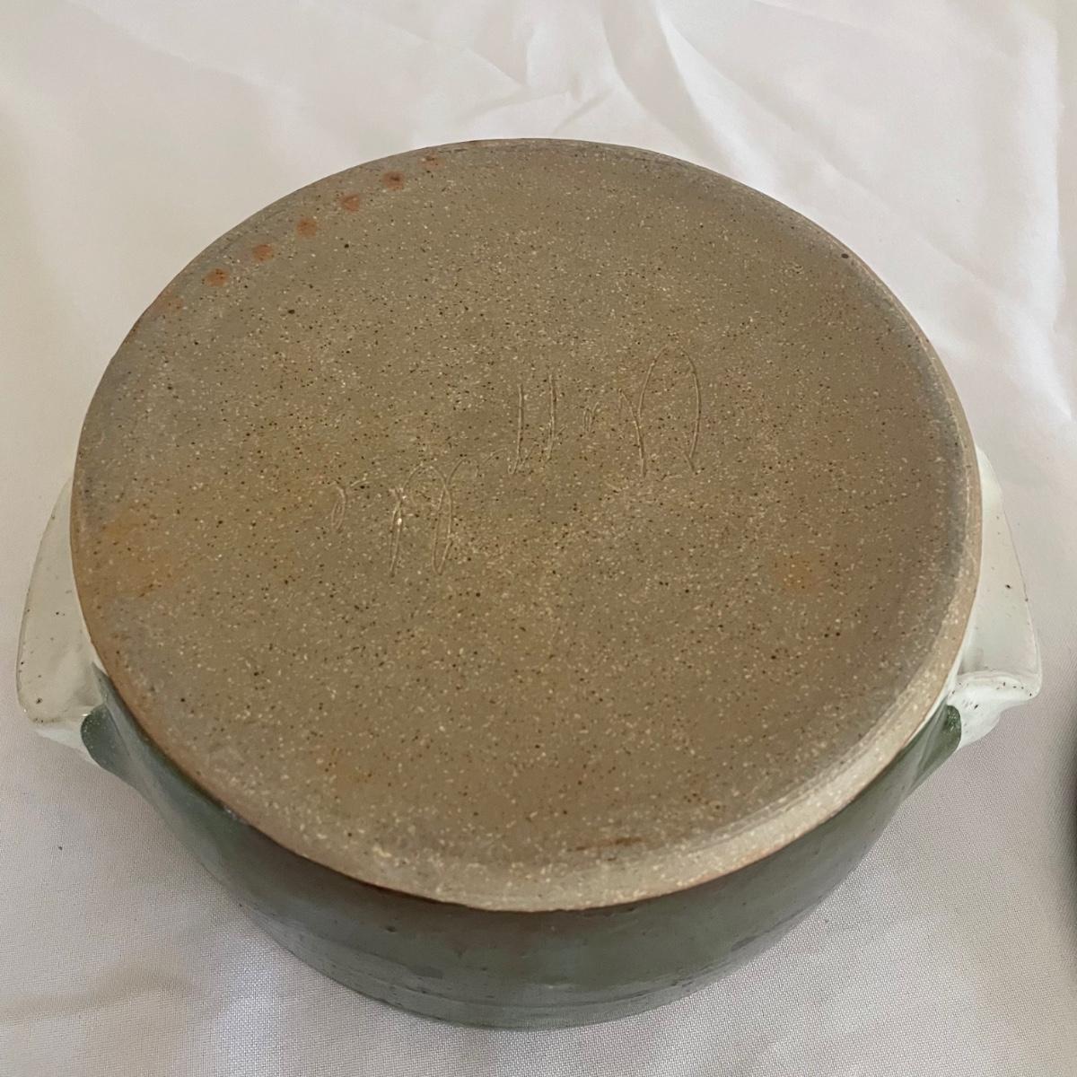 2 platters and a large lidded casserole style dish make up this assortment of Chapelle pottery; all three pieces of handmade pottery are signed.