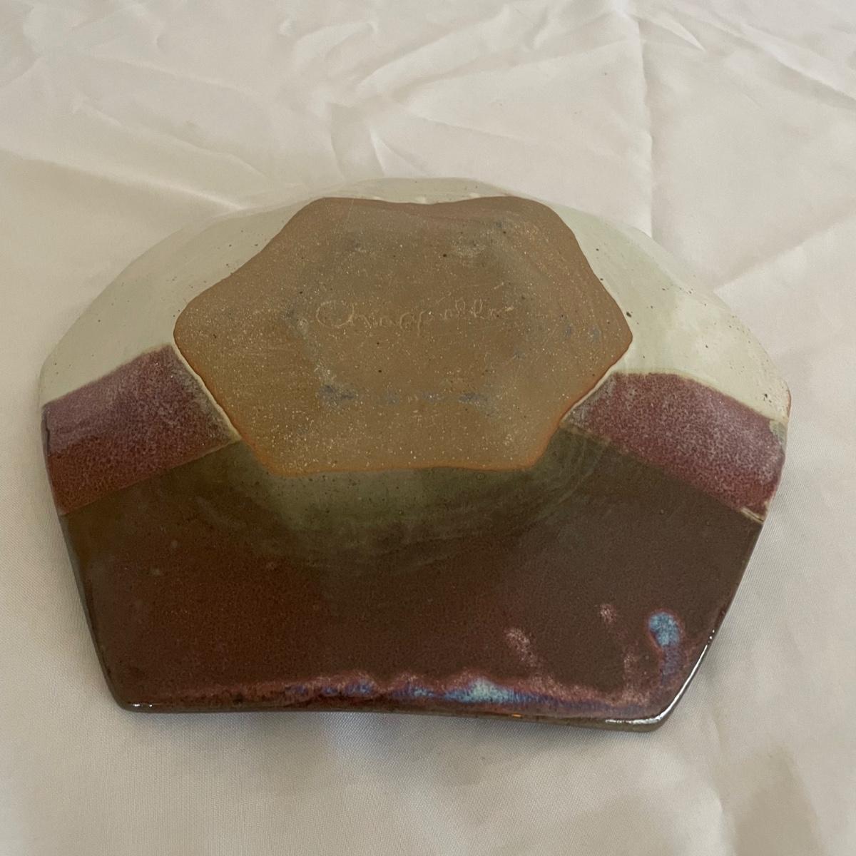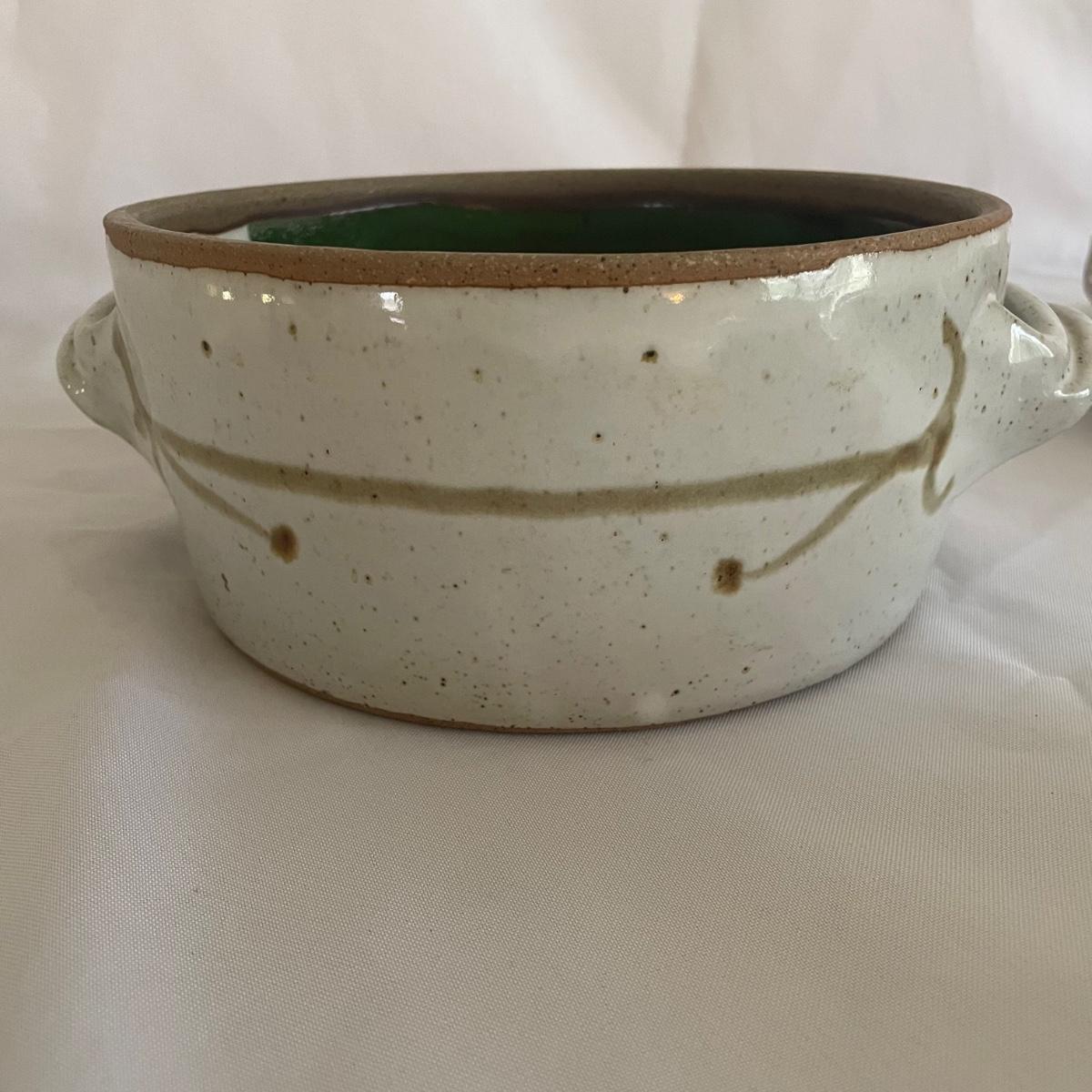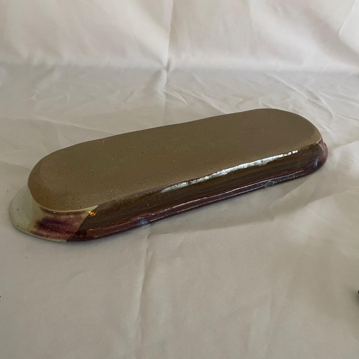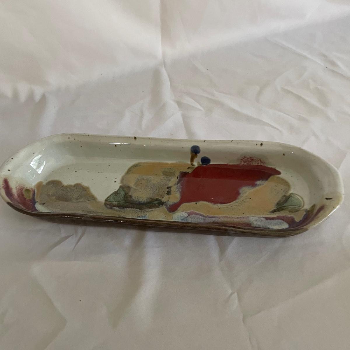 2 platters and a large lidded casserole style dish make up this assortment of Chapelle pottery; all three pieces of handmade pottery are signed.