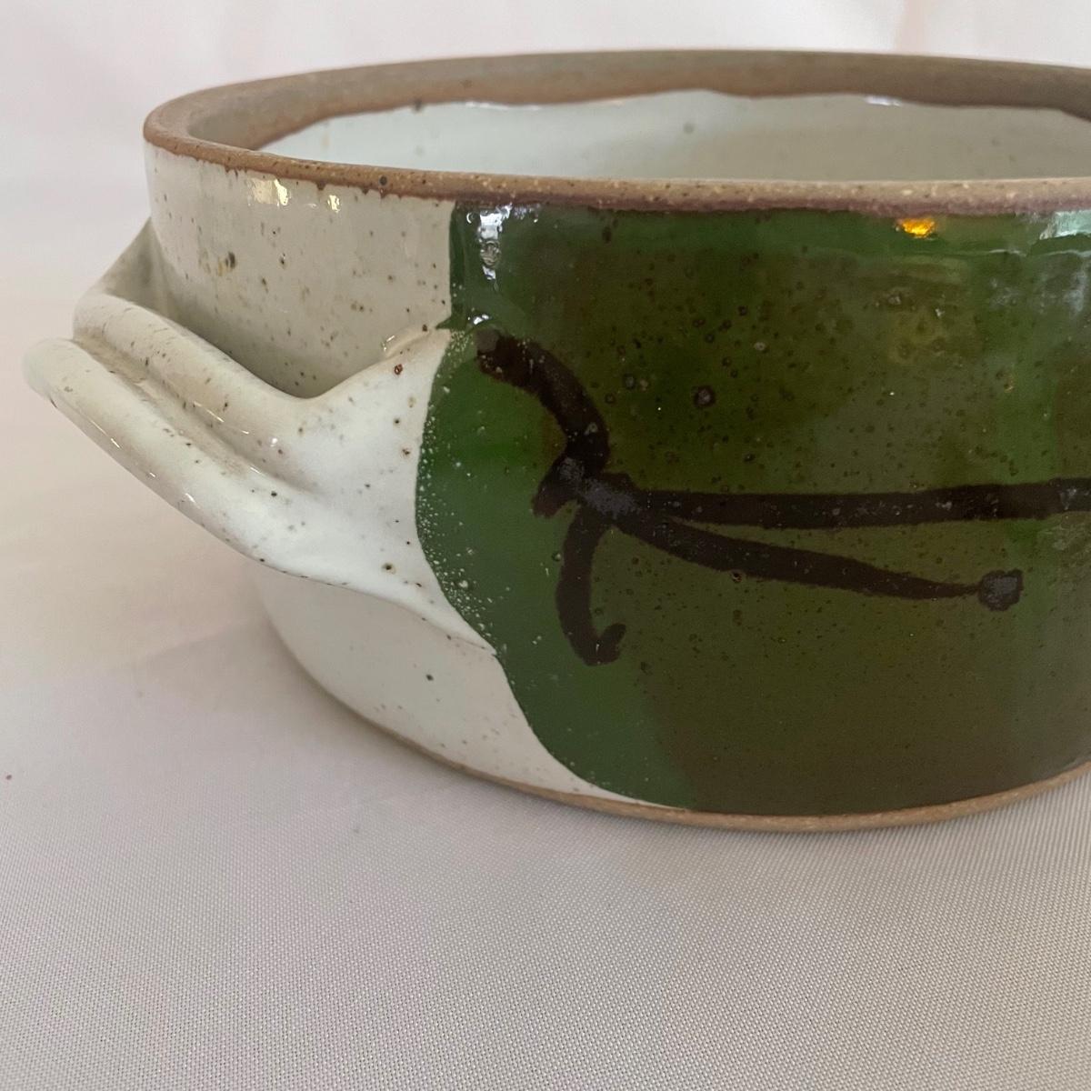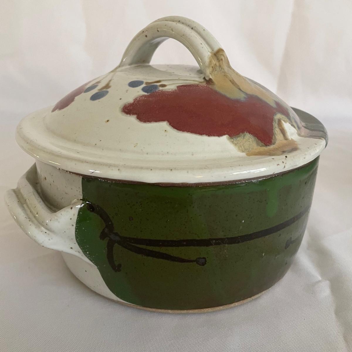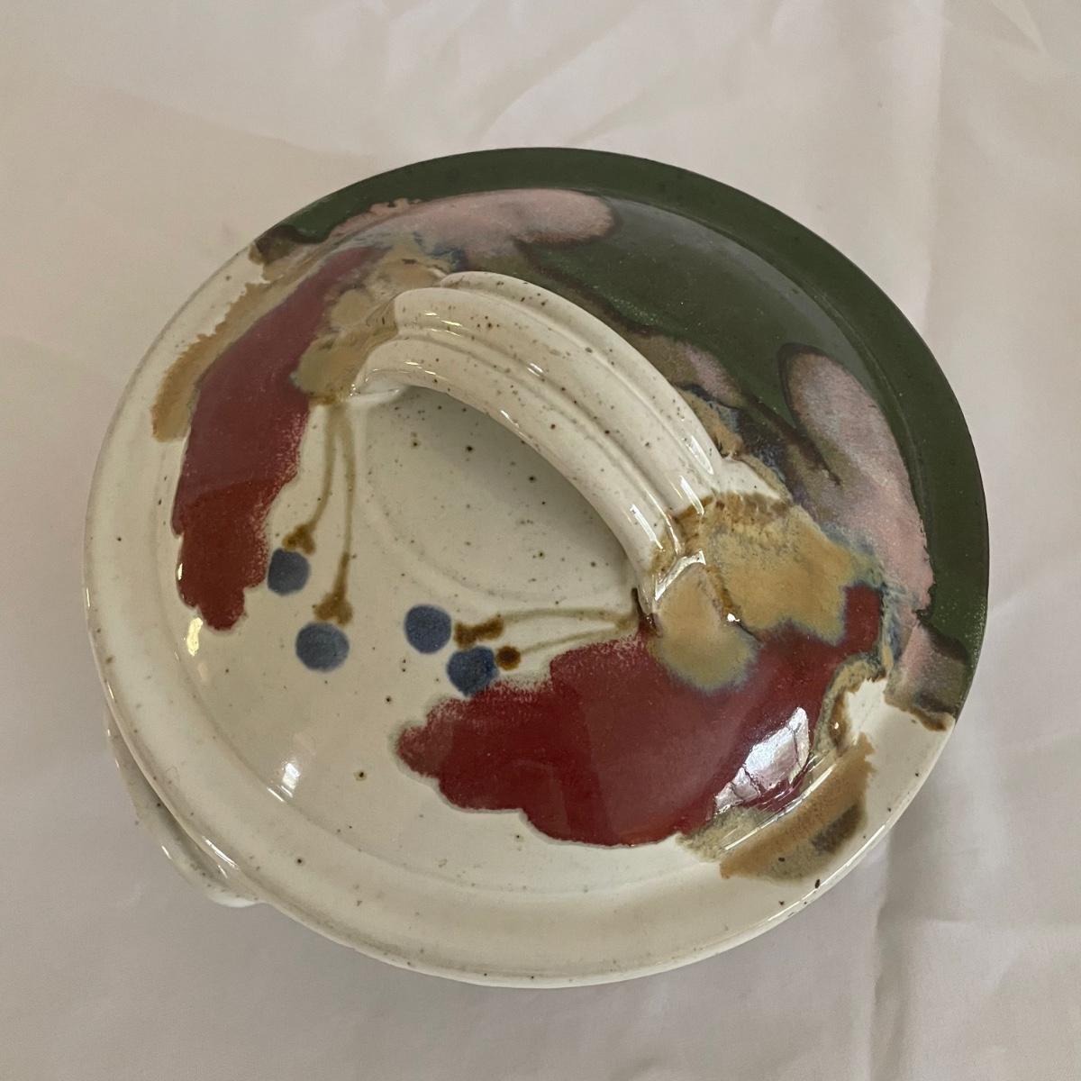 Lidded dish measures 7.5” d x 8” tall (measured to handle of lid)