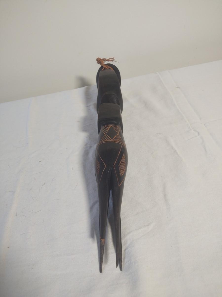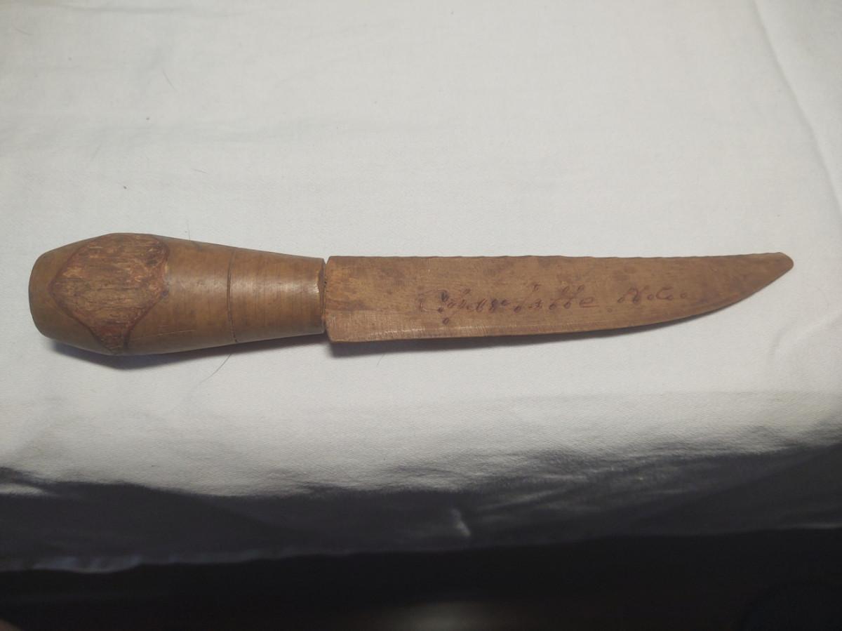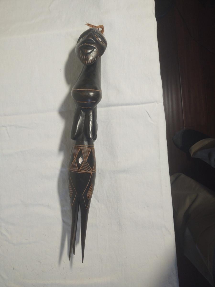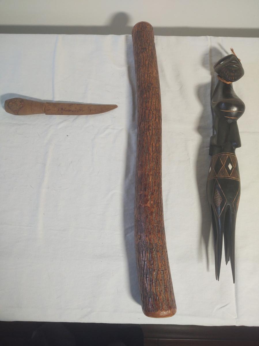 Knife is 8" and made in Charlotte, NC. Club is 20" long and very heavy. Carving is 16" tall and has one broken leg.